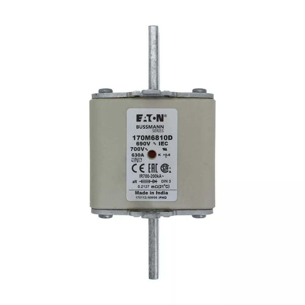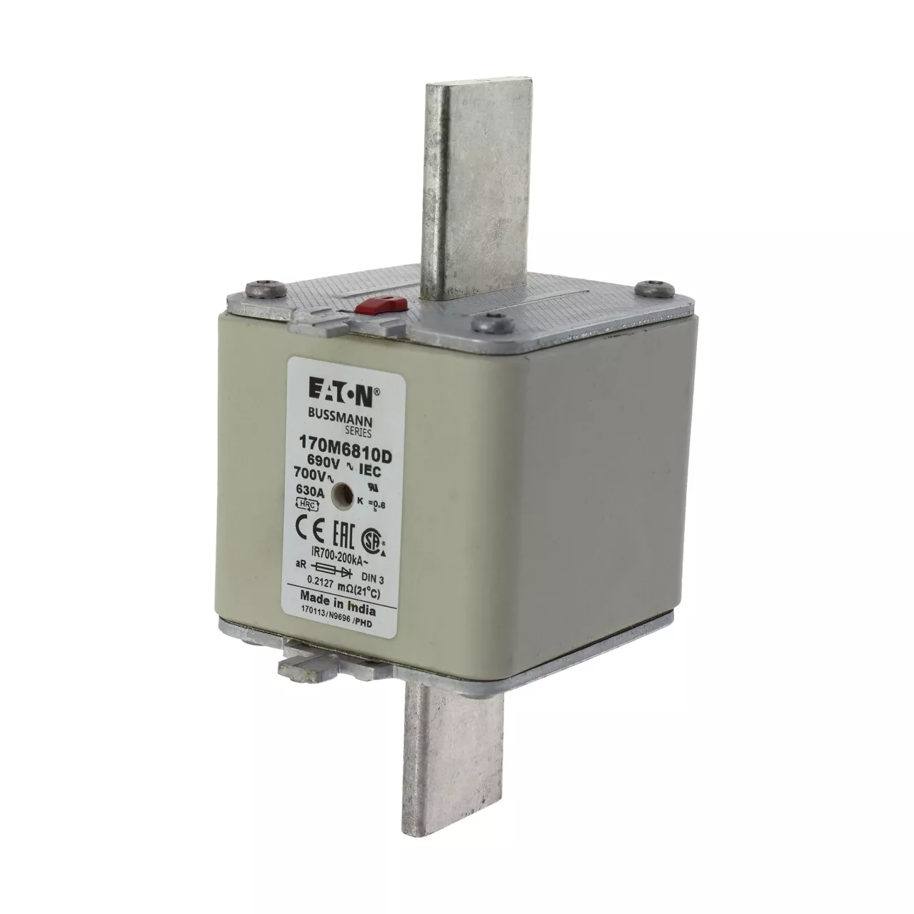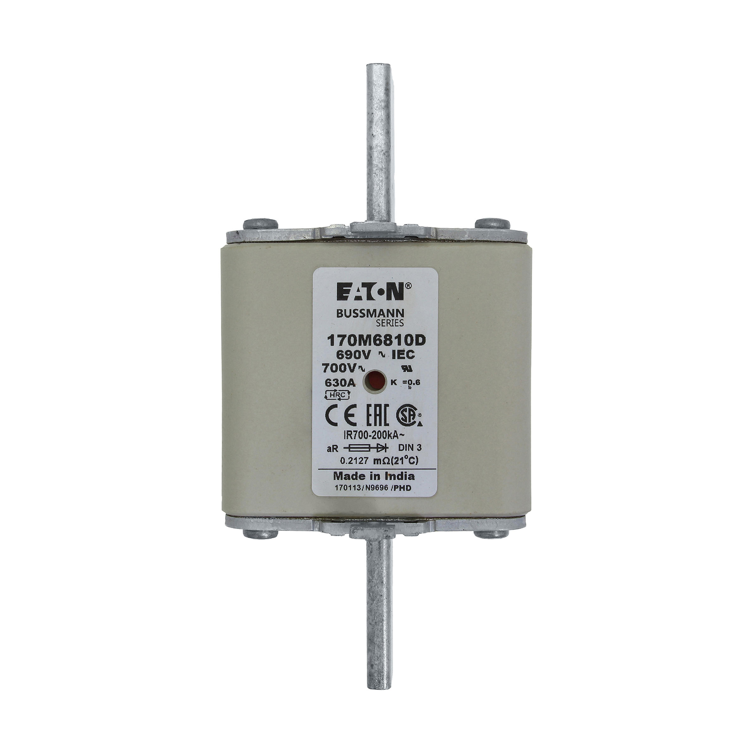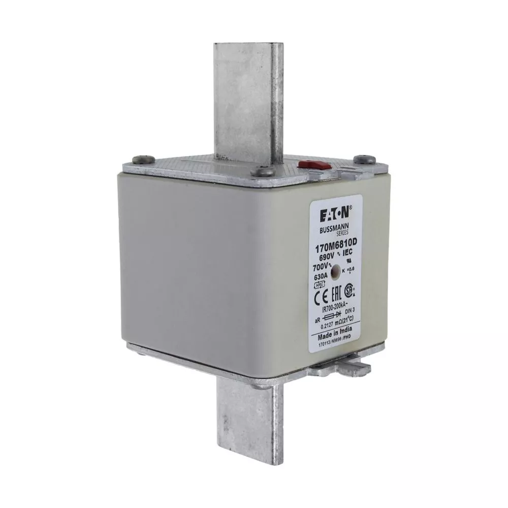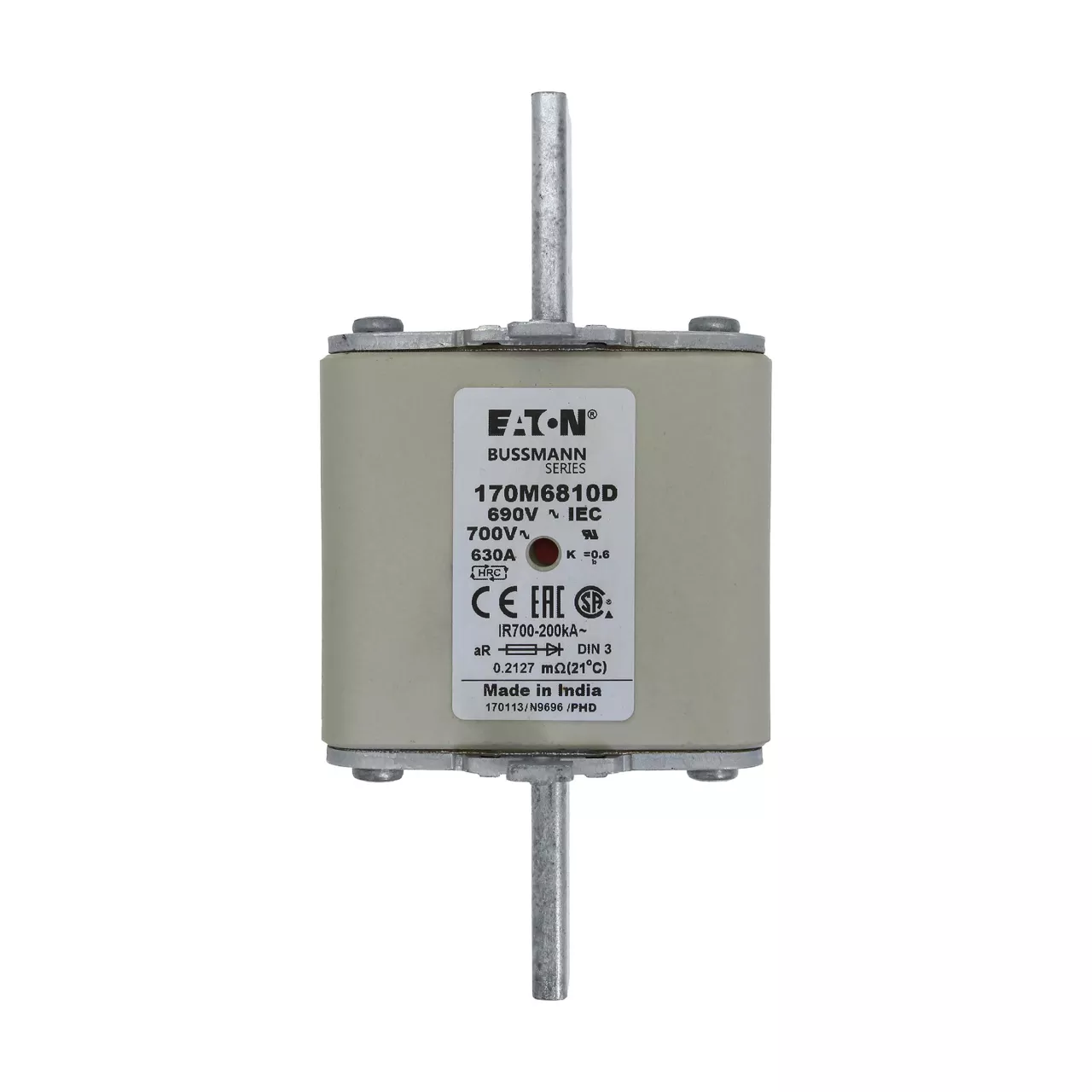 170M6810D Wkładka szybka, 630 A, AC 690 V, DIN 3, aR, DIN, IEC, podwójny wskaźnik, nieizolowane uchwyty