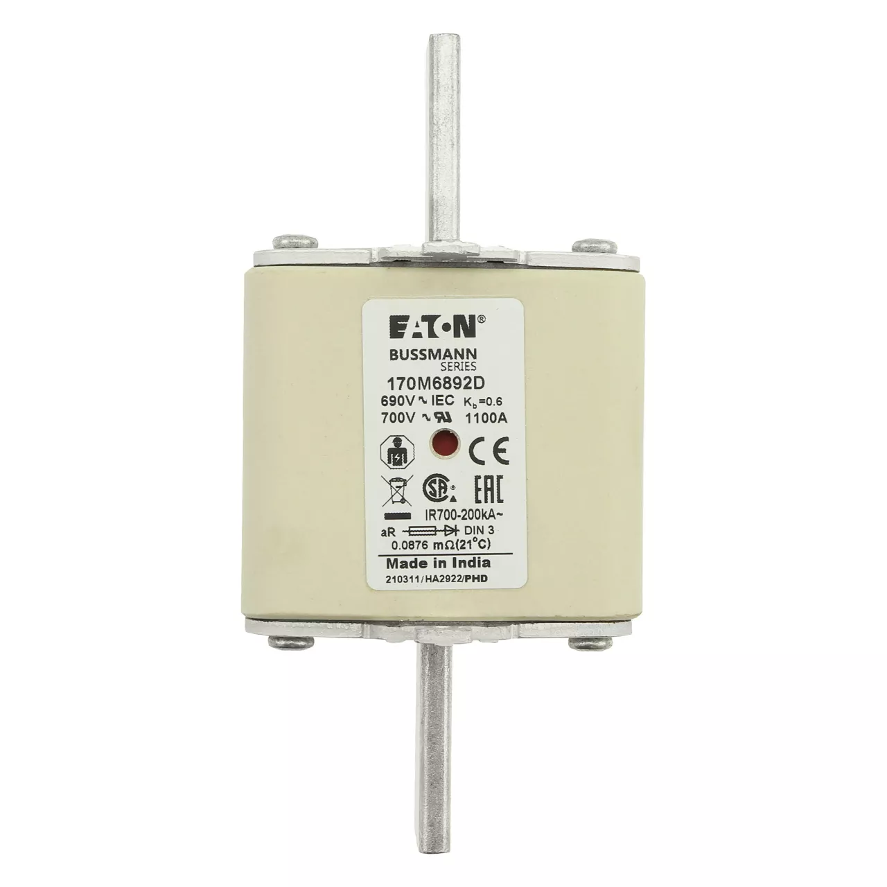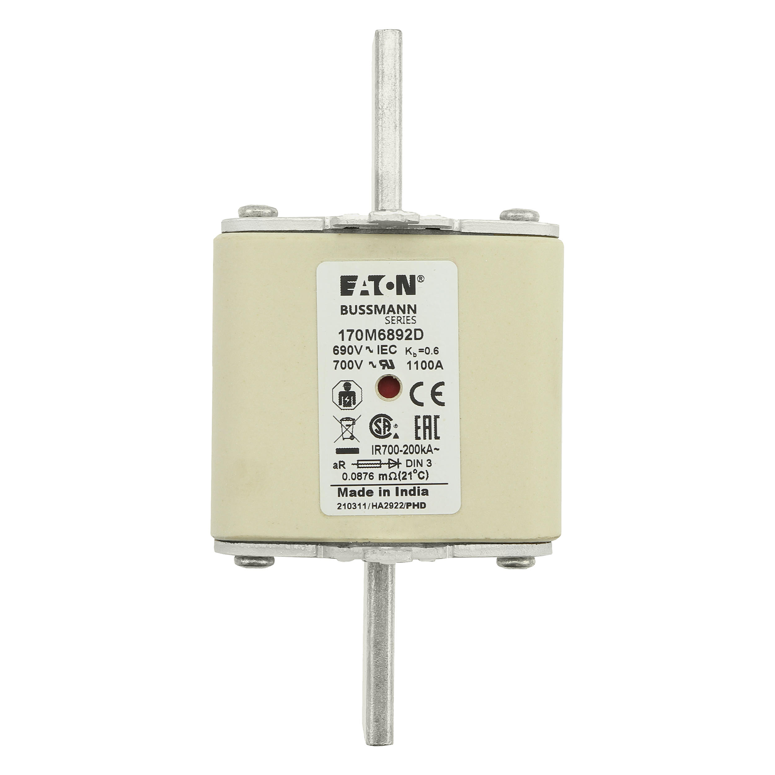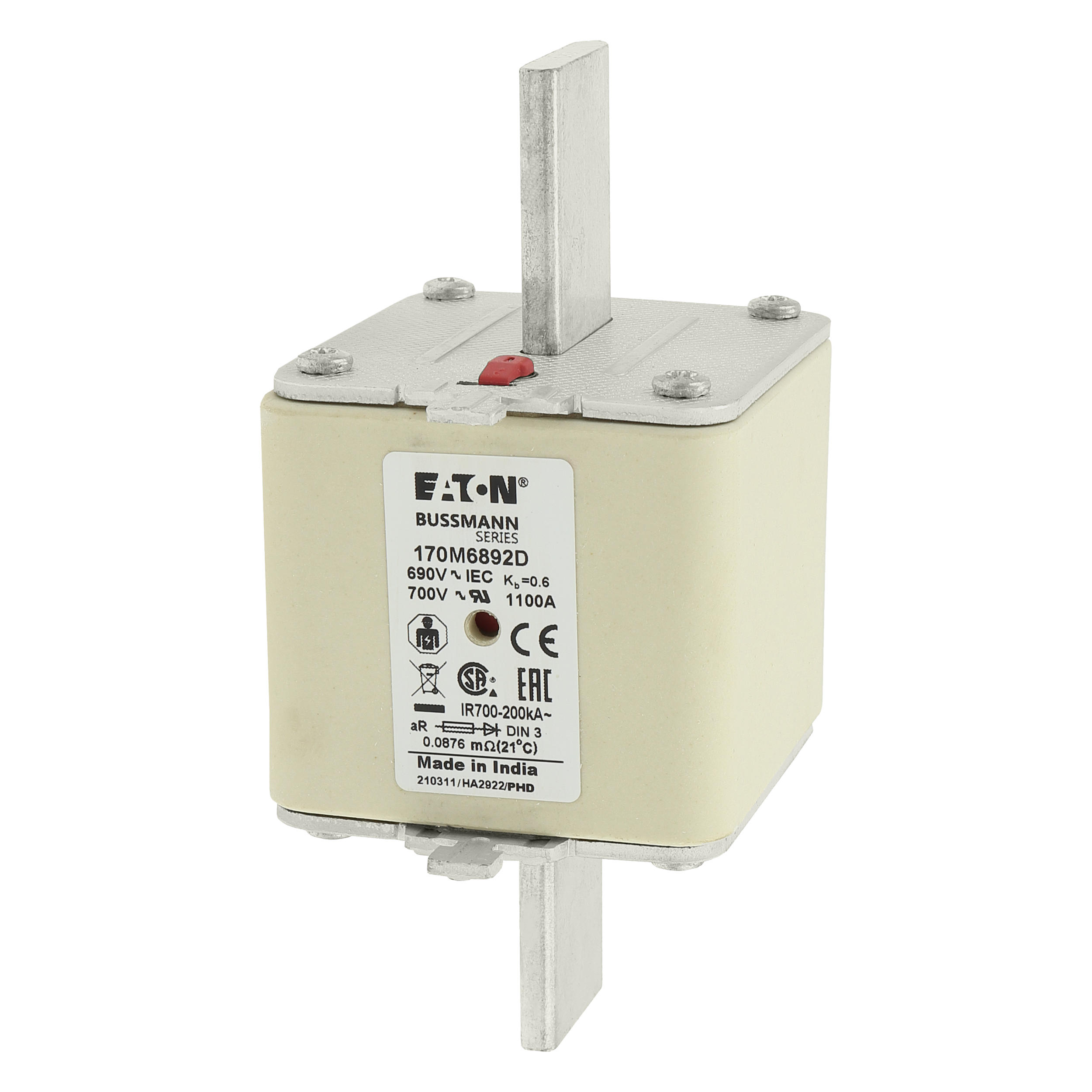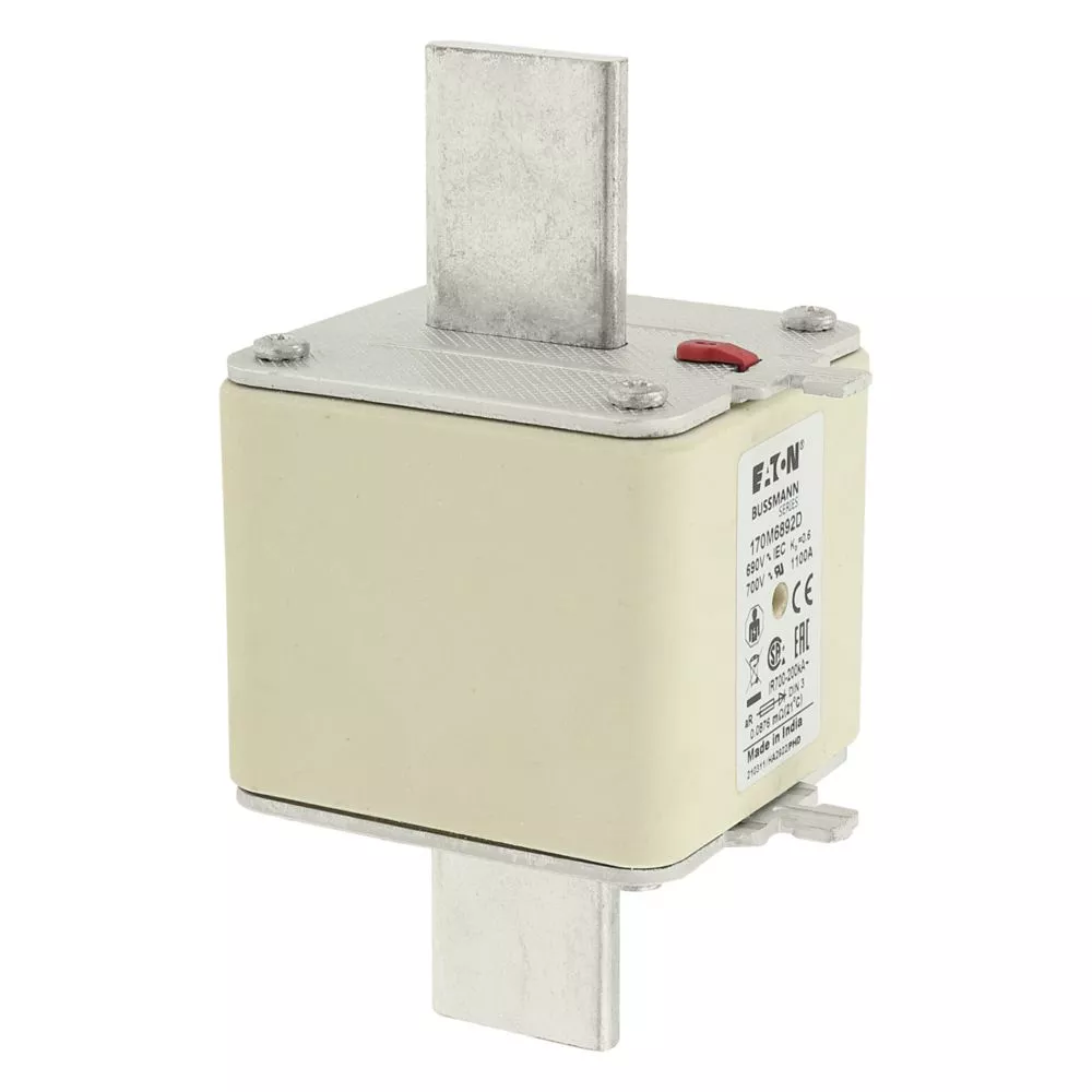 170M6892D Wkładka szybka, 1100 A, AC 690 V, DIN 3, aR, DIN, IEC, podwójny wskaźnik, nieizolowane uchwyty
