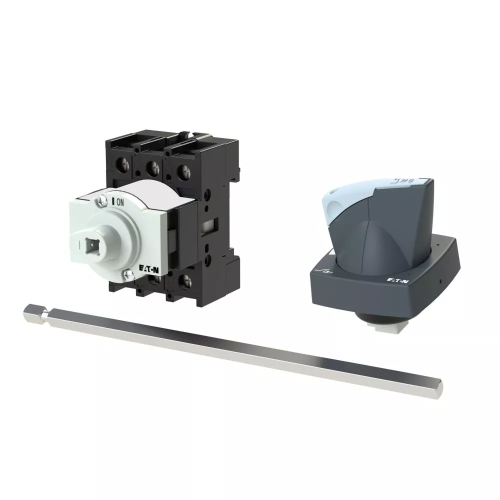P1-25/M4/K1-PG Rozłącznik główny, 3 bieg., 25 A, funkcja awaryjnego zatrzymania , blok. na kłódkę w pozycji Wył., z 400 mm metalową osią, montaż rozłączny, pokrętło K1 szare z blokadą na kłódkę