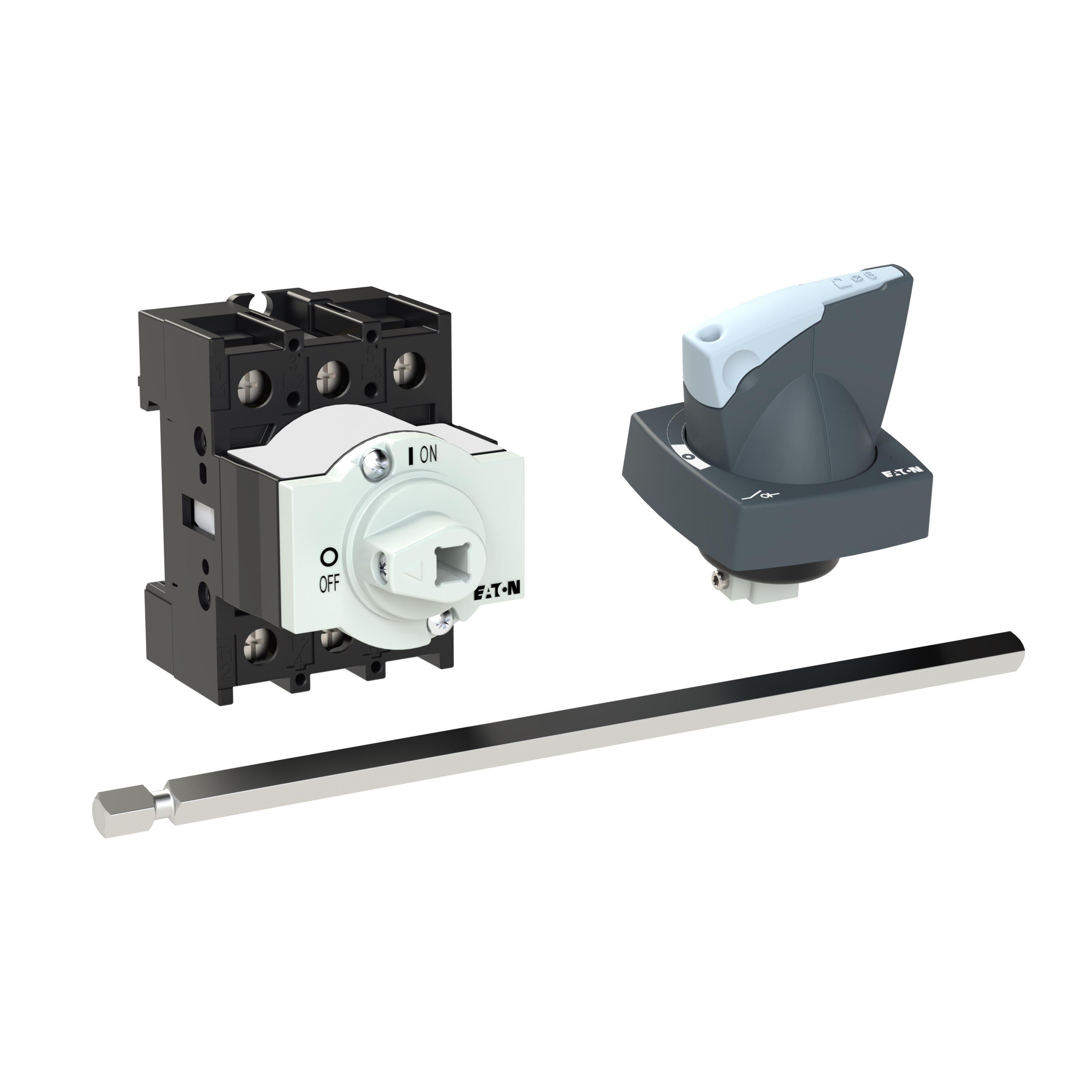 Wyłącznik główny, P1, Znamionowy prąd ciągły (Iu): 25 A, Funkcje: Z mechanizmem ryglującym, Funkcja STOP, Wyposażone w: Czarny uchwyt obrotowy i pierścień blokujący, Metalowa oś do rozdzielnic o głębokości 400 mm, Sposób montażu: Montaż na panelu tylnym, Liczba biegunów: Trzybiegunowy, Element blokujący: Możliwość zablokowania w położeniu 0 (Wył.), Stopień ochrony: NEMA 12