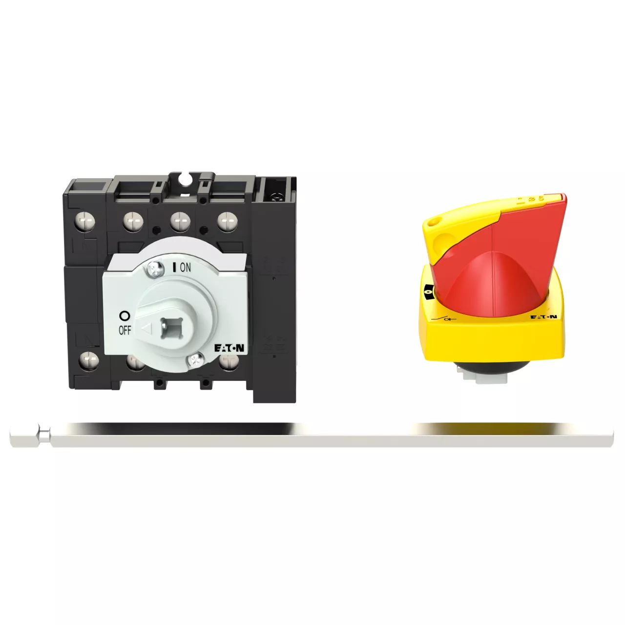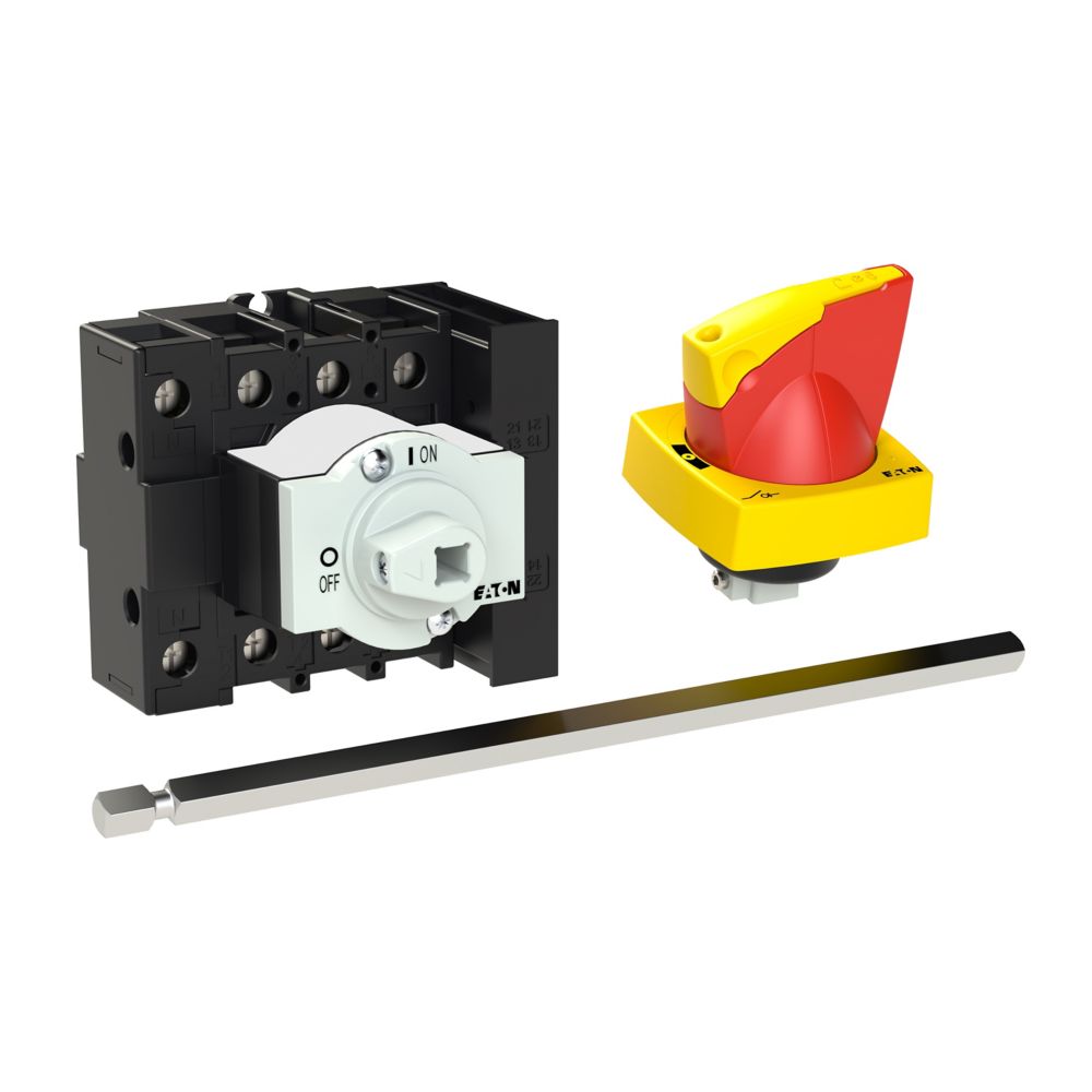 Wyłącznik główny, P1, Znamionowy prąd ciągły (Iu): 32 A, Funkcje: Z mechanizmem ryglującym, Funkcja wyłączania awaryjnego, Wyposażone w: Czerwony uchwyt obrotowy i żółty pierścień blokujący, Metalowa oś do rozdzielnic o głębokości 400 mm, Sposób montażu: Montaż na panelu tylnym, Liczba biegunów: Czterobiegunowy, Element blokujący: Możliwość zablokowania w położeniu 0 (Wył.), Stopień ochrony: NEMA 12