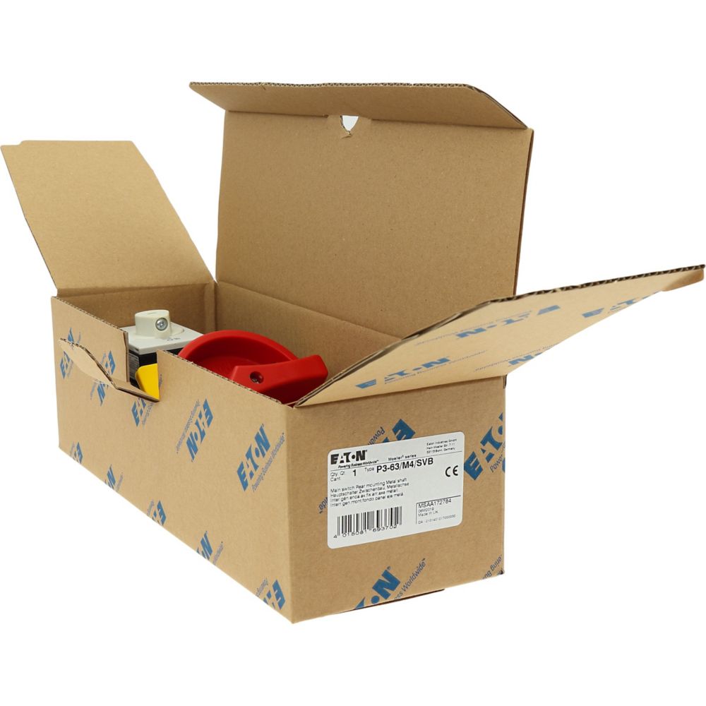 P3-63/M4/SVB Rozłącznik główny, 3 bieg., 63 A, funkcja awaryjnego zatrzymania, blok. na kłódkę w pozycji Wył., z 400 mm metalową osią, montaż rozłączny, pokrętło czerwono-żółte z blokadą na kłódkę