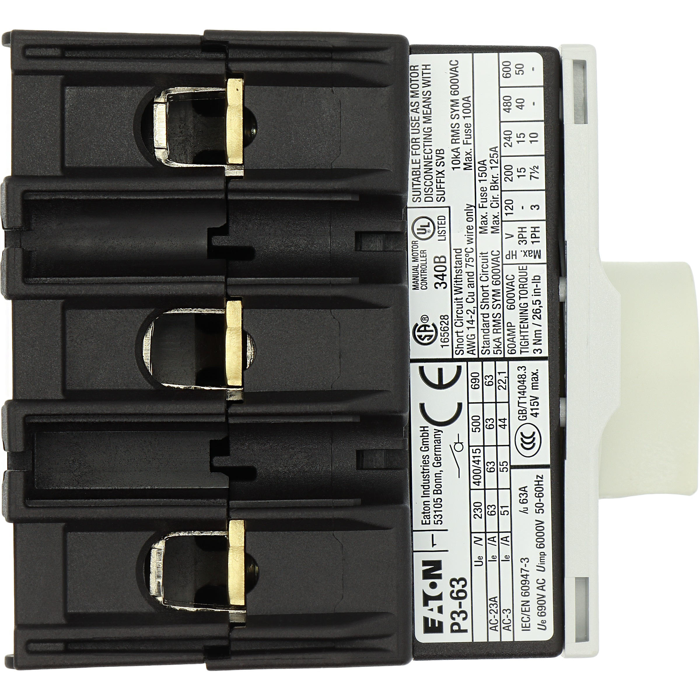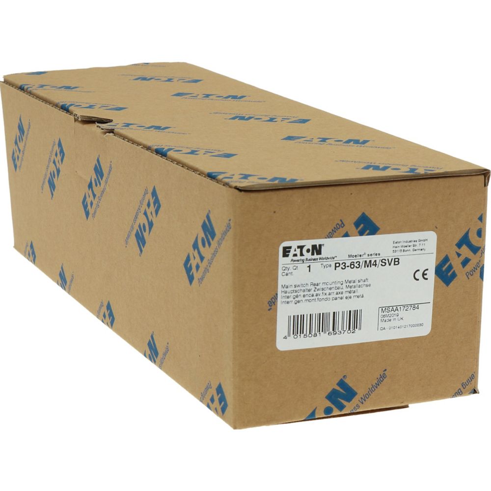 Wyłącznik główny, Zacisk śrubowy: Wyłącznik główny, wyłącznik serwisowy, Odniesienie do grupy części: P3, Funkcja zatrzymania: Funkcja wyłączania awaryjnego, z czerwonym uchwytem obrotowym i żółtym pierścieniem blokującym, Uwagi: Uchwyt do stosowania tylko z przedłużeniem osi P1/P3-400 (172844)., Uwagi: Z metalowym wałkiem do rozdzielnic o głębokości 400 mm, Informacje dotyczące dostarczonego sprzętu: Styk pomocniczy lub zaciski przewodu neutralnego montowane przez użytkownika., 3-biegunowy, Element blokujący: Możliwość zablokowania w położeniu 0 (Wył.), Stopień ochrony: Przód IP65, Projekt: montaż na panelu tylnym, Moc znamionowa AC-23A, 50 - 60 Hz 400 V: P = 30 kW, Znamionowy prąd ciągły: Iu = 63 A
