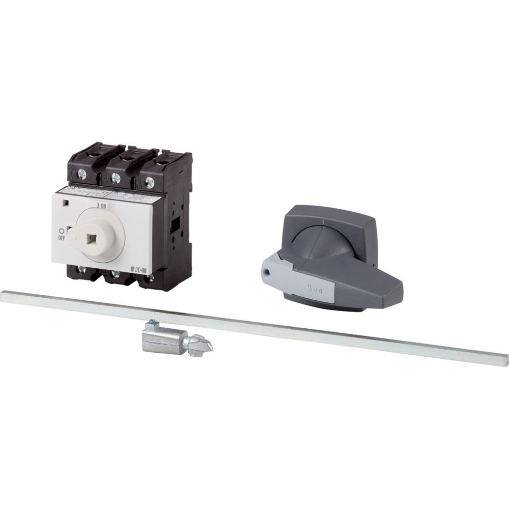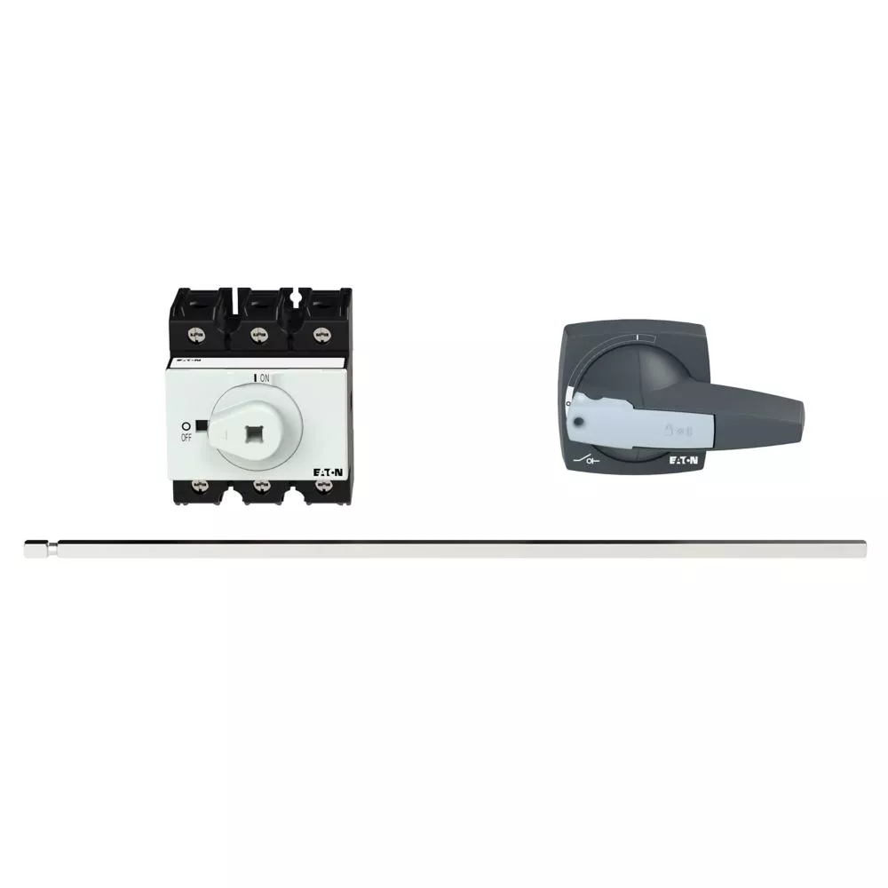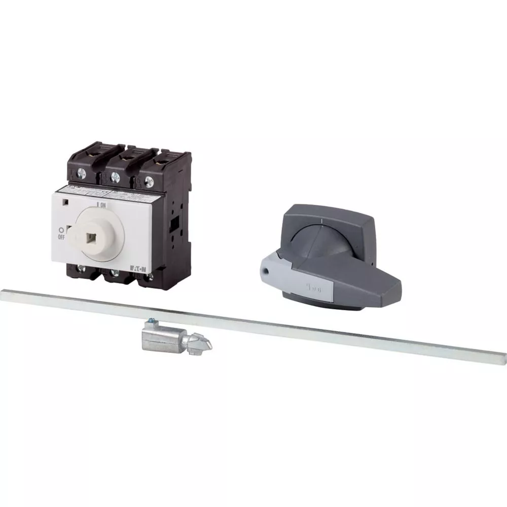 P3-63/M4/K2-PG Rozłącznik główny, 3 bieg., 63 A, funkcja awaryjnego zatrzymania , blok. na kłódkę w pozycji Wył., z 400 mm metalową osią, montaż rozłączny, pokrętło K2 szare z blokadą na kłódkę