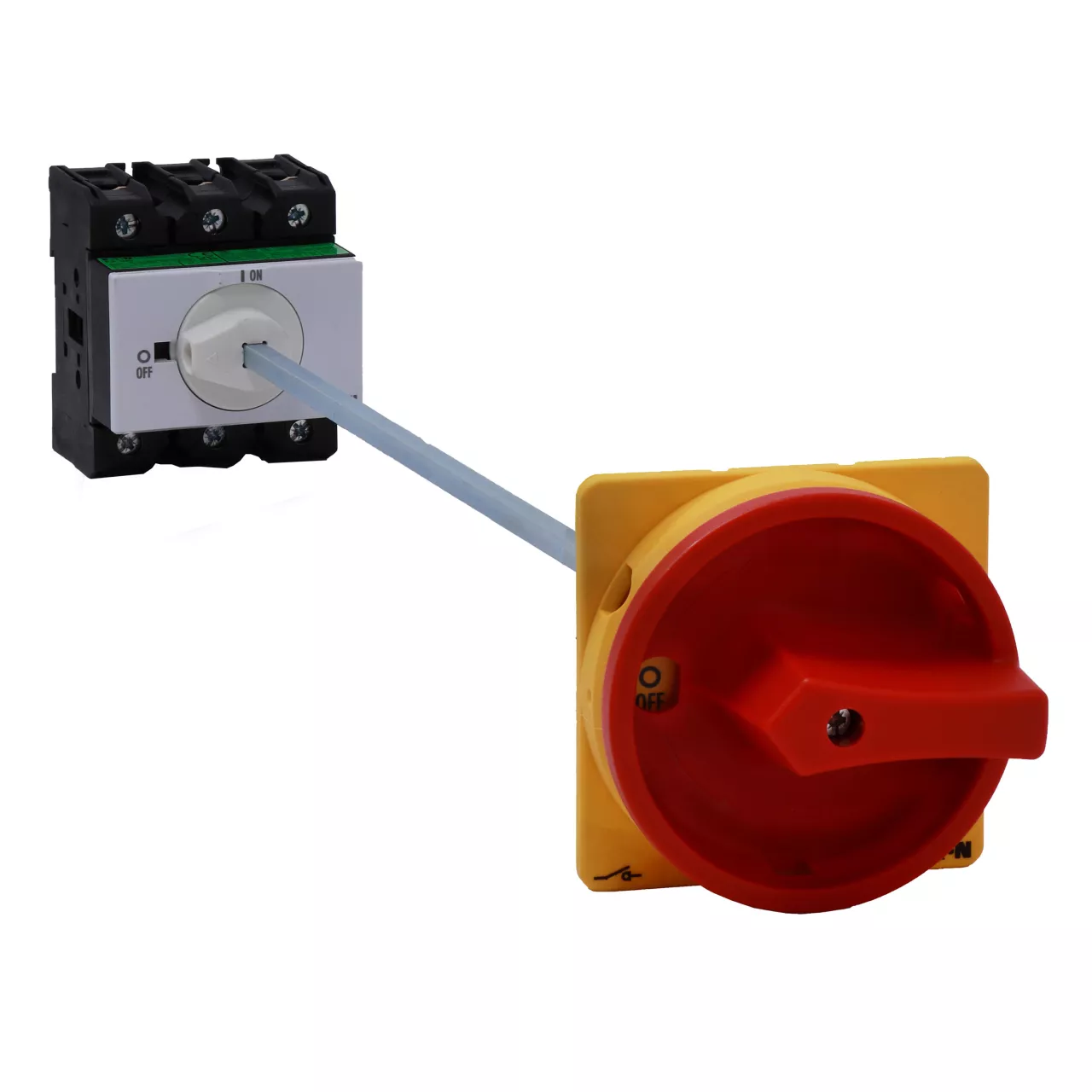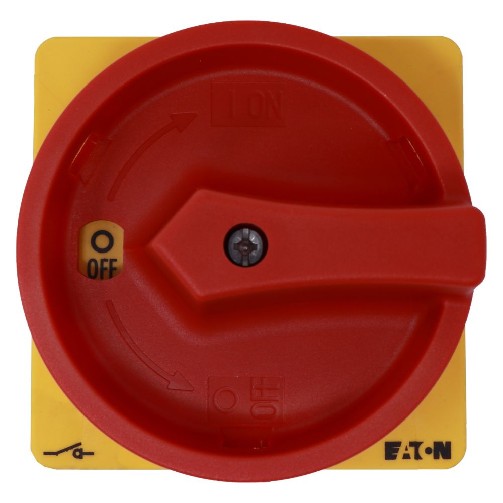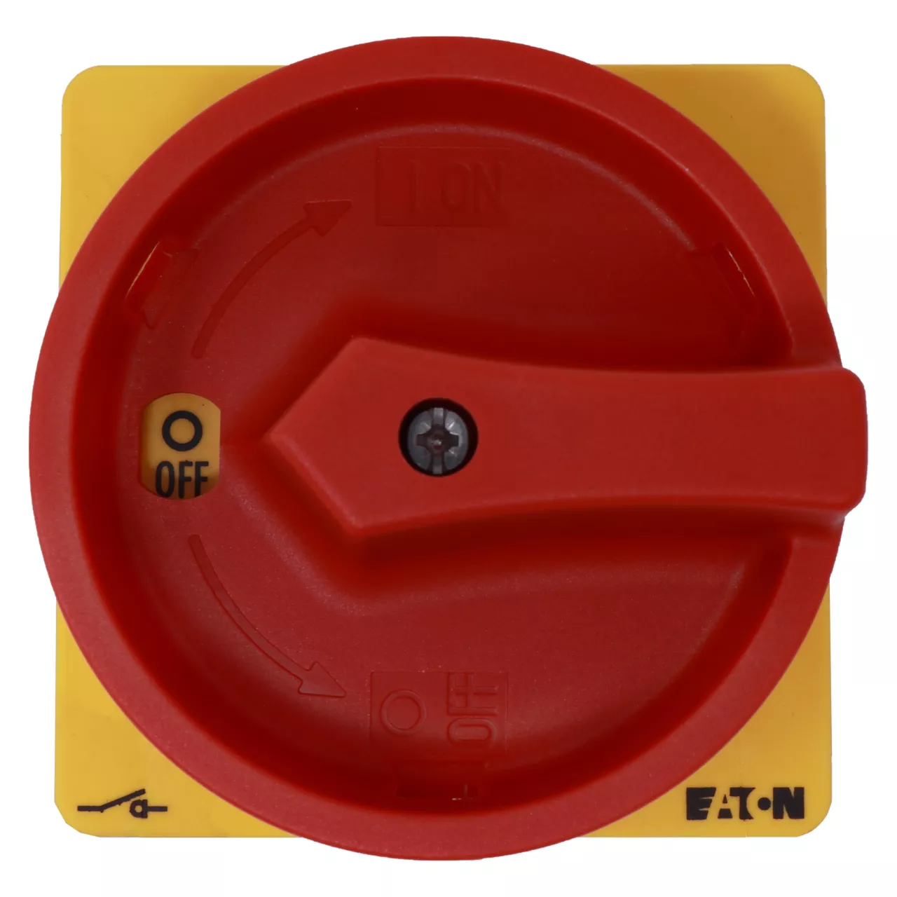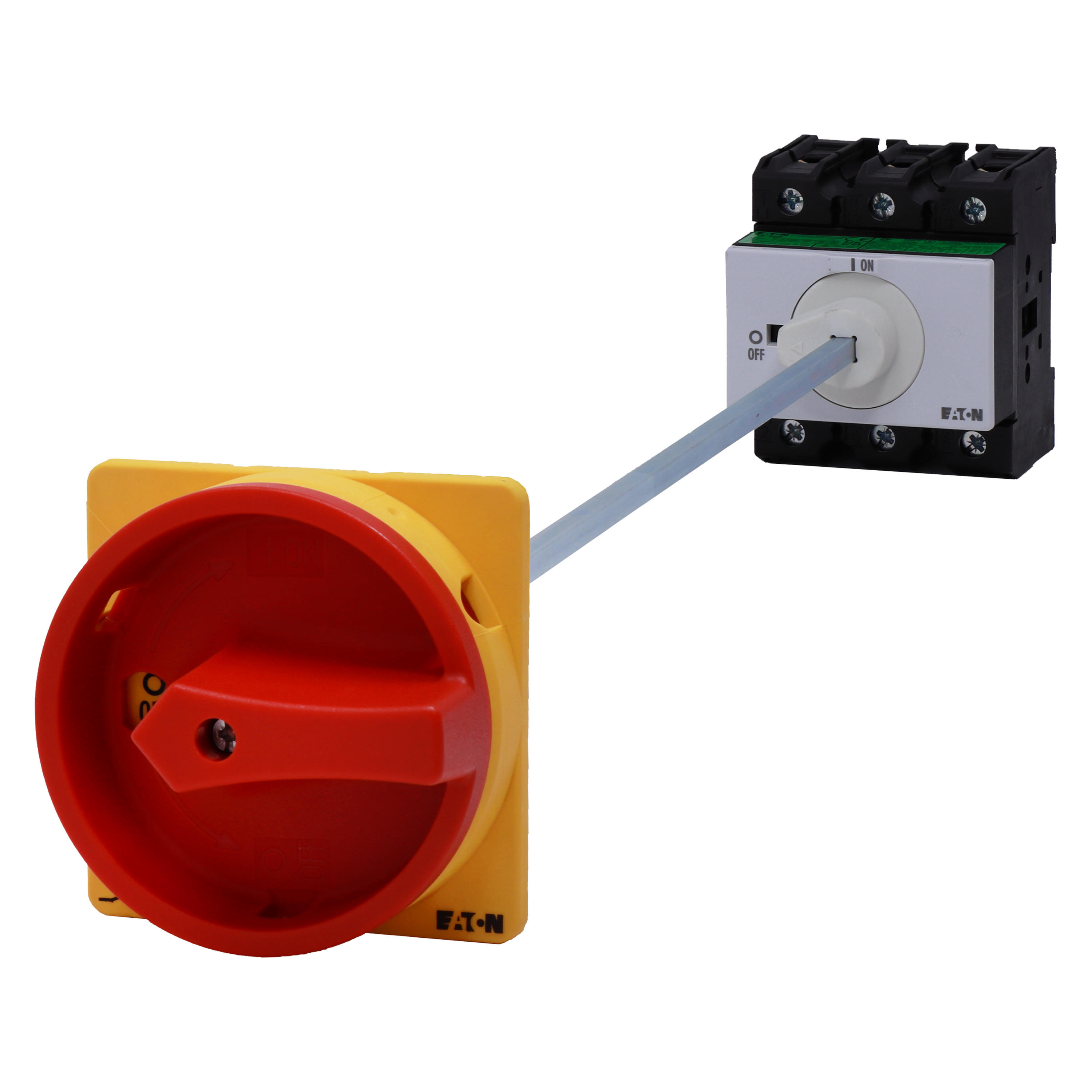 P3-100/M4/SVB Rozłącznik główny, 3 bieg., 100 A, funkcja awaryjnego zatrzymania, blok. na kłódkę w pozycji Wył., z 400 mm metalową osią, montaż rozłączny, pokrętło czerwono-żółte z blokadą na kłódkę