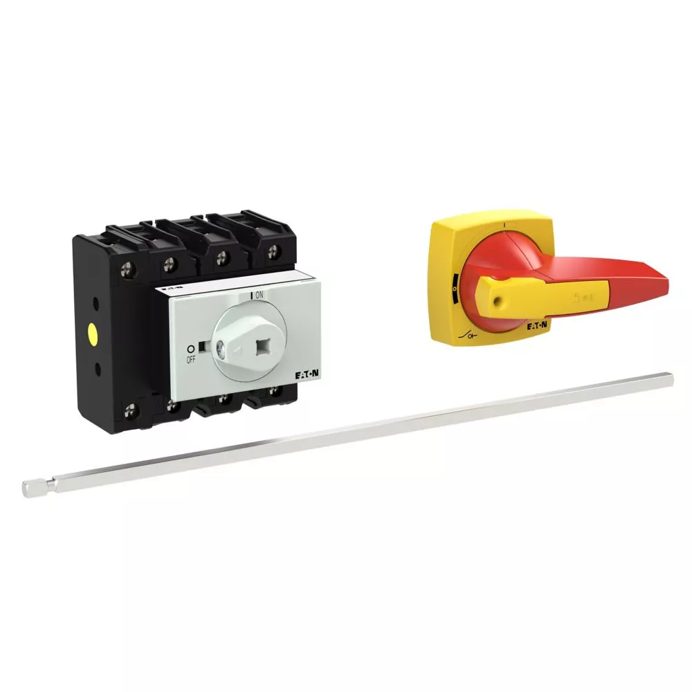 P3-100/M4/N/K2-PR Rozłącznik główny, 3 bieg. + N, 100 A, funkcja awaryjnego zatrzymania, blok. na kłódkę w pozycji Wył., z 400 mm metalową osią, montaż rozłączny, pokrętło K2 czerwono-żółte z blokadą na kłódkę