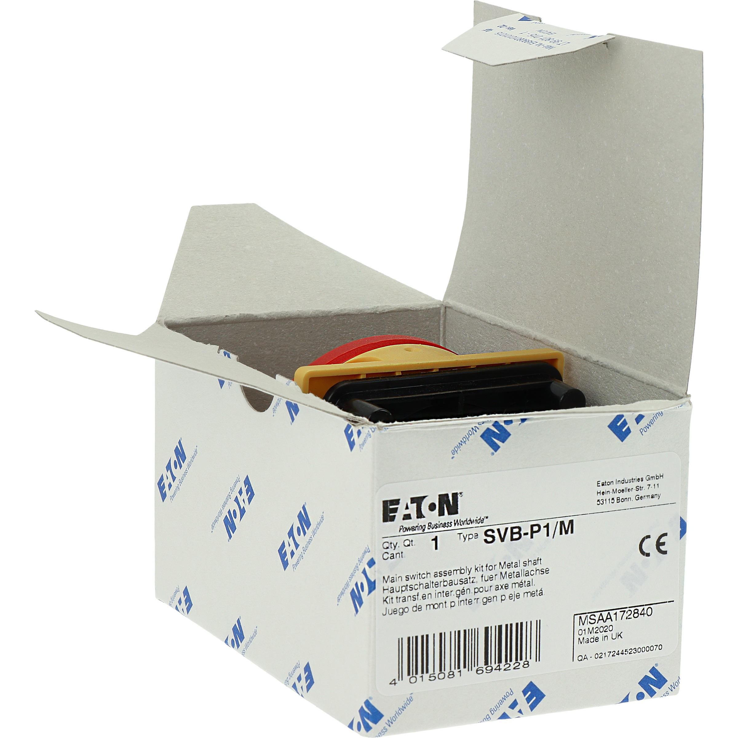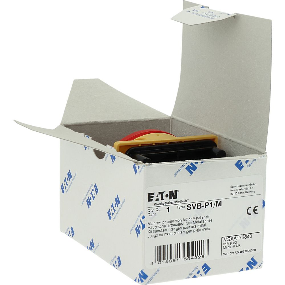 Uchwyt, Funkcja podstawowa: Zestawy montażowe, Funkcja: Zestawy zespołu wyłącznika głównego, tylko do wyłącznika głównego, Z funkcją blokowania kłódką, do blokowania położenia 0, możliwość zablokowania za pomocą maks. 3 kłódek, Do zastosowania z: P1…/M…, kolor czerwony/żółty, Typ z czerwonym uchwytem obrotowym i żółtym pierścieniem blokującym, Wyłączanie awaryjne/Zatrzymanie awaryjne: z funkcją wyłączania/zatrzymania awaryjnego, Kąt przełączania: 90 °