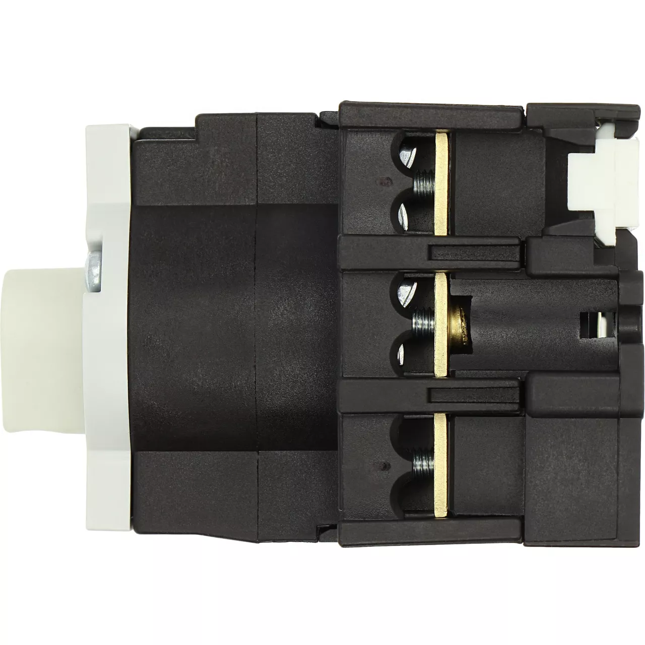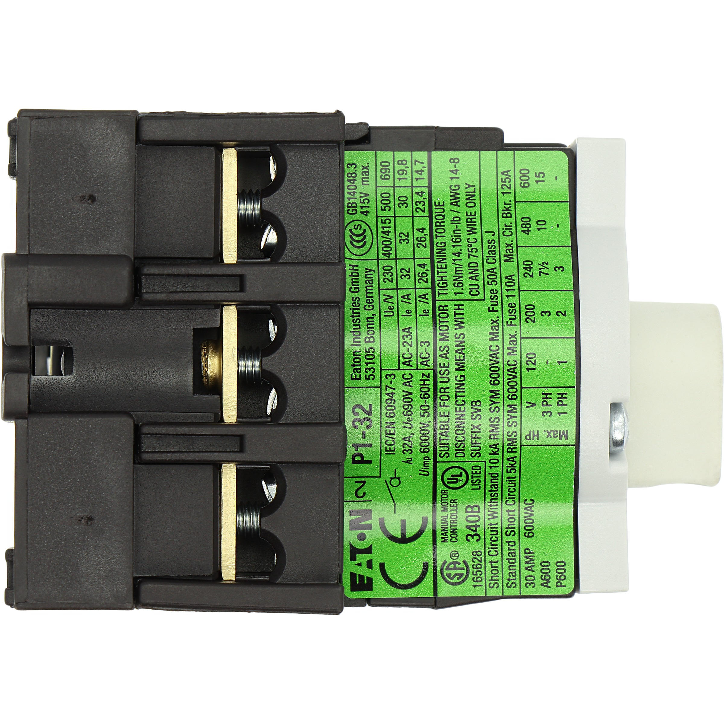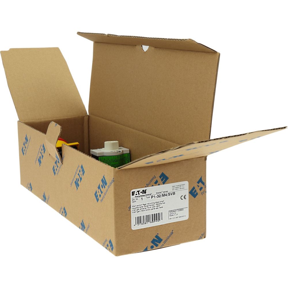 Wyłącznik główny, P1, Znamionowy prąd ciągły (Iu): 32 A, Funkcje: Z mechanizmem ryglującym, Funkcja wyłączania awaryjnego, Wyposażone w: Metalowa oś do rozdzielnic o głębokości 400 mm, Czerwony uchwyt obrotowy i żółty pierścień blokujący, Sposób montażu: Montaż na panelu tylnym, Liczba biegunów: Trzybiegunowy, Element blokujący: Możliwość zablokowania w położeniu 0 (Wył.), Stopień ochrony: NEMA 12