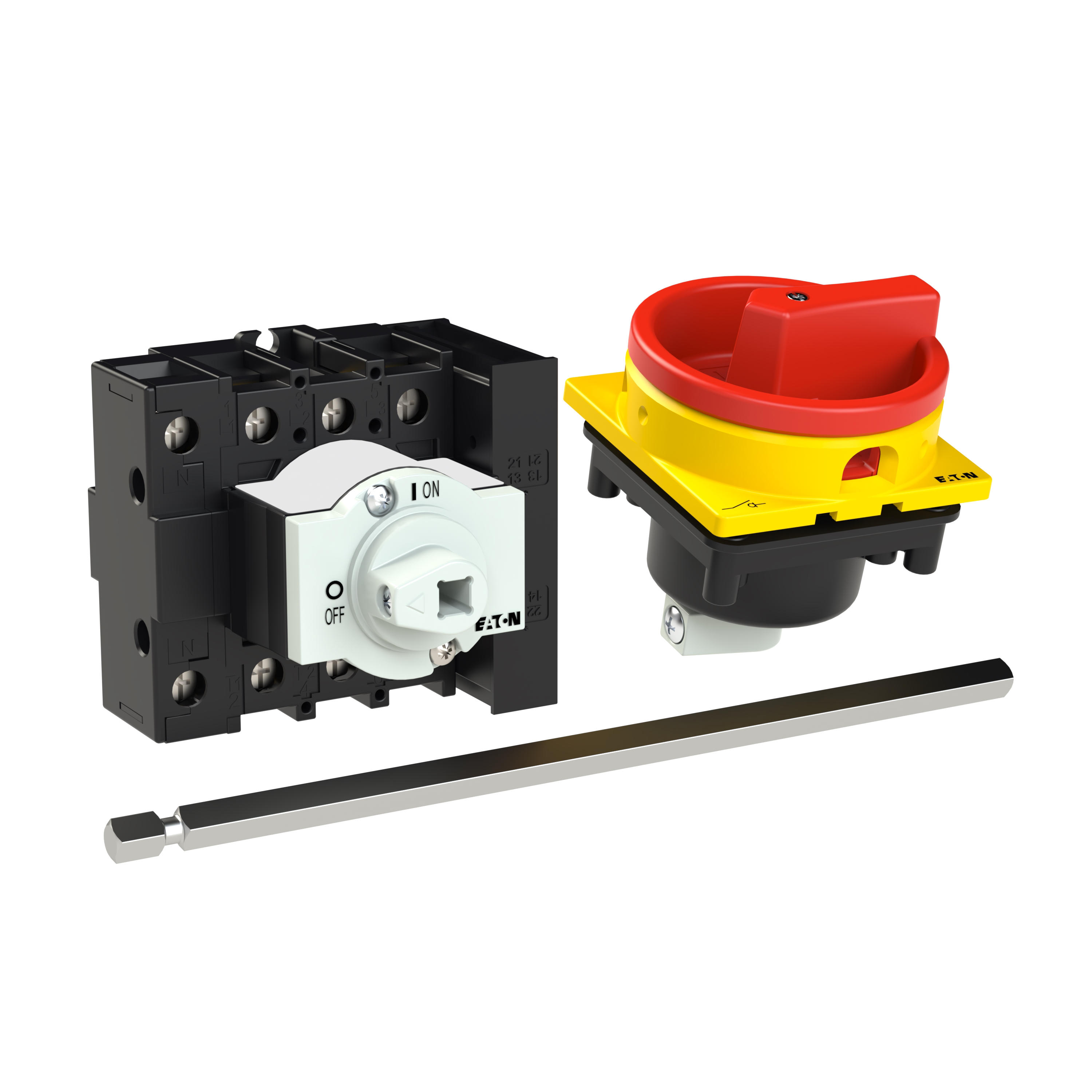 Wyłącznik główny, P1, Znamionowy prąd ciągły (Iu): 32 A, Funkcje: Funkcja wyłączania awaryjnego, Z mechanizmem ryglującym, Wyposażone w: Metalowa oś do rozdzielnic o głębokości 400 mm, Czerwony uchwyt obrotowy i żółty pierścień blokujący, Sposób montażu: Montaż na panelu tylnym, Liczba biegunów: Czterobiegunowy, Element blokujący: Możliwość zablokowania w położeniu 0 (Wył.), Stopień ochrony: NEMA 12