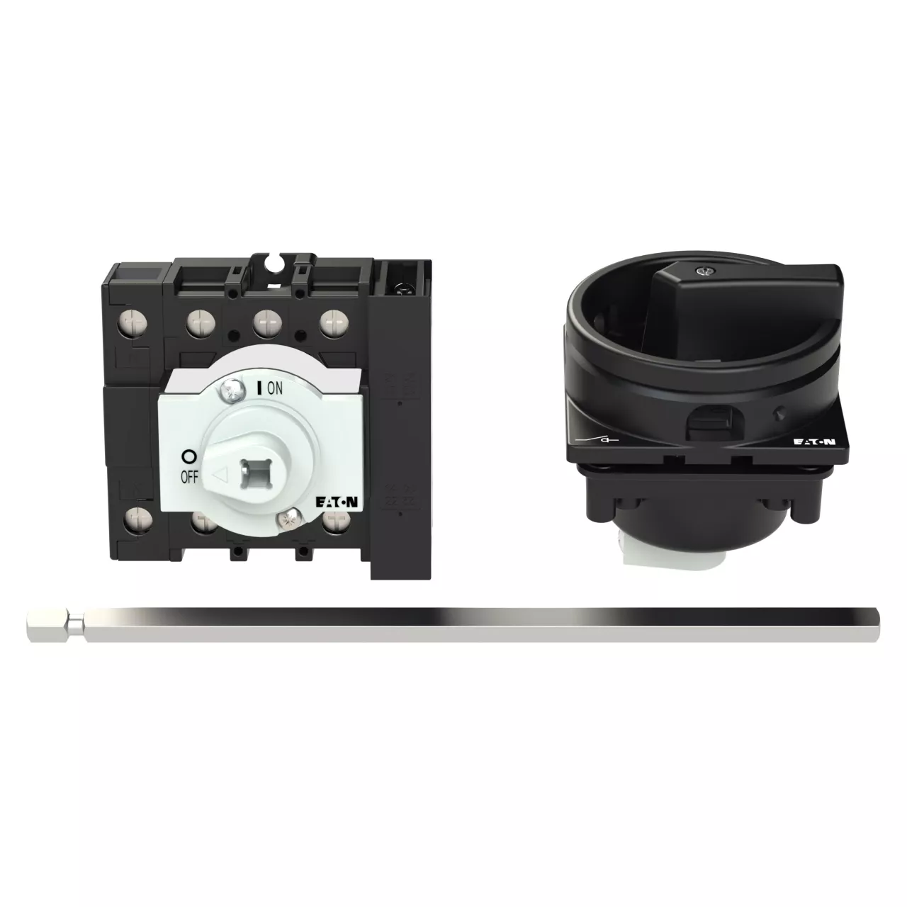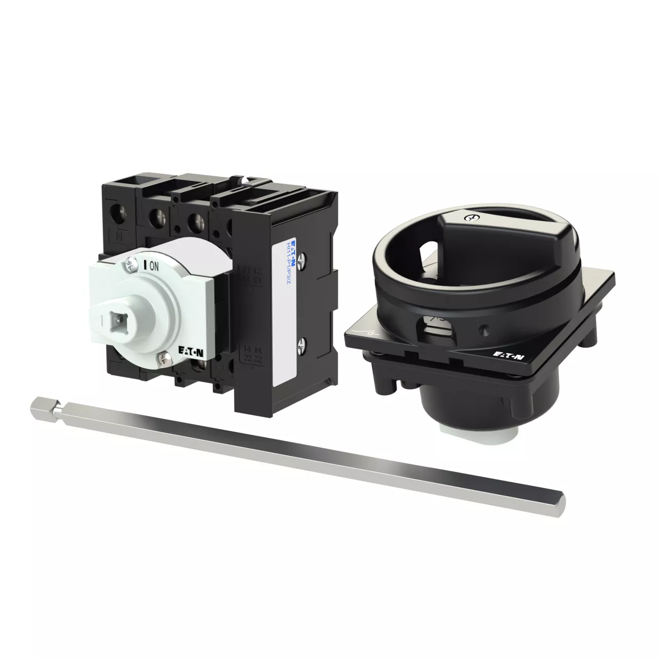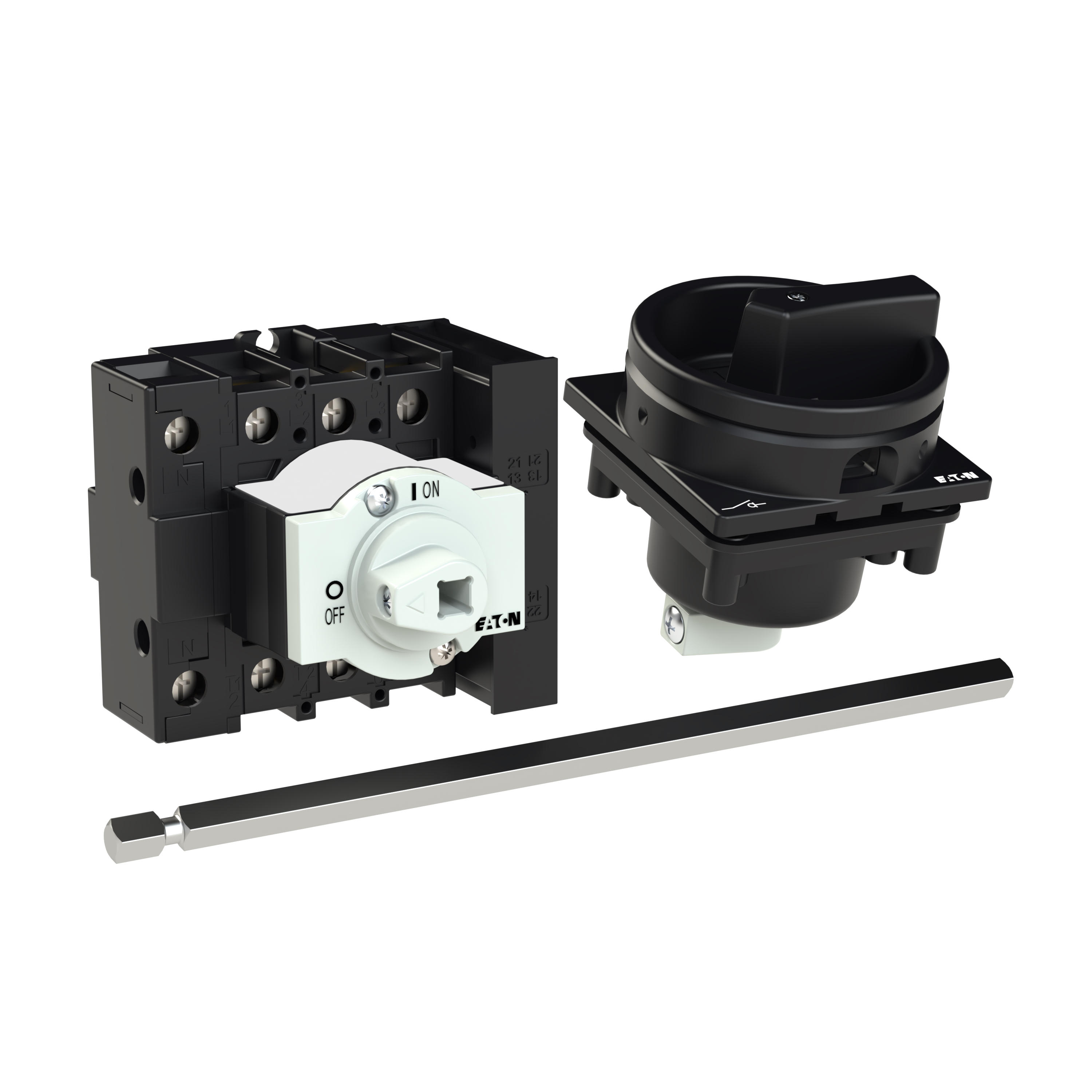 Wyłącznik główny, P1, Znamionowy prąd ciągły (Iu): 32 A, Funkcje: Z mechanizmem ryglującym, Funkcja STOP, Wyposażone w: Metalowa oś do rozdzielnic o głębokości 400 mm, Czarny uchwyt obrotowy i pierścień blokujący, Sposób montażu: Montaż na panelu tylnym, Liczba biegunów: Czterobiegunowy, Element blokujący: Możliwość zablokowania w położeniu 0 (Wył.), Stopień ochrony: NEMA 12