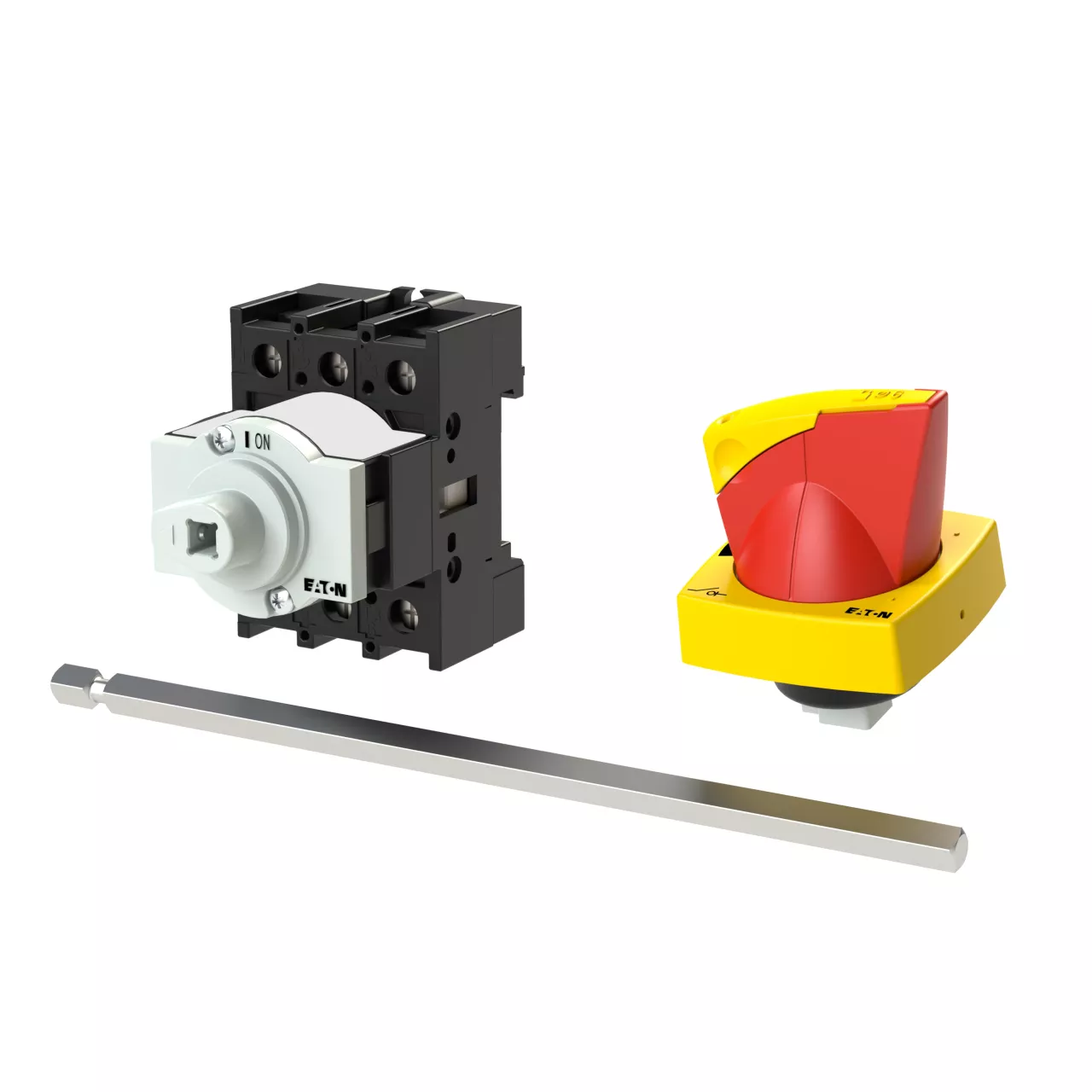 Wyłącznik główny, P1, Znamionowy prąd ciągły (Iu): 32 A, Funkcje: Z mechanizmem ryglującym, Funkcja wyłączania awaryjnego, Wyposażone w: Czerwony uchwyt obrotowy i żółty pierścień blokujący, Metalowa oś do rozdzielnic o głębokości 400 mm, Sposób montażu: Montaż na panelu tylnym, Liczba biegunów: Trzybiegunowy, Element blokujący: Możliwość zablokowania w położeniu 0 (Wył.), Stopień ochrony: NEMA 12