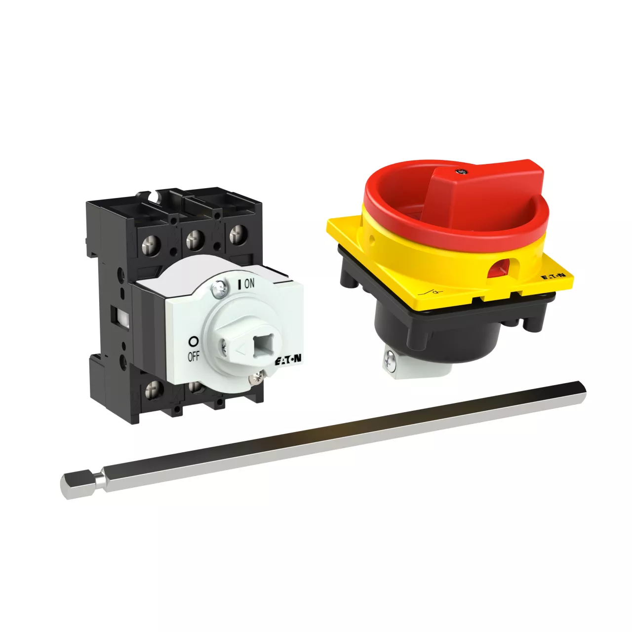 P1-25/M4/SVB Rozłącznik główny, 3 bieg., 25 A, funkcja awaryjnego zatrzymania, blok. na kłódkę w pozycji Wył., z 400 mm metalową osią, montaż rozłączny, pokrętło czerwono-żółte z blokadą na kłódkę