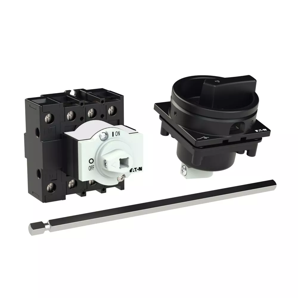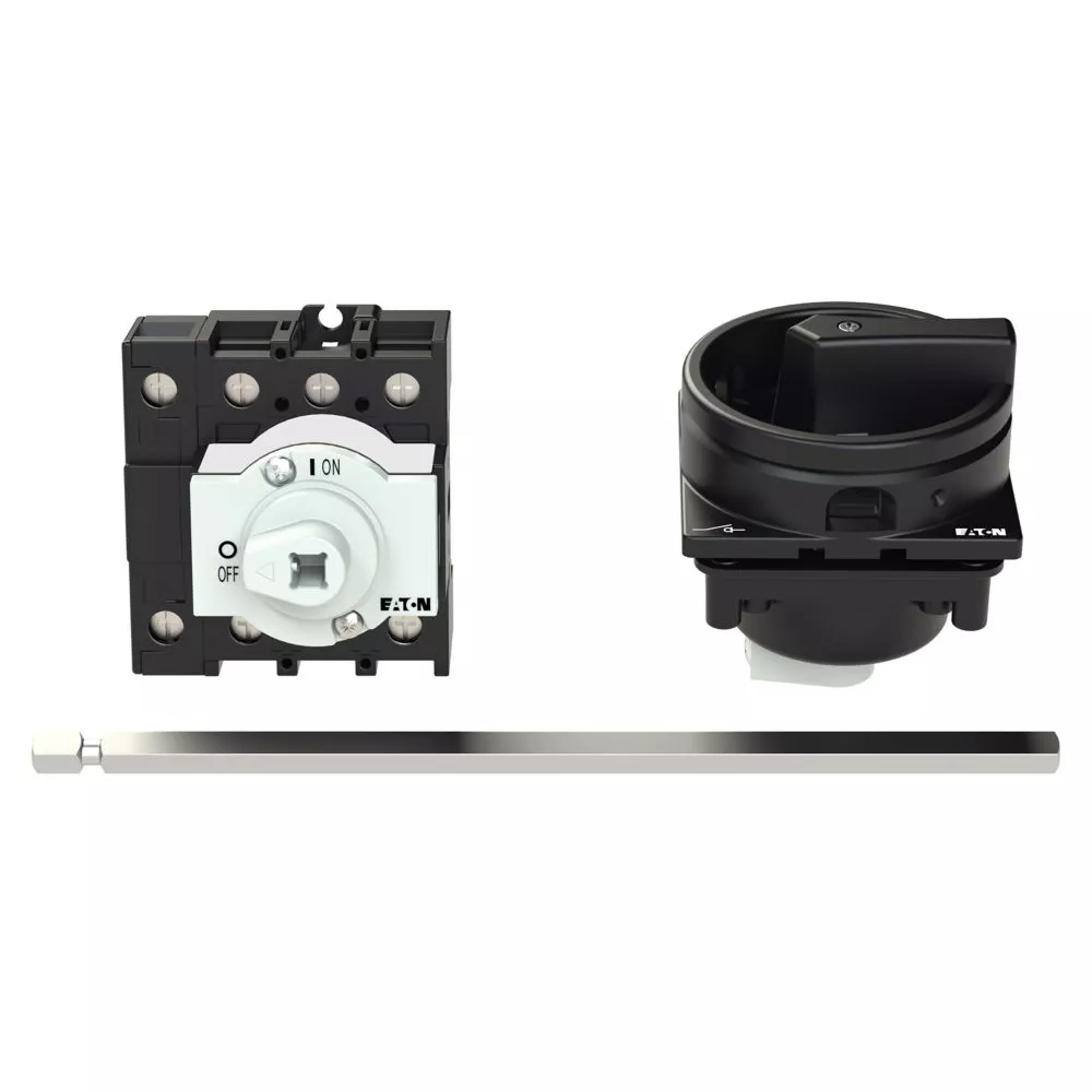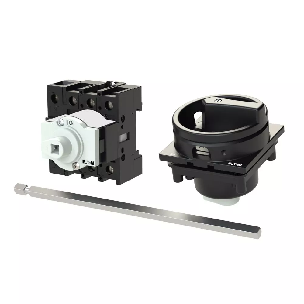 P1-25/M4/N/SVB-SW Rozłącznik główny, 3 bieg. + N, 25 A, funkcja awaryjnego zatrzymania , blok. na kłódkę w pozycji Wył., z 400 mm metalową osią, montaż rozłączny, pokrętło czarne z blokadą na kłódkę