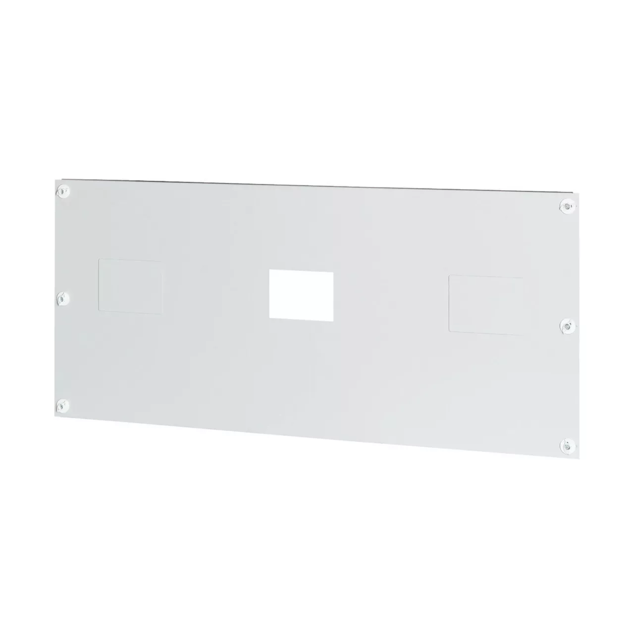 Frontplatte Mehrfachmontage für NZM3, BPZ-FP-NZM3X-...-MV, vertikal, Breite 1000 mm, Höhe 500mm, max. 3x NZM3 3-polig/3x NZM3 4-polig, Stahlblech, pulverbeschichtet, RAL 7035, mit Erdung verbundene Verschlüsse, vorbereitete Öffnungen in Frontplatte, ohne Montageplatte, enthält Blindplatten für nicht verwendete Öffnungen