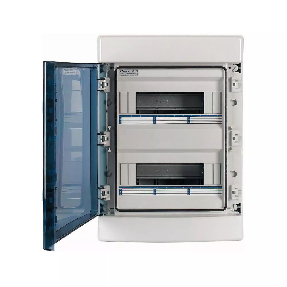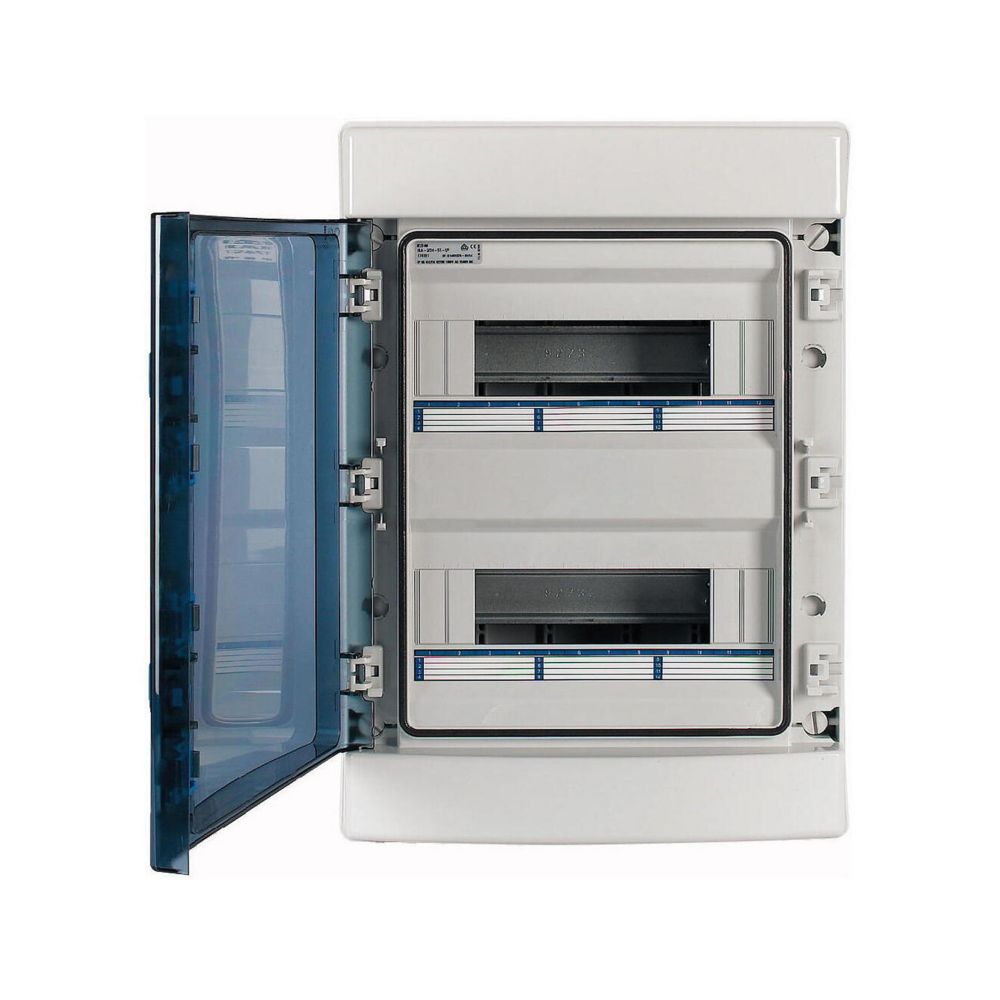 IKA verdeler voor vochtige omgevingen RAL7035, met nulgeleider- en aardklem, ingeschuimde pakking, aangebracht met behulp van CNC, voor IP65-beschermingsgraad volgens IEC/EN 62208, 24 plaatseenheden, 2-rij, UV-stabiel acc DIN EN ISO 4892-2, goedgekeurd voor installatieverdeler voor gebouwen conform IEC/EN 61439-3 VDE 0660-600-3, geïntegreerd module compensatiesysteem ontworpen voor verschillende apparaatbreedtes, metrische uitbreekpoorten met centreerpunt, behuizing volledig gemaakt van polycarbonaat (UV-bestendig), voor het installeren van schakel- en beveiligingscomponenten