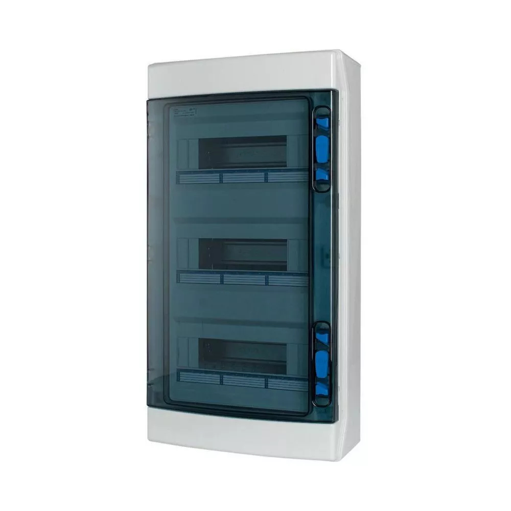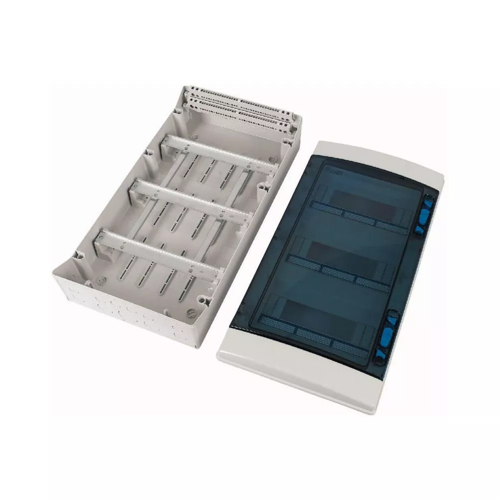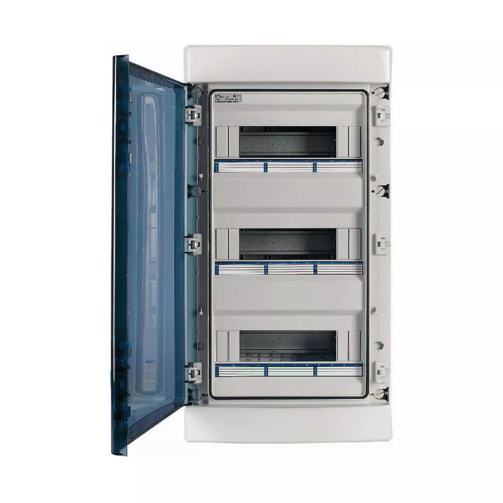 IKA verdeler voor vochtige omgevingen RAL7035, met nulgeleider- en aardklem, ingeschuimde pakking, aangebracht met behulp van CNC, voor IP65-beschermingsgraad volgens IEC/EN 62208, 36 plaatseenheden, 3-rij, UV-stabiel acc DIN EN ISO 4892-2, goedgekeurd voor installatieverdeler voor gebouwen conform IEC/EN 61439-3 VDE 0660-600-3, geïntegreerd module compensatiesysteem ontworpen voor verschillende apparaatbreedtes, metrische uitbreekpoorten met centreerpunt, behuizing volledig gemaakt van polycarbonaat (UV-bestendig), voor het installeren van schakel- en beveiligingscomponenten