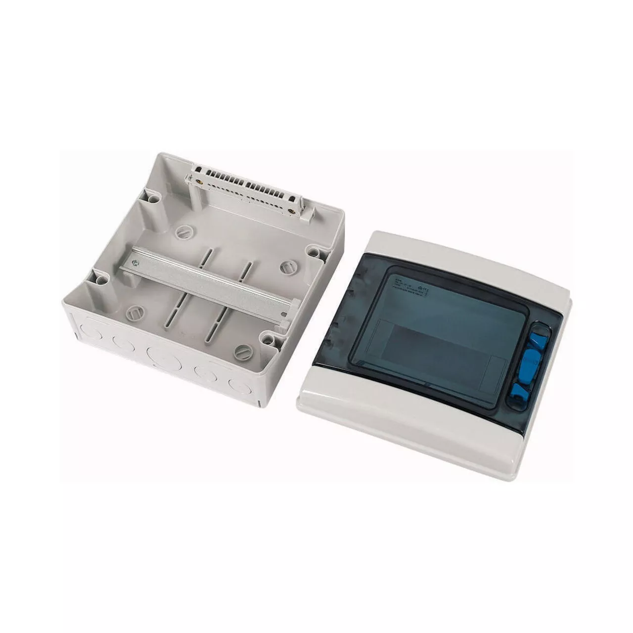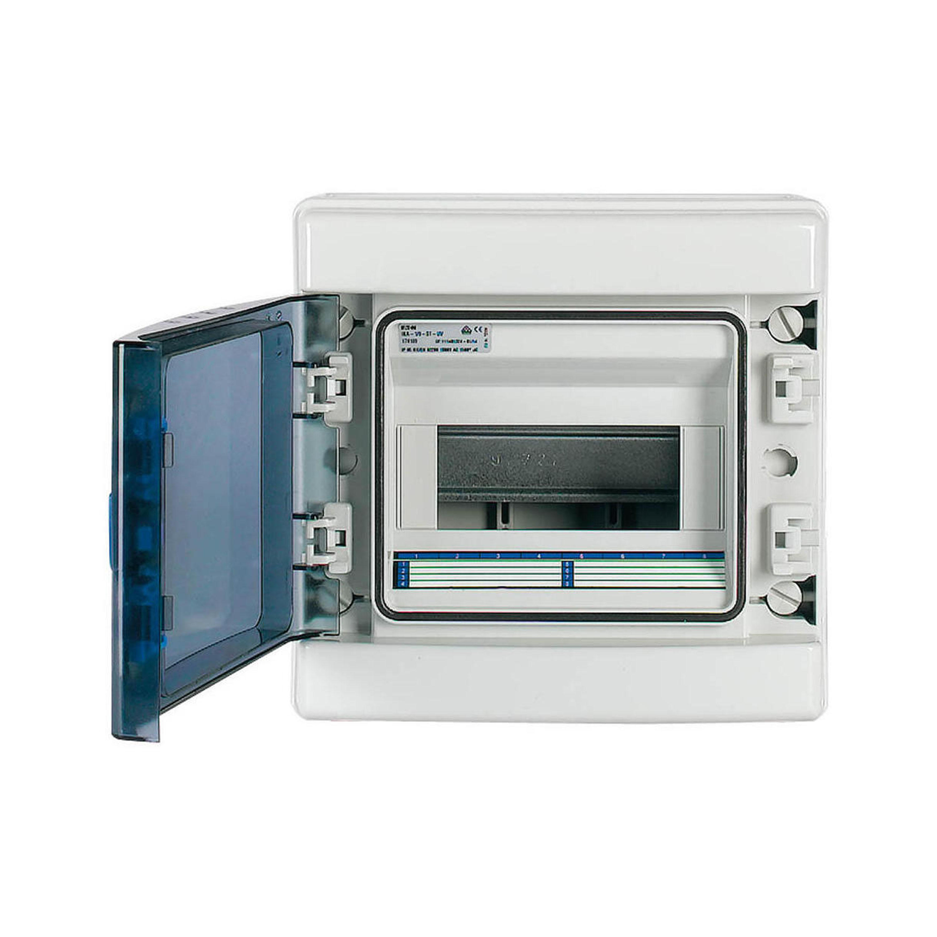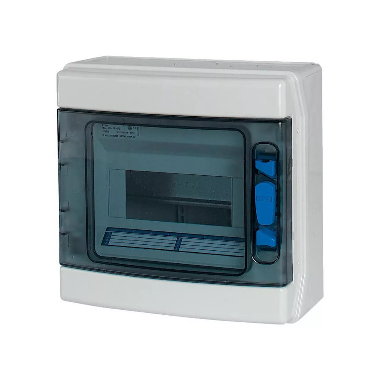 IKA verdeler voor vochtige omgevingen RAL7035, zonder nulgeleider- en aardklem, ingeschuimde pakking, aangebracht met behulp van CNC, voor IP65-beschermingsgraad volgens IEC/EN 62208, 8 plaatseenheden, 1-rij, goedgekeurd voor installatieverdeler voor gebouwen conform IEC/EN 61439-3 VDE 0660-600-3, geïntegreerd module compensatiesysteem ontworpen voor verschillende apparaatbreedtes, metrische uitbreekpoorten met centreerpunt, behuizing van ABS en deur van polycarbonaat, voor het installeren van schakel- en beveiligingscomponenten, in overeenstemming met afmetingenstandaard DIN 43 880, met een installatiediepte van 70 mm, AC 1000 V