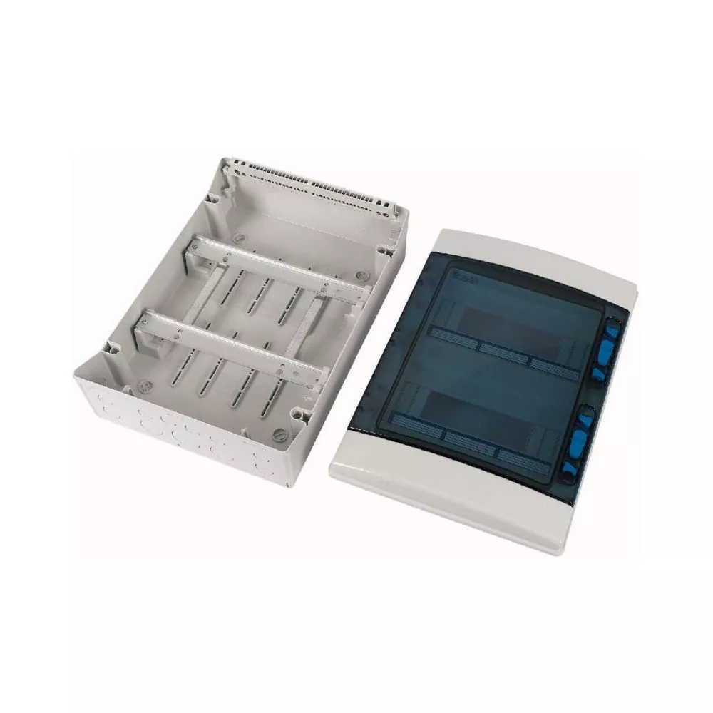 IKA verdeler voor vochtige omgevingen RAL7035, zonder nulgeleider- en aardklem, ingeschuimde pakking, aangebracht met behulp van CNC, voor IP65-beschermingsgraad volgens IEC/EN 62208, 24 plaatseenheden, 2-rij, goedgekeurd voor installatieverdeler voor gebouwen conform IEC/EN 61439-3 VDE 0660-600-3, geïntegreerd module compensatiesysteem ontworpen voor verschillende apparaatbreedtes, metrische uitbreekpoorten met centreerpunt, behuizing van ABS en deur van polycarbonaat, voor het installeren van schakel- en beveiligingscomponenten, in overeenstemming met afmetingenstandaard DIN 43 880 met een installatiediepte van 70 mm of 85 mm