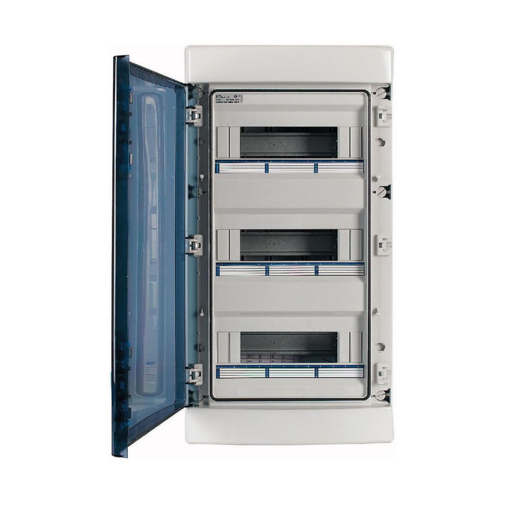 IKA verdeler voor vochtige omgevingen RAL7035, zonder nulgeleider- en aardklem, ingeschuimde pakking, aangebracht met behulp van CNC, voor IP65-beschermingsgraad volgens IEC/EN 62208, 36 plaatseenheden, 3-rij, goedgekeurd voor installatieverdeler voor gebouwen conform IEC/EN 61439-3 VDE 0660-600-3, geïntegreerd module compensatiesysteem ontworpen voor verschillende apparaatbreedtes, metrische uitbreekpoorten met centreerpunt, behuizing van ABS en deur van polycarbonaat, voor het installeren van schakel- en beveiligingscomponenten, in overeenstemming met afmetingenstandaard DIN 43 880 met een installatiediepte van 70 mm of 85 mm