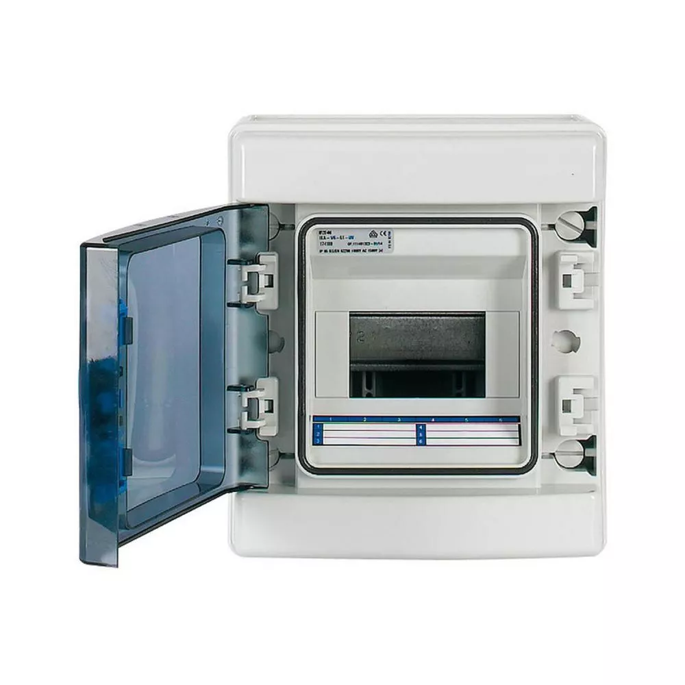 IKA verdeler voor vochtige omgevingen RAL7035, met nulgeleider- en aardklem, ingeschuimde pakking, aangebracht met behulp van CNC, voor IP65-beschermingsgraad volgens IEC/EN 62208, 6 plaatseenheden, 1-rij, goedgekeurd voor installatieverdeler voor gebouwen conform IEC/EN 61439-3 VDE 0660-600-3, geïntegreerd module compensatiesysteem ontworpen voor verschillende apparaatbreedtes, metrische uitbreekpoorten met centreerpunt, behuizing van ABS en deur van polycarbonaat, voor het installeren van schakel- en beveiligingscomponenten, in overeenstemming met afmetingenstandaard DIN 43 880, met een installatiediepte van 70 mm, AC 1000 V