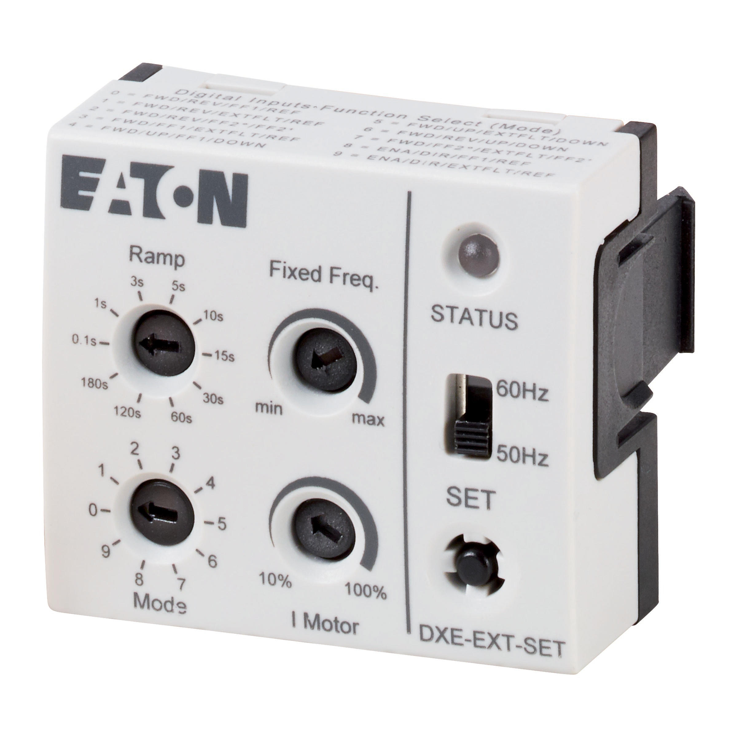 Moduł konfiguracyjny, Opis: Z przełącznikiem wyboru czasu rampy i trybu pracy, Z potencjometrem do ochrony silnika i stałej częstotliwości, Do użytku z: DE1, DE11, Technika podłączenia: Moduł wtykowy (przód)