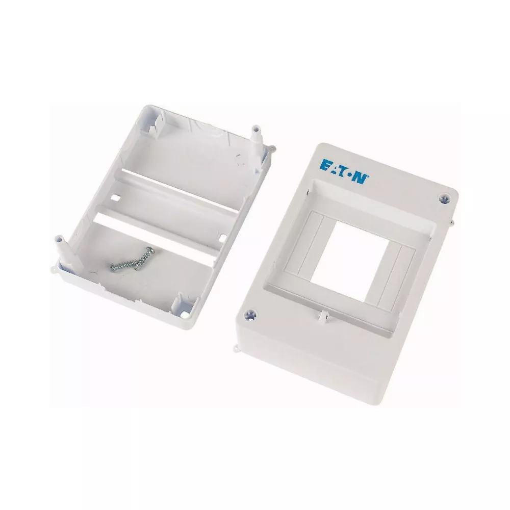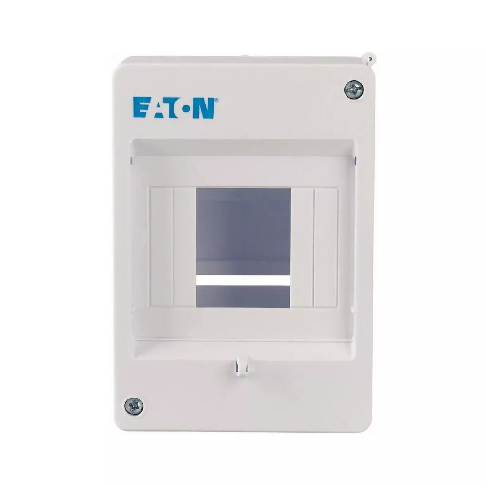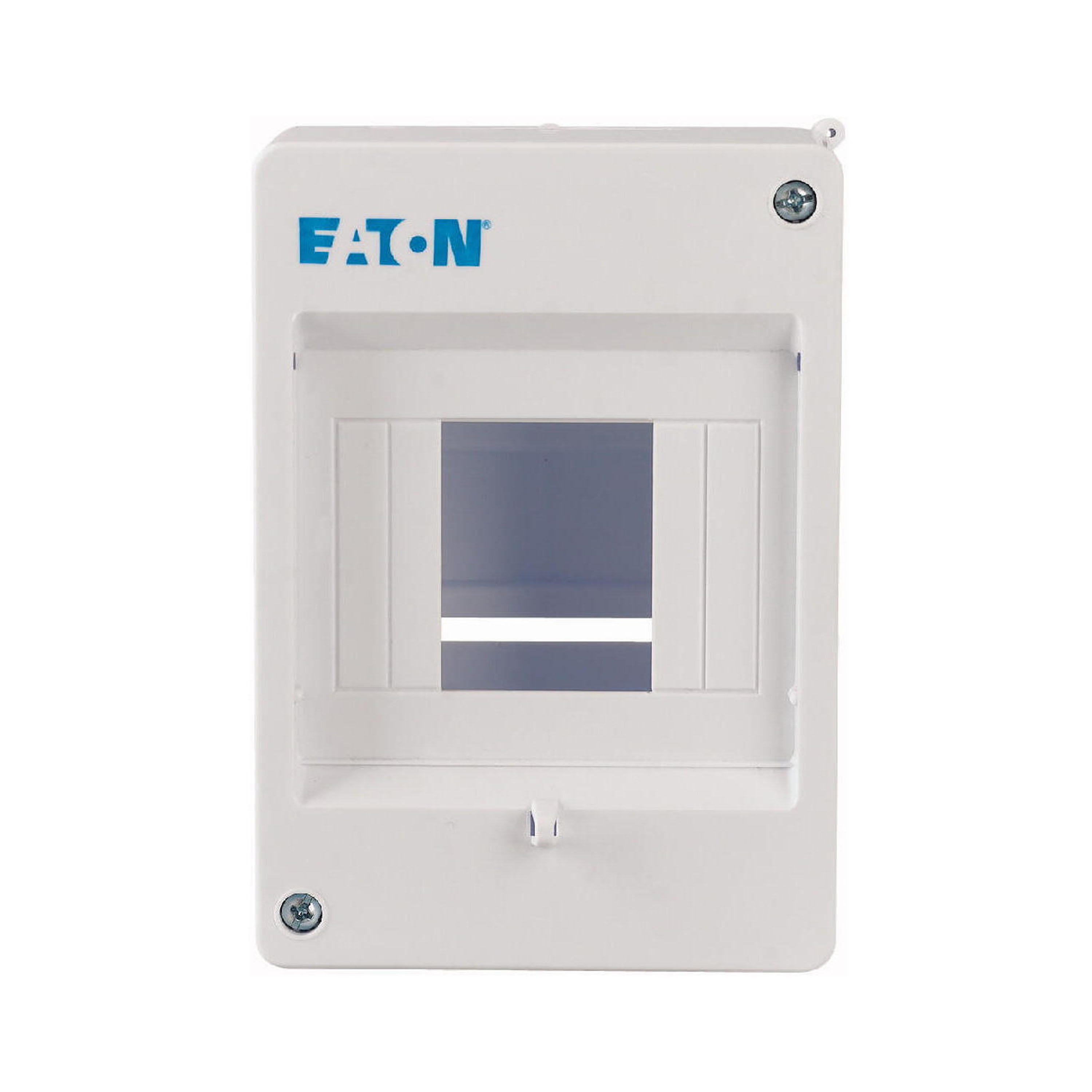 Mini-Kleinverteiler aus Kunststoff, für die Installation von Schalt- und Schutzgeräten, gemäß Maßnorm DIN 43 880, mit 70 mm Einbautiefe und einer Spannung bis 63 A, 400 V /50 Hz, Schutzart IP20 nach IEC/EN 62208, zugelassen für Installationsverteilern in Gebäuden nach IEC/EN 61439-3, für Aufputzmontage, oben mit 46-mm-Geräteöffnung, standardmäßig plombierbar, Unterteil und Deckel weiß mit Schraubverschluss, Vorprägung für metrische Leitungseinführungen oben 1 x M20, unten 1 x M20, jede Seite 2 x M20 und Rückseite 2 x M20, Schutzklasse II, 4 Teilungseinheiten. Die Fensterklappe T4-MINI ist separat erhältlich.