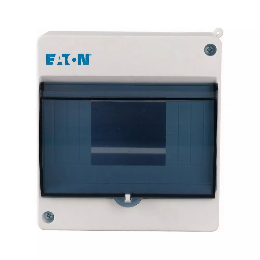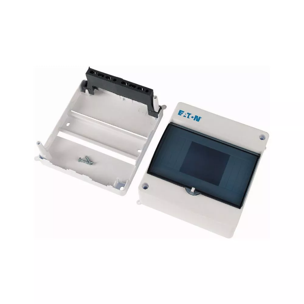 Mini-Kleinverteiler aus Kunststoff, mit transparenter Tür, für die Installation von Schalt- und Schutzgeräten, gemäß Maßnorm DIN 43 880, mit 70 mm Einbautiefe und einer Spannung bis 63 A, 400 V/50 Hz, Schutzart IP30 nach IEC/EN 62208, zugelassen für Installationsverteiler in Gebäuden nach IEC/EN 61439-3, für Aufputzmontage, oben mit 46-mm-Geräteöffnung, standardmäßig plombierbar, Unterteil und Deckel weiß mit Schraubverschluss, Vorprägung für metrische Leitungseinführungen oben 2x M20, unten 2x M20, jede Seite 2x M20, Rückseite 4x M20, Schutzklasse II, 6 Teilungseinheiten.