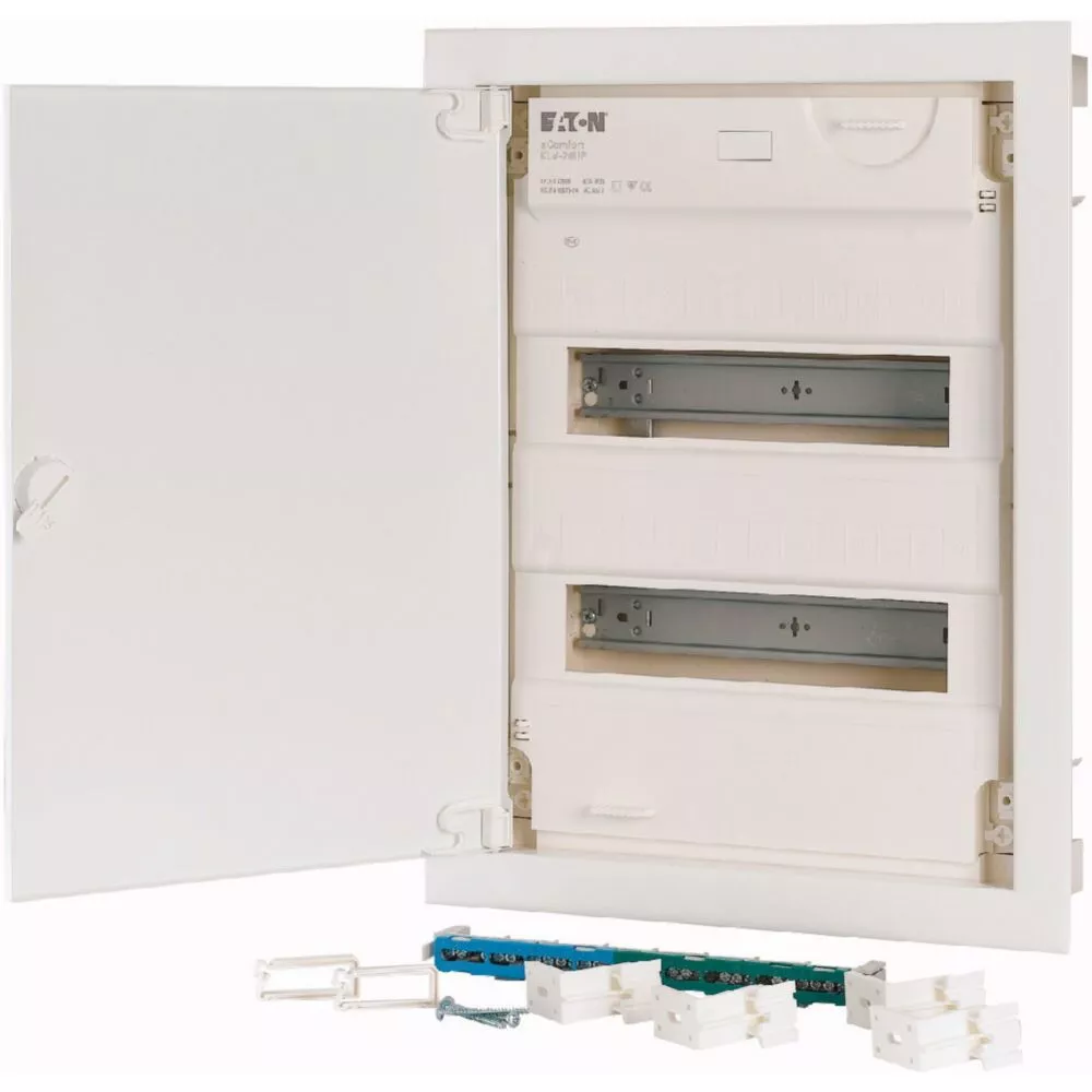 Unterputz-Kleinverteiler KLV der zweiten Generation, Schutzklasse II, Kunststoffgehäuse mit Stahlblechtür, Frontabdeckung, plombierbar und laserbeschriftet entsprechend IEC/EN 60670-24,, plus 2 Teilungseinheiten Reserve je Reihe, Beschriftungsfeld in Wandkasten, einzigartiges, superflaches Türrahmen-Design, robuster Türdrehriegel, Optional ersetzbar mit Sicherheitsverriegelung, Kabelhalter für saubere Verkabelung, optional in Lieferumfang für Projekte erhältlich, Tür mit Rahmen in gewünschter RAL-Farbe, umfangreiches Zubehör, im Lieferumfang enthalten: Gehäuse, Geräteträger