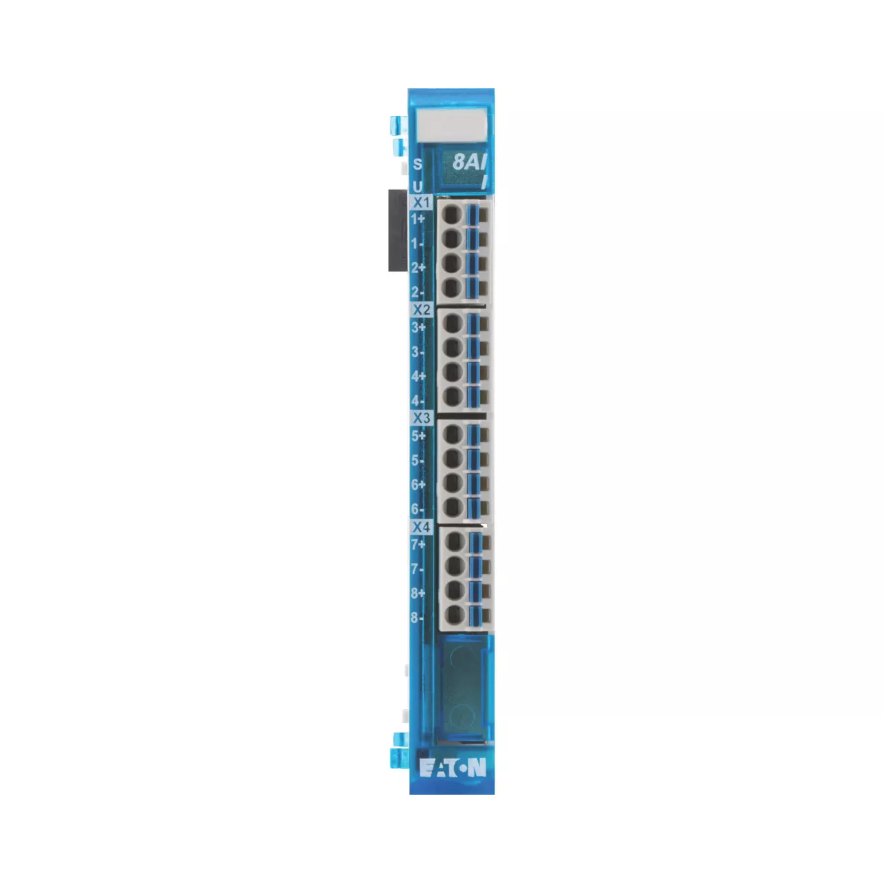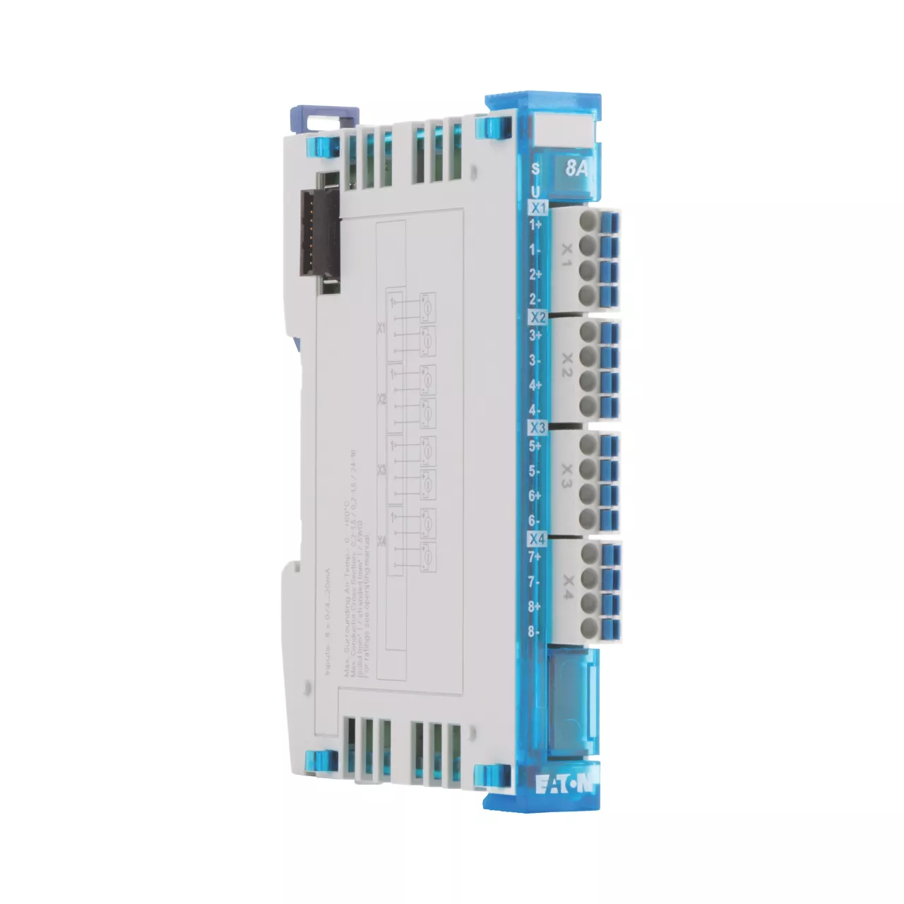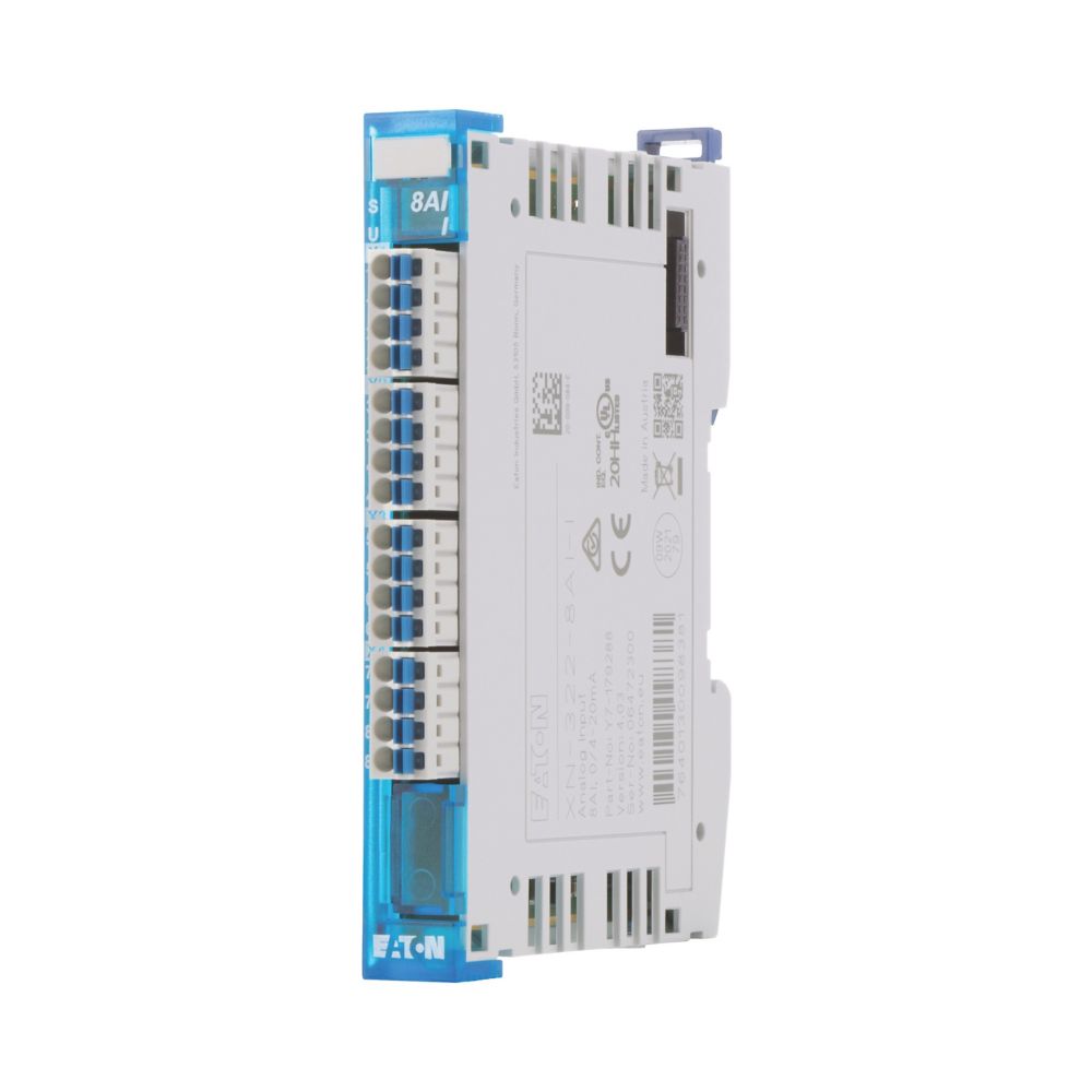 Płytkowy moduł wejść analogowych XN-322 do systemu we/wy XN300, z ośmioma wejściami prądowymi 0 – 20 mA/4 – 20 mA o dokładności +/-0,5% wartości końcowej, wskaźnik wartości mierzonej w uA, 16-bitowa (rozdzielczość 0,3 uA), pobór prądu przy 5 V: 55 mA, pobór prądu przy 24 V: 35 mA