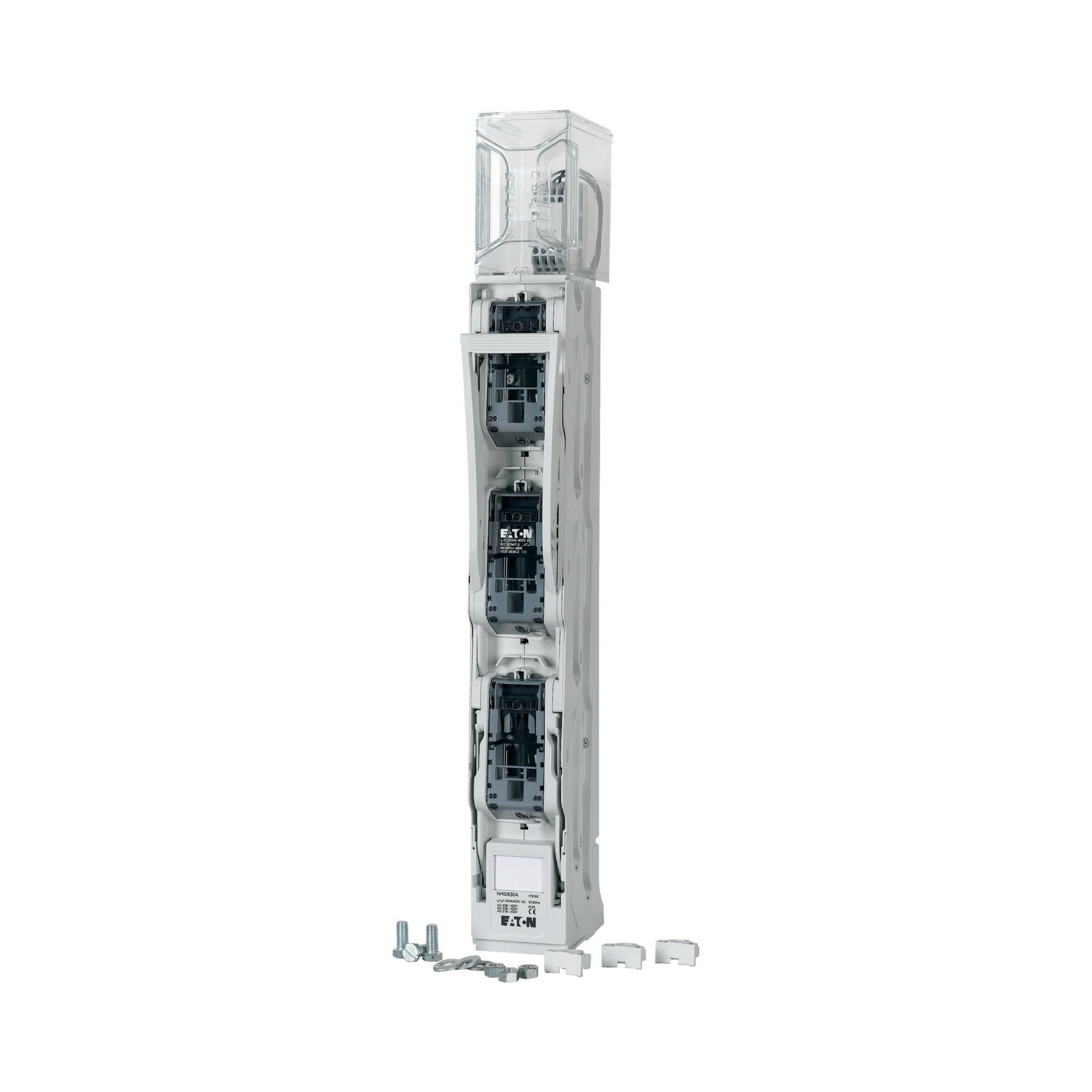 NH-Sicherungslast-Schaltleiste 3-polig mit Sicherungsüberwachung, Größe NH3, Lieferung ohne NH-Sicherungseinsätze, vertikale Einbaulage möglich, das Gerät ist universell für Kabelabgang oben/unten geeignet, Entspricht der Normen nach IEC 60947-1:2007 + A1:2010 und IEC 60947-3:2008 + A1:2012