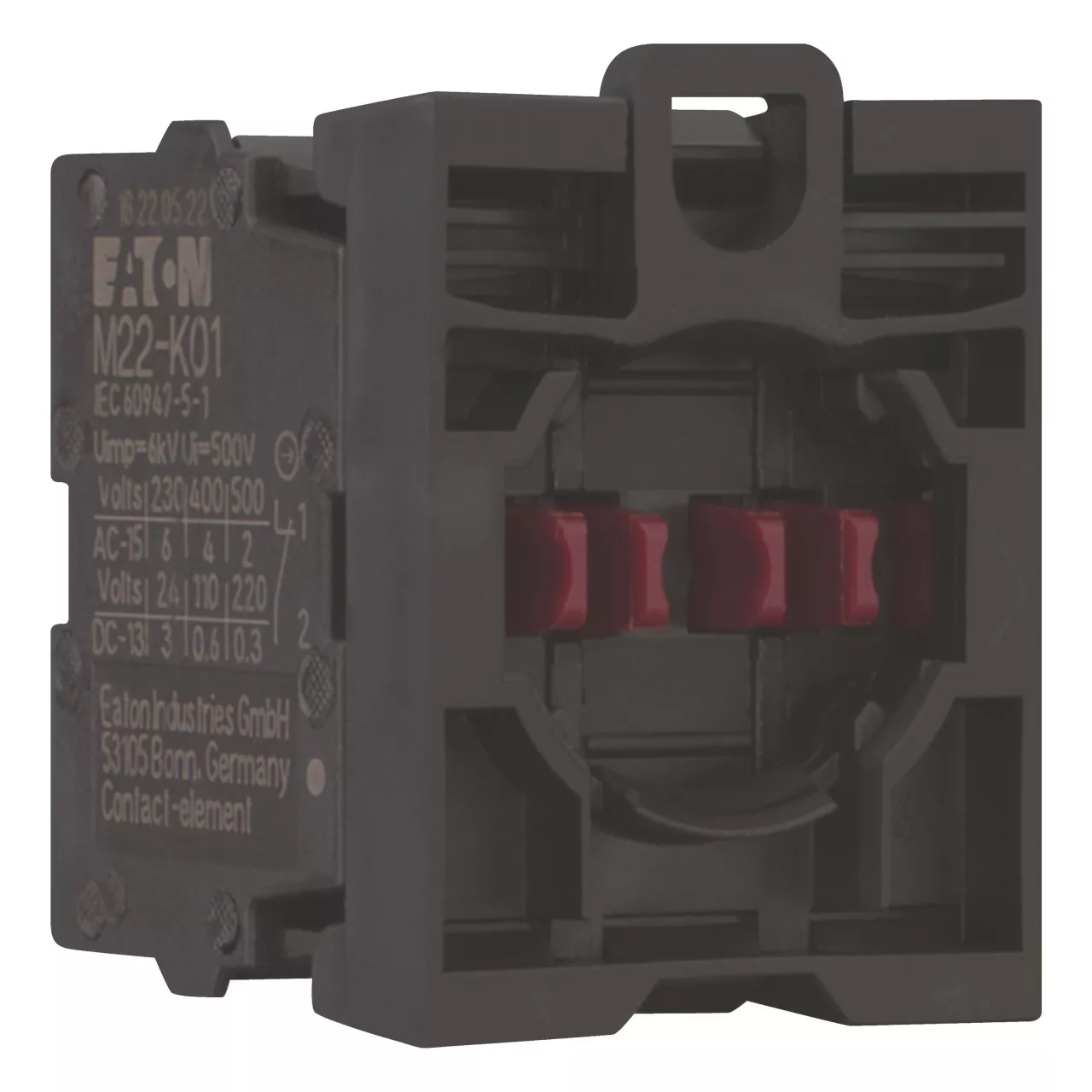 Contactelement, aansluittechniek: Cage Clamp, bevestiging: Frontbevestiging, beschrijving: Combinatie van contactelement en zelfbewakend contactelement M22-K01SMC10, M22-A bevestigingsadapter, en M22-XSMC meldcontactbediening, Het no contact in het zelfbewakend contactelement wordt bediend wanneer deze op de M22-XSMC gemonteerd is., Cage Clamp is een geregistreerde trademark van Wago Kontakttechnik GmbH/Minden, Duitsland, contacten nc = normaal gesloten: 3 nc, opmerkingen contacten = veiligheidsfunctie, door dwangmatig openen volgens IEC/EN 60947-5-1, weg van de bediening en bedieningskracht conform DIN EN 60947-5-1, K.5.4.1: 5,5 mm, maximale veerweg: 5,8 mm