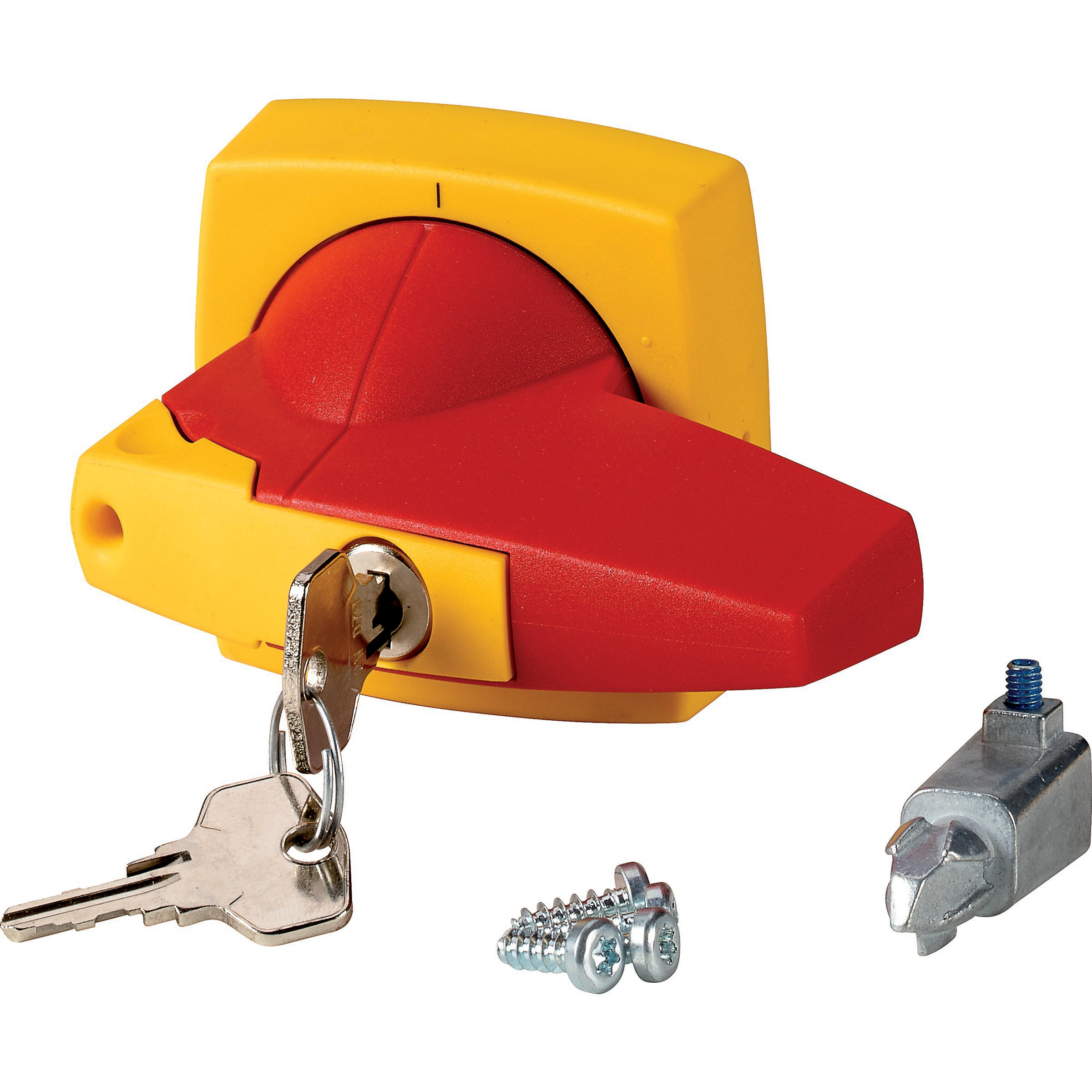 Uchwyt obrotowy, Funkcja podstawowa: Uchwyty obrotowe, Kompletny uchwyt ze sprzęgłem drzwi, Średnica kołka: 6 x 6, Do zastosowania z: DMM125, DMV160N, Do zastosowania z: Montaż do drzwi, Informacje dotyczące dostarczonego sprzętu: Z zamkiem cylindrycznym, kolor czerwony/żółty, Kąt przełączania: 90 °