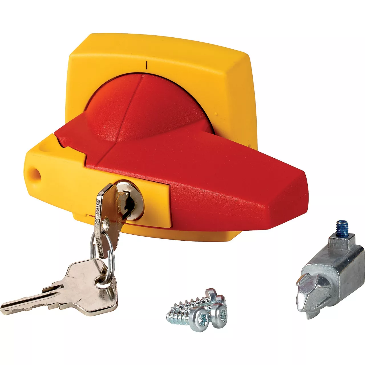 Uchwyt obrotowy, Funkcja podstawowa: Uchwyty obrotowe, Kompletny uchwyt ze sprzęgłem drzwi, Średnica kołka: 8 x 8, Do zastosowania z: QSA63N1, QSA100N1, QSA125N1, QSA160N1, Do zastosowania z: Montaż do drzwi, Informacje dotyczące dostarczonego sprzętu: Z zamkiem cylindrycznym, kolor czerwony/żółty, Kąt przełączania: 90 °