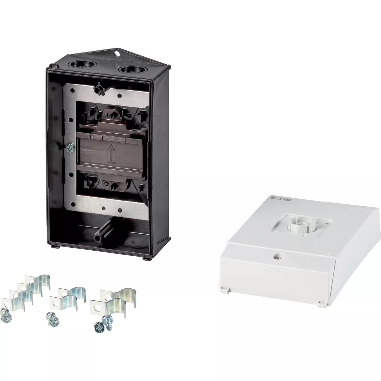 Mała obudowa, stopień ochrony IP65, poliwęglan wzmocniony włóknem szklanym, dolna część obudowy RAL 9005, czarny/górna część obudowy RAL 7035, kolor jasnoszary, przebicie sztywne na wprowadzenie kabli metrycznych na górze, na dole, w płycie tylnej, z wstępnie zmontowanym ekranem płyty montażowej, do przełączników T0-../Z, 1 jednostka stykowa