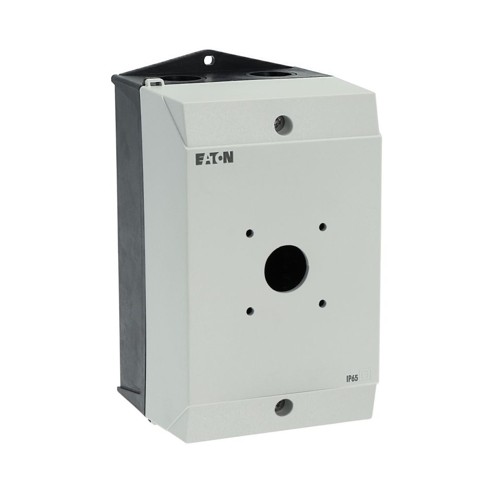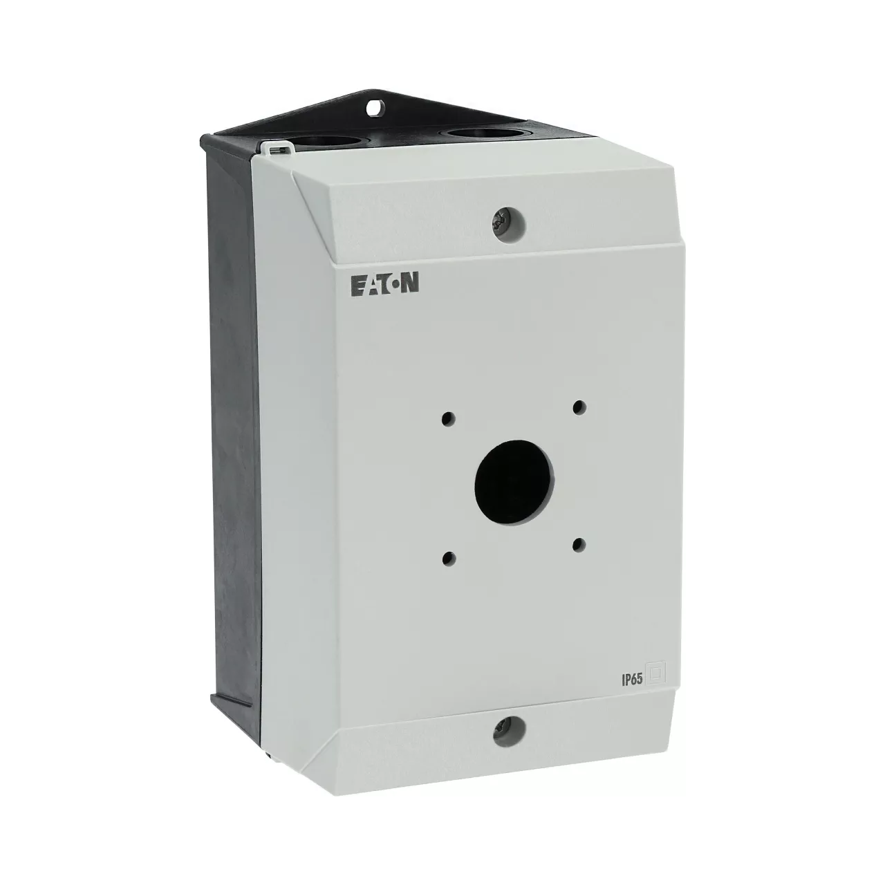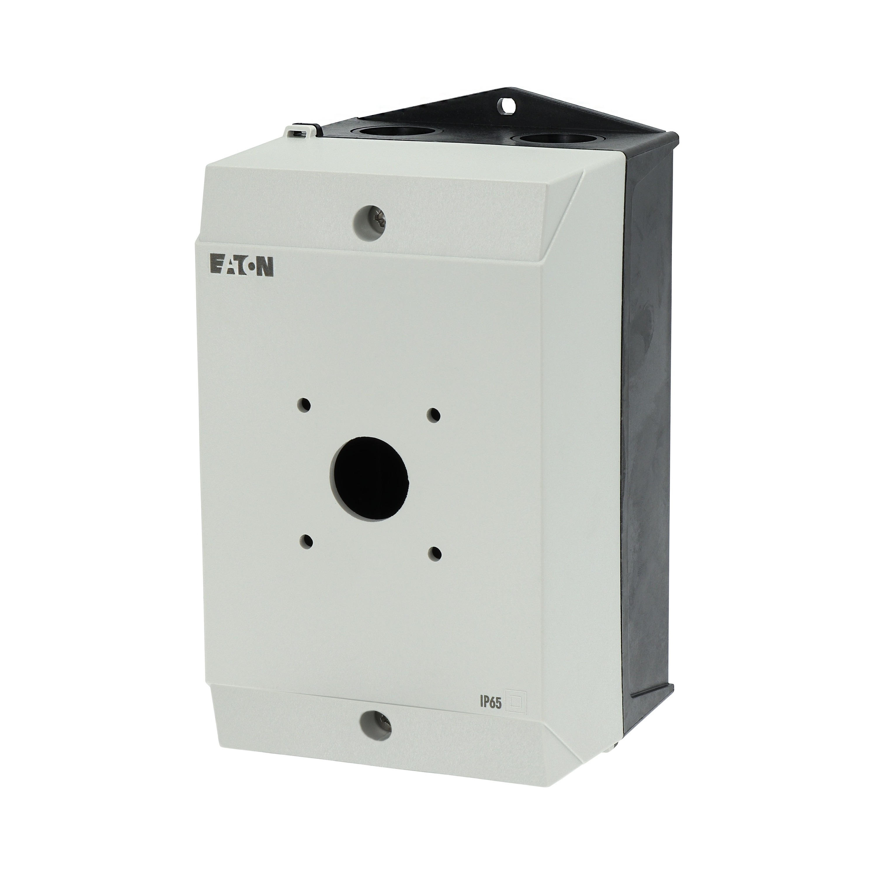 Mała obudowa, stopień ochrony IP65, poliwęglan wzmocniony włóknem szklanym, dolna część obudowy RAL 9005, czarny/górna część obudowy RAL 7035, kolor jasnoszary, przebicie sztywne na wprowadzenie kabli metrycznych na górze, na dole, w płycie tylnej, z wstępnie zmontowanym ekranem płyty montażowej, do przełączników T0-../Z, 2 jednostki stykowe