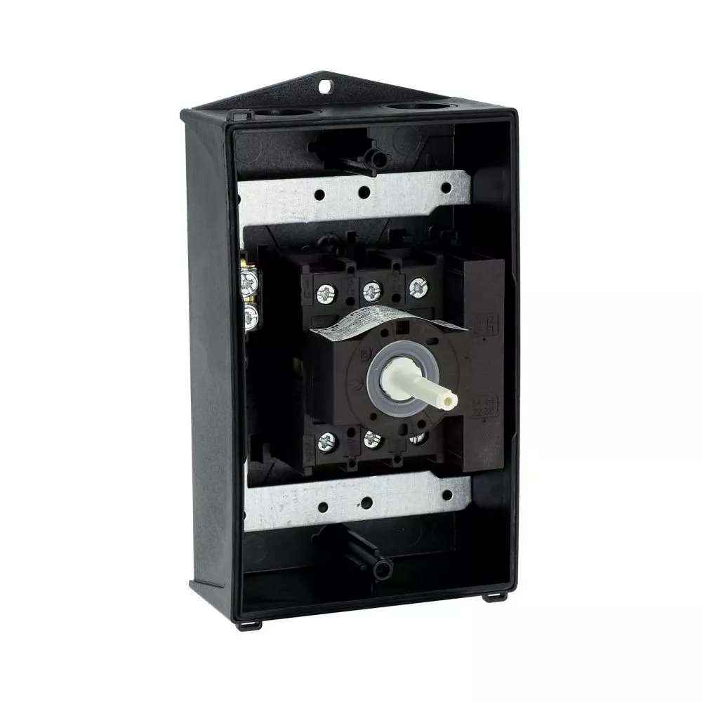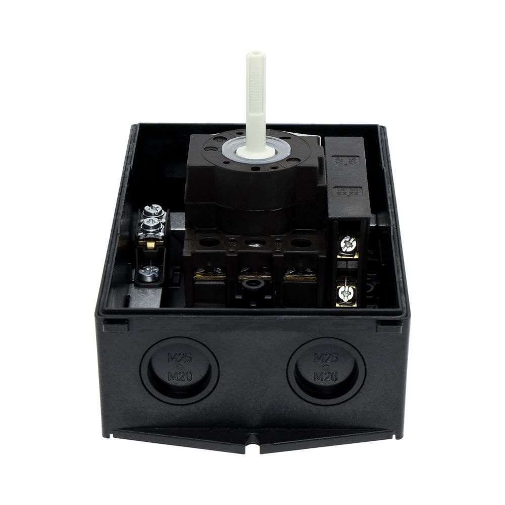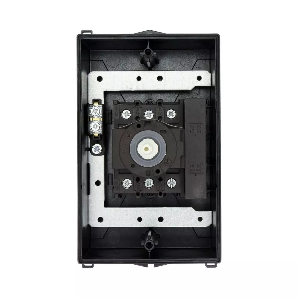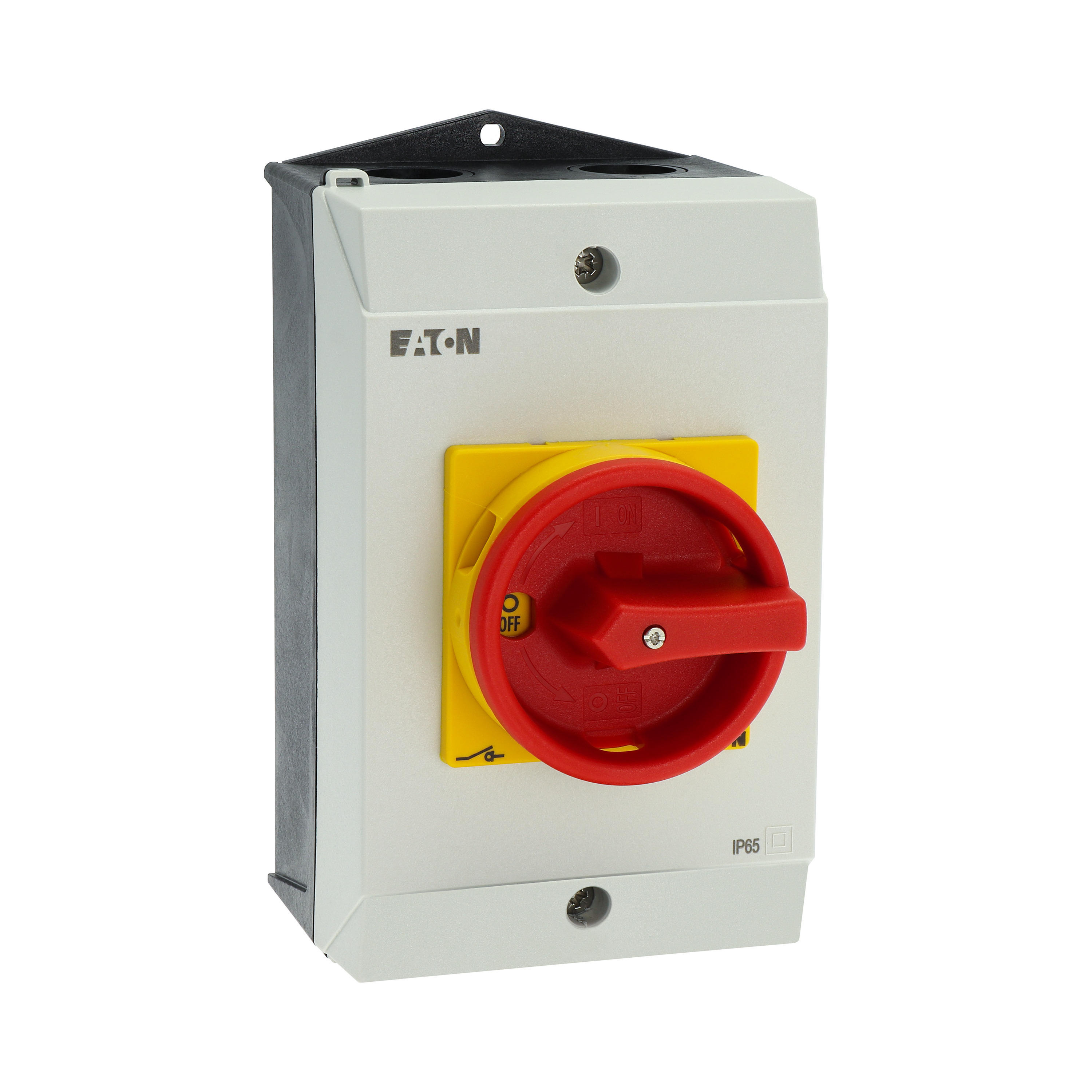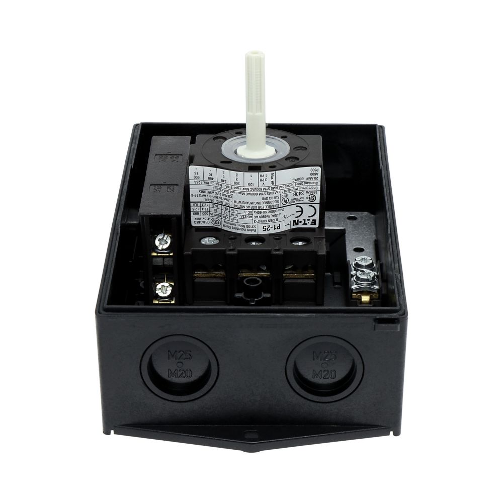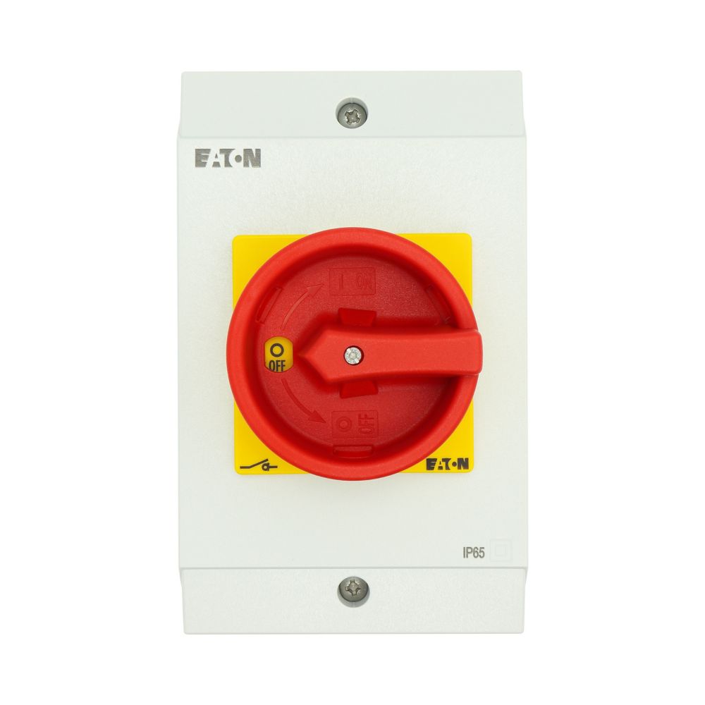 Wyłącznik główny, P1, Znamionowy prąd ciągły (Iu): 25 A, Funkcje: Z mechanizmem ryglującym, Funkcja wyłączania awaryjnego, Wyposażone w: Arkusz poglądowy montażu, Czerwony uchwyt obrotowy i żółty pierścień blokujący, Sposób montażu: Montaż powierzchniowy, Liczba biegunów: 3-bieg., Element blokujący: Możliwość zablokowania w położeniu 0 (Wył.), Stopień ochrony: NEMA 12