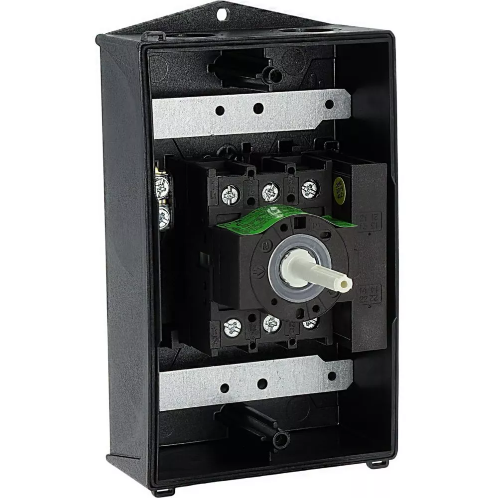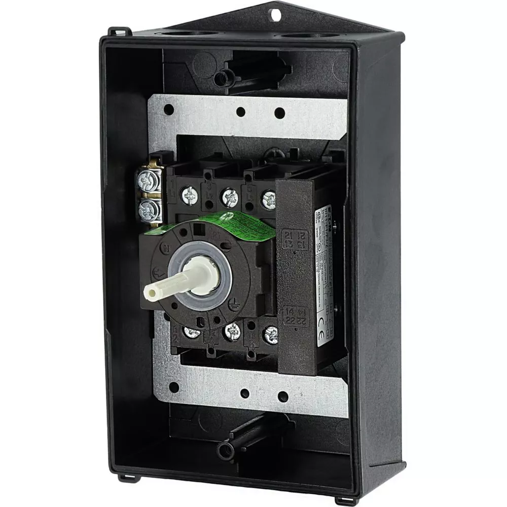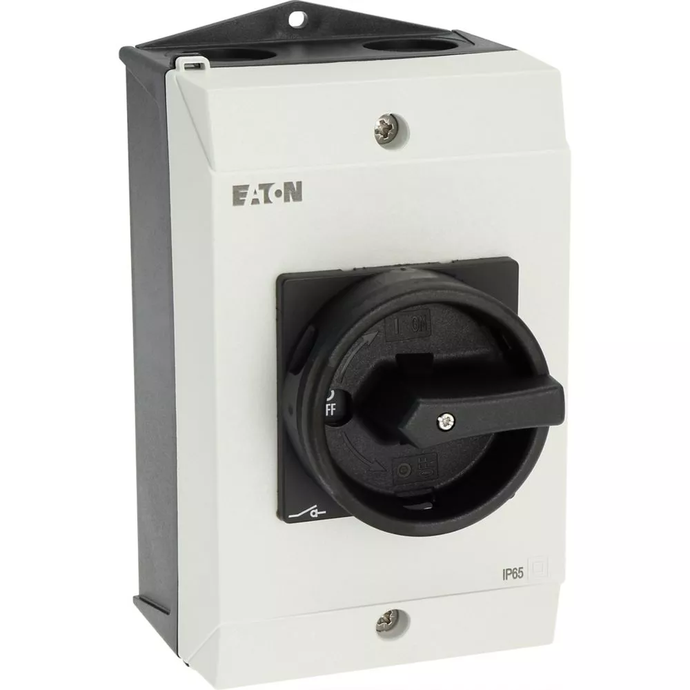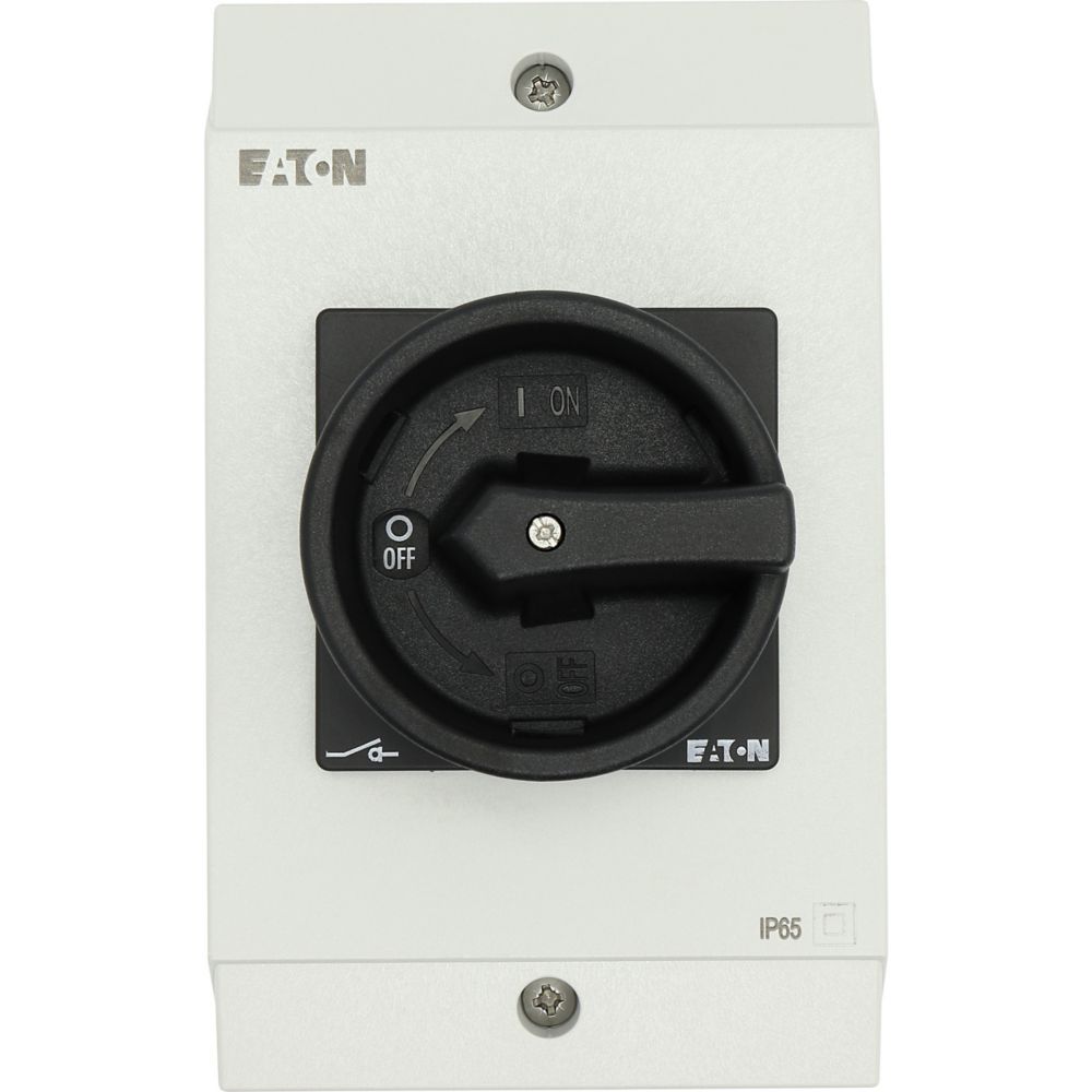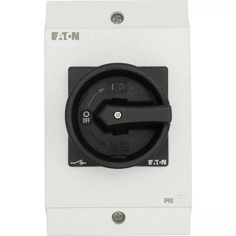 Wyłącznik główny, P1, Znamionowy prąd ciągły (Iu): 32 A, Funkcje: Z mechanizmem ryglującym, Funkcja STOP, Wyposażone w: Czarny uchwyt obrotowy i pierścień blokujący, Arkusz poglądowy montażu, Sposób montażu: Montaż powierzchniowy, Liczba biegunów: 3-bieg., Element blokujący: Możliwość zablokowania w położeniu 0 (Wył.), Stopień ochrony: NEMA 12