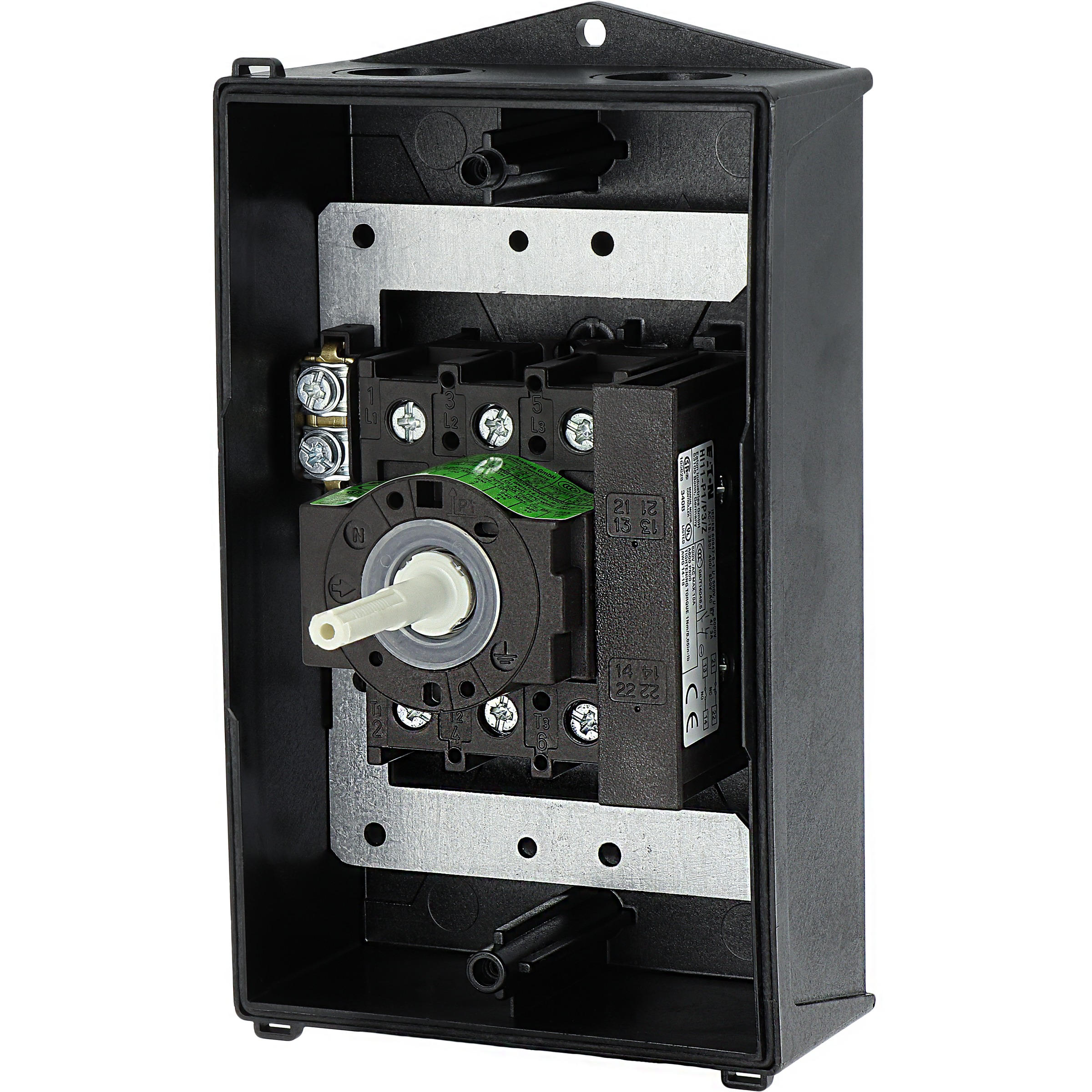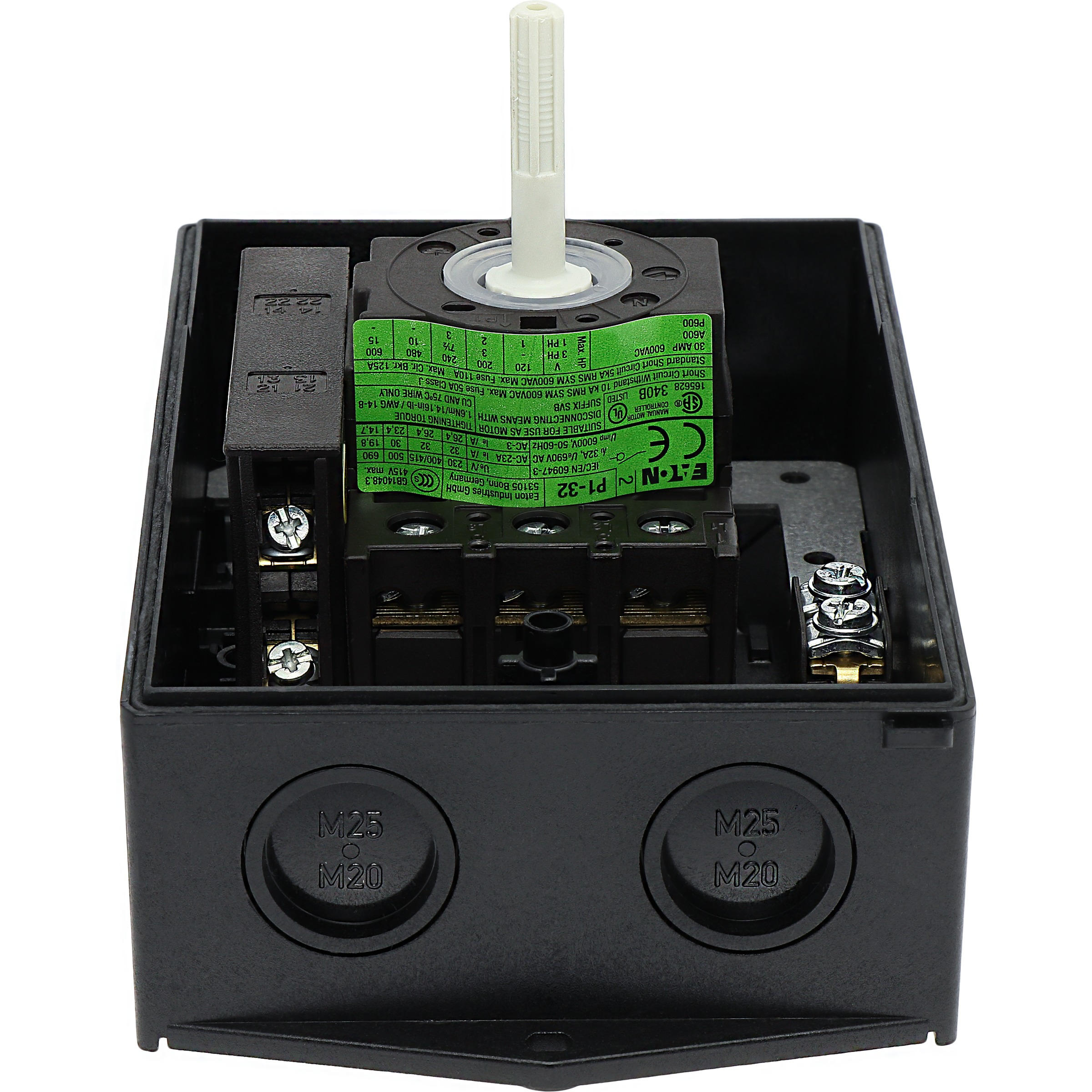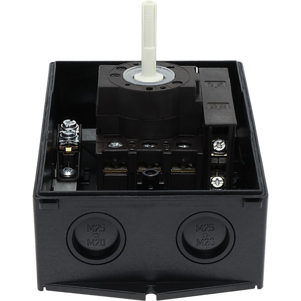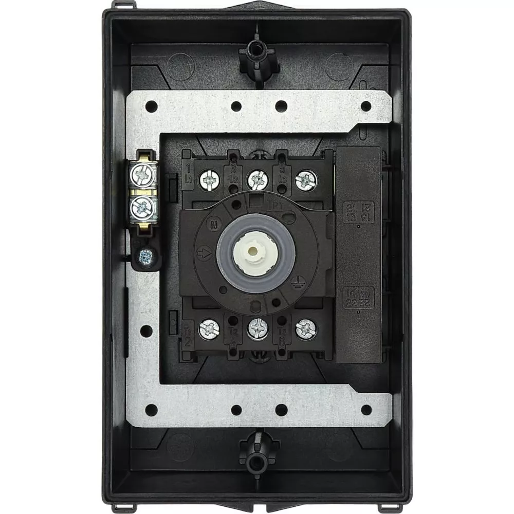 Wyłącznik główny, P1, Znamionowy prąd ciągły (Iu): 32 A, Funkcje: Z mechanizmem ryglującym, Funkcja STOP, Wyposażone w: Czarny uchwyt obrotowy i pierścień blokujący, Arkusz poglądowy montażu, Sposób montażu: Montaż powierzchniowy, Liczba biegunów: 3-bieg., Element blokujący: Możliwość zablokowania w położeniu 0 (Wył.), Stopień ochrony: NEMA 12