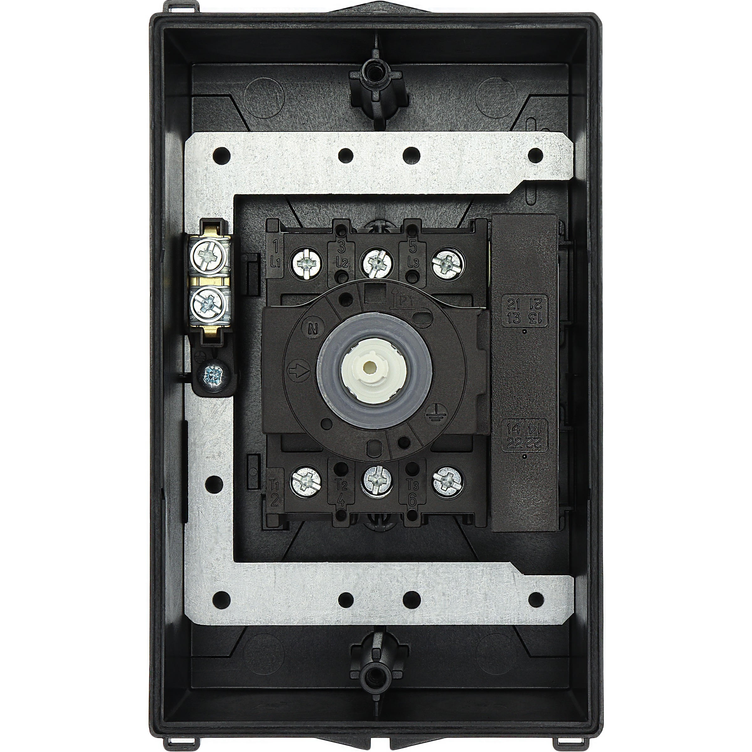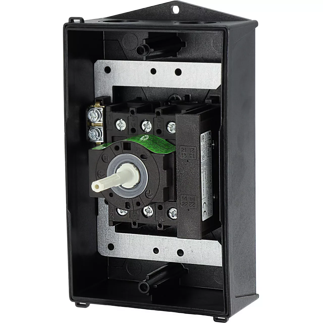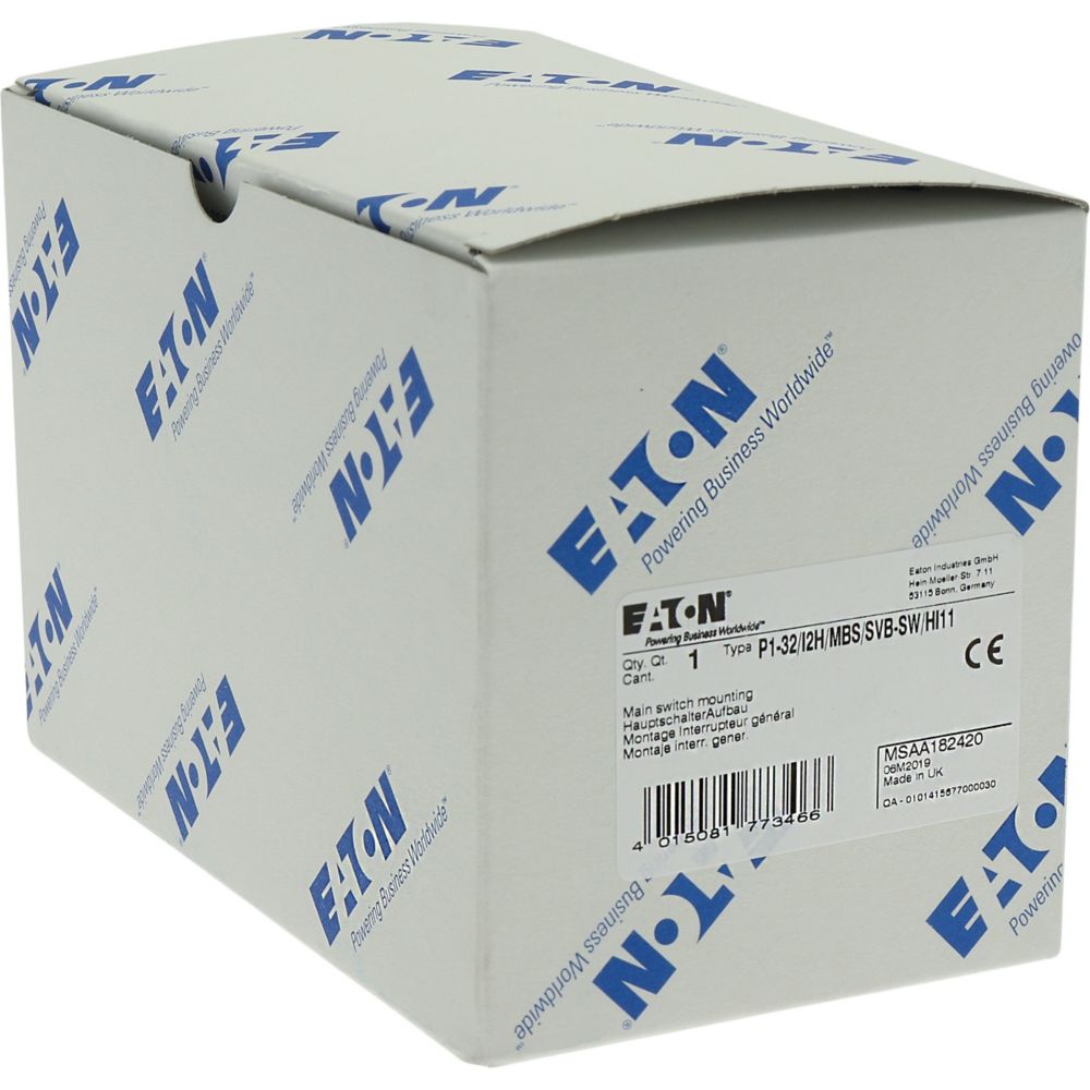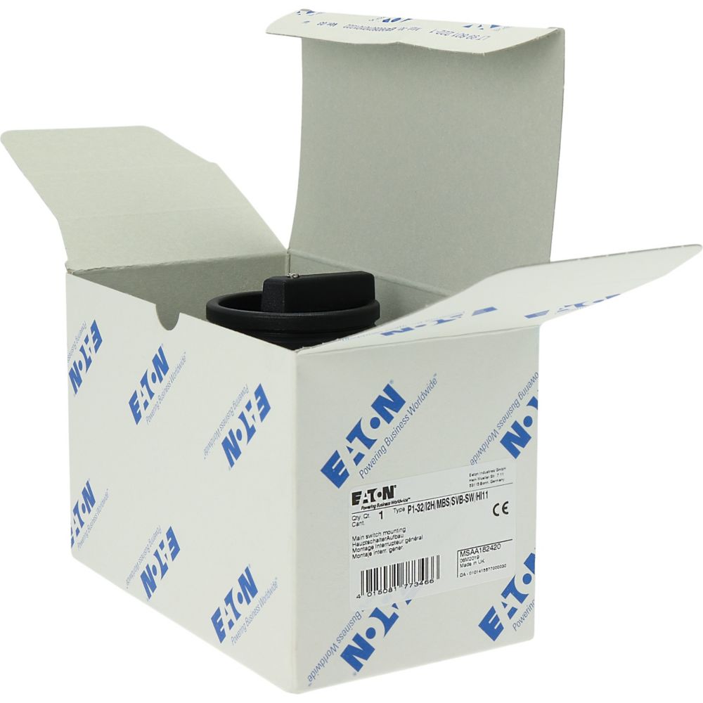 P1-32/I2H/MBS/SVB-SW/HI11 Rozłącznik główny, 3 bieg.+1NO+1NC, 32A, funkcja awaryjnego zatrzymania, blok. na kłódkę w pozycji Wył., w obudowie ze szkła utwardzanego, z płytą ekranującą MBS, pokrętło czarne z blokadą na kłódkę