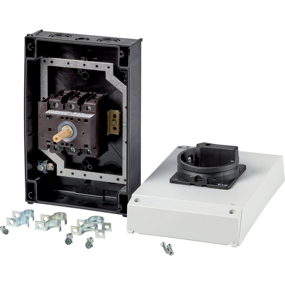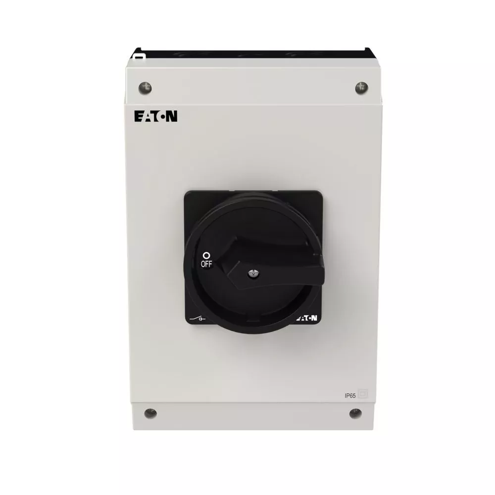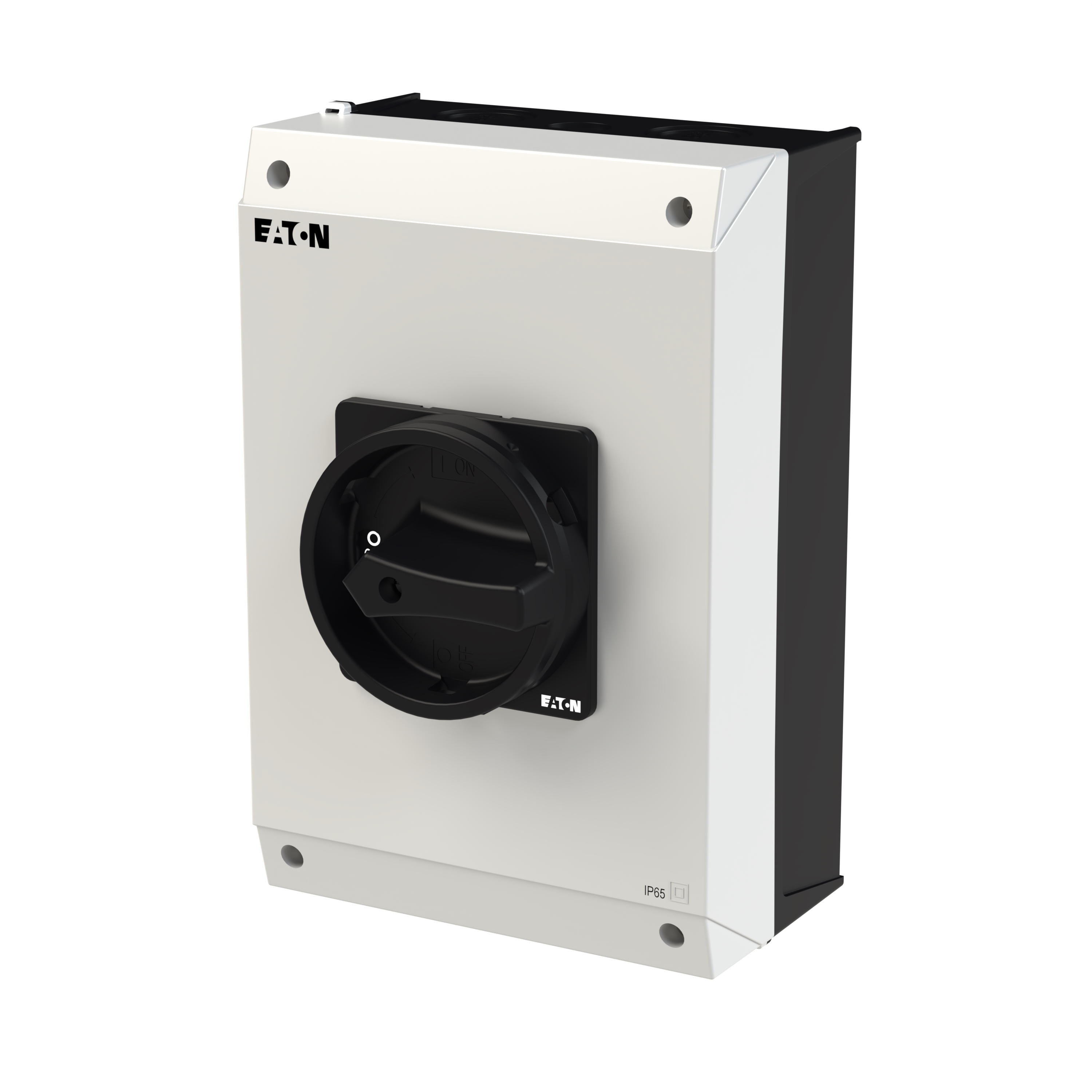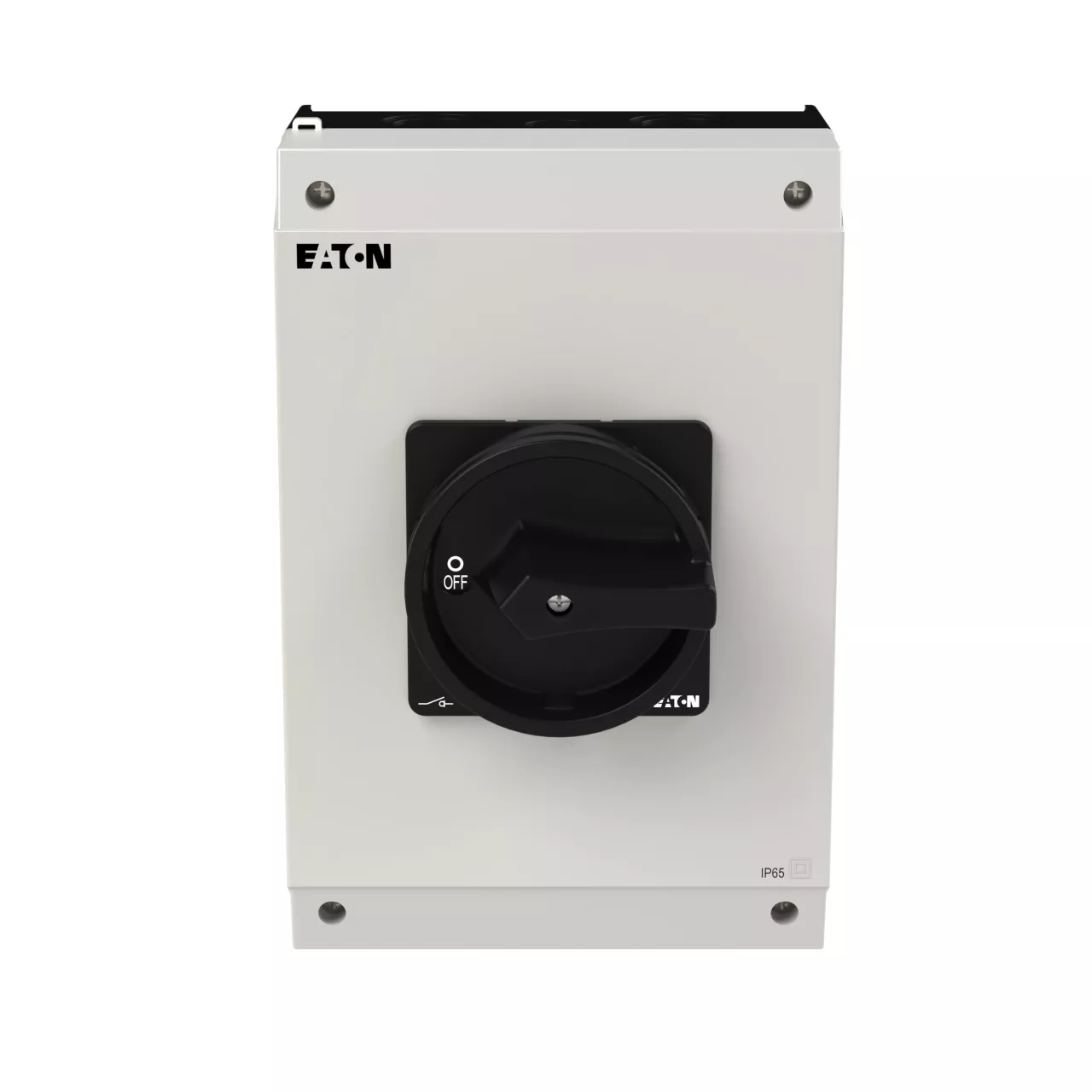 Wyłącznik główny, Zacisk śrubowy: Wyłącznik główny, wyłącznik serwisowy, Odniesienie do grupy części: P3, Funkcja zatrzymania: Funkcja STOP, Z czarnym uchwytem obrotowym i pierścieniem blokującym, Uwagi: z arkuszem poglądowym montażu, Informacje dotyczące dostarczonego sprzętu: Styk pomocniczy lub przewód neutralny montowany przez użytkownika., 3-biegunowy, Element blokujący: Możliwość zablokowania w położeniu 0 (Wył.), Stopień ochrony: IP65, Projekt: montaż powierzchniowy, Moc znamionowa AC-23A, 50 - 60 Hz 400 V: P = 30 kW, Znamionowy prąd ciągły: Iu = 63 A, Normy: IEC/EN 60947, VDE 0660, IEC/EN 60204, Rozłącznik izolacyjny zgodnie z normą IEC/EN 60947-3