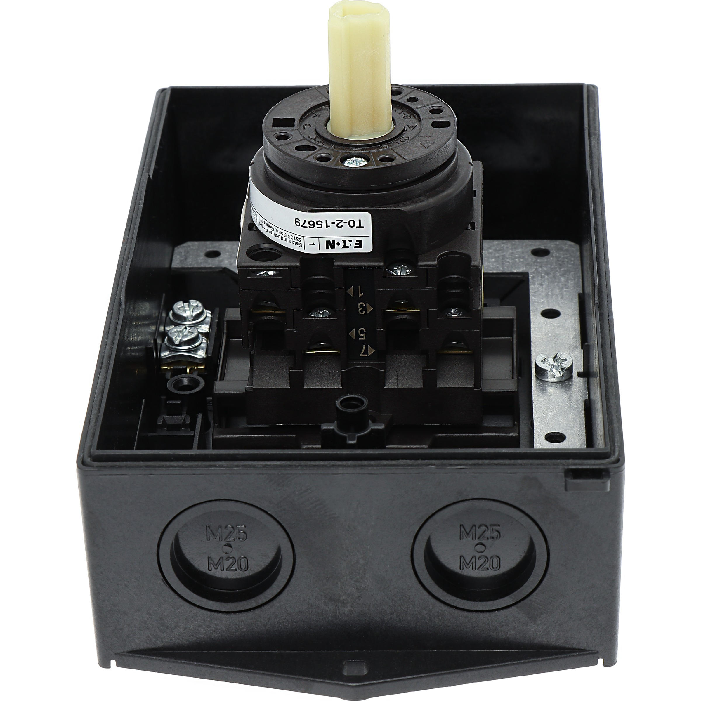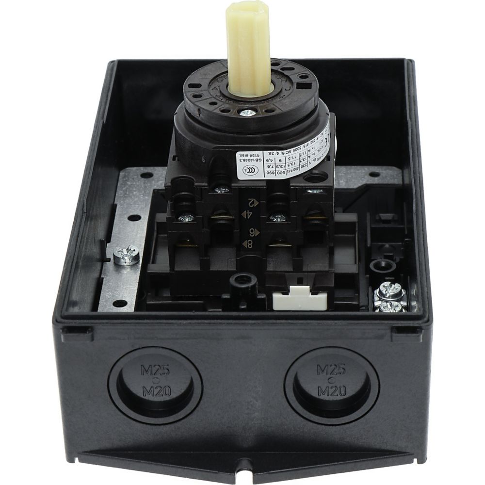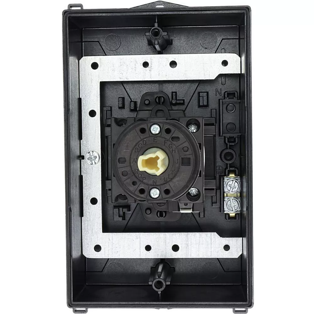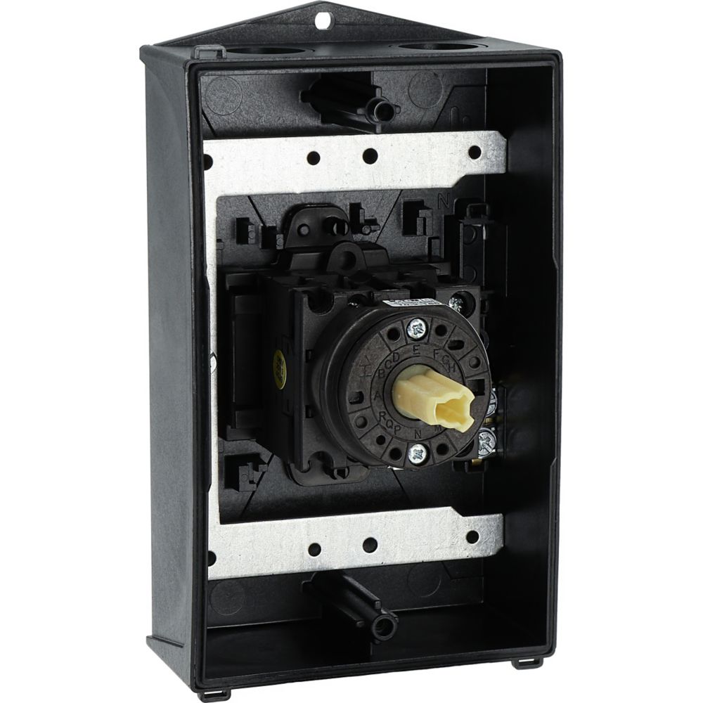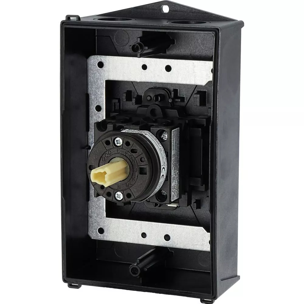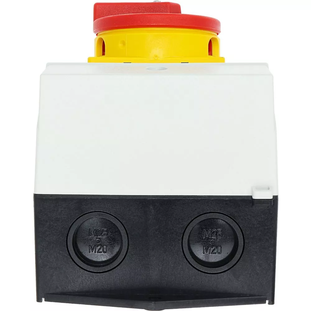 Wyłącznik główny, Zacisk śrubowy: Wyłącznik główny, wyłącznik serwisowy, Wyłącznik naprawczy, Odniesienie grupy części T0, Funkcja zatrzymania: Funkcja wyłączania awaryjnego, z czerwonym uchwytem obrotowym i żółtym pierścieniem blokującym, Uwagi: wersja z otworami do wyłamywania, z arkuszem poglądowym montażu, 3-biegunowy, Element blokujący: Możliwość zablokowania w położeniu 0 (Wył.), Stopień ochrony: IP65, Projekt: montaż powierzchniowy, Kąt przełączania: 90°, Moc znamionowa AC-23A, 50 - 60 Hz 400 V: P = 5,5 kW, Znamionowy prąd ciągły: Iu = 20 A, 2 zespoł montażowy, Normy: IEC/EN 60947, VDE 0660, IEC/EN 60204, Rozłącznik izolacyjny zgodnie z normą IEC/EN 60947-3