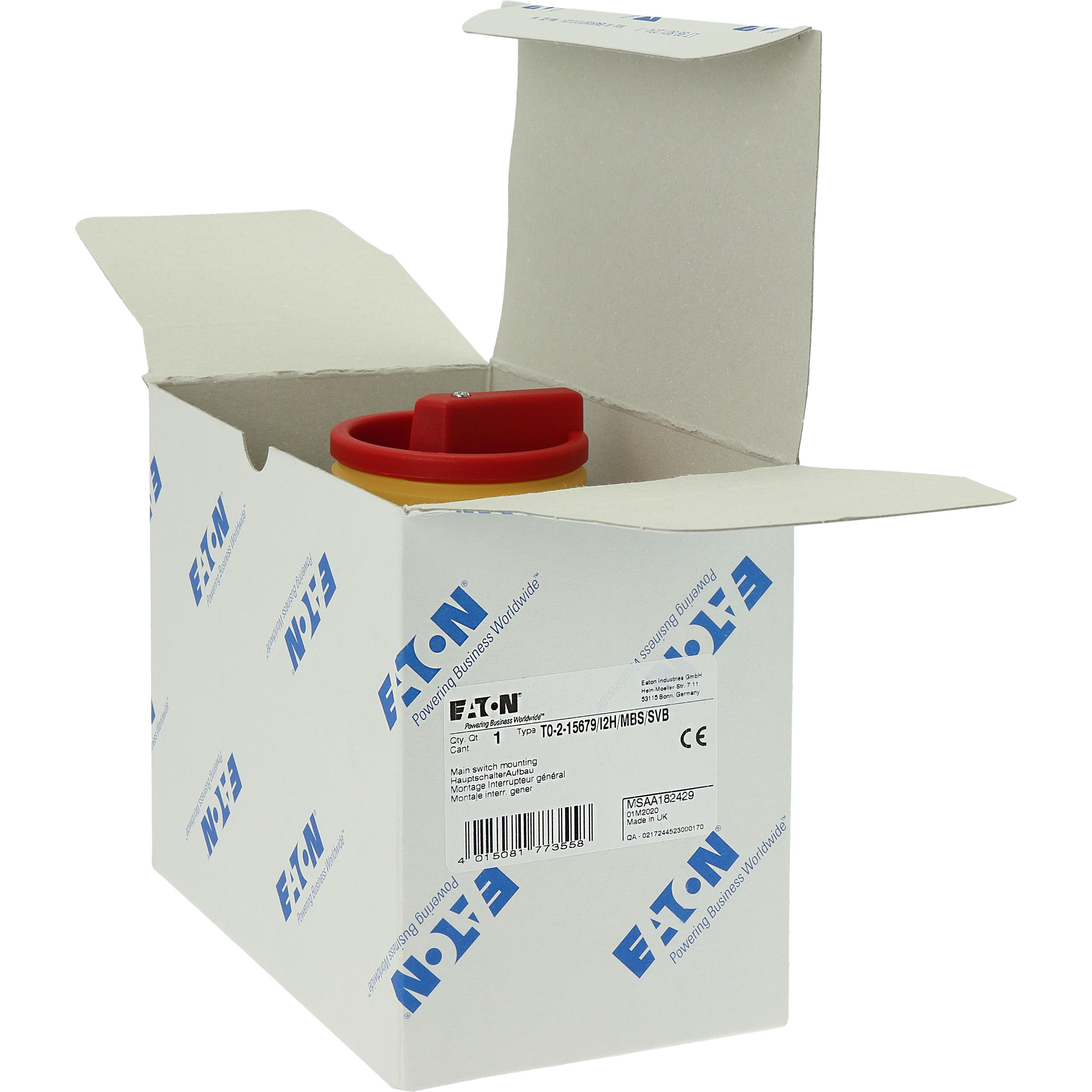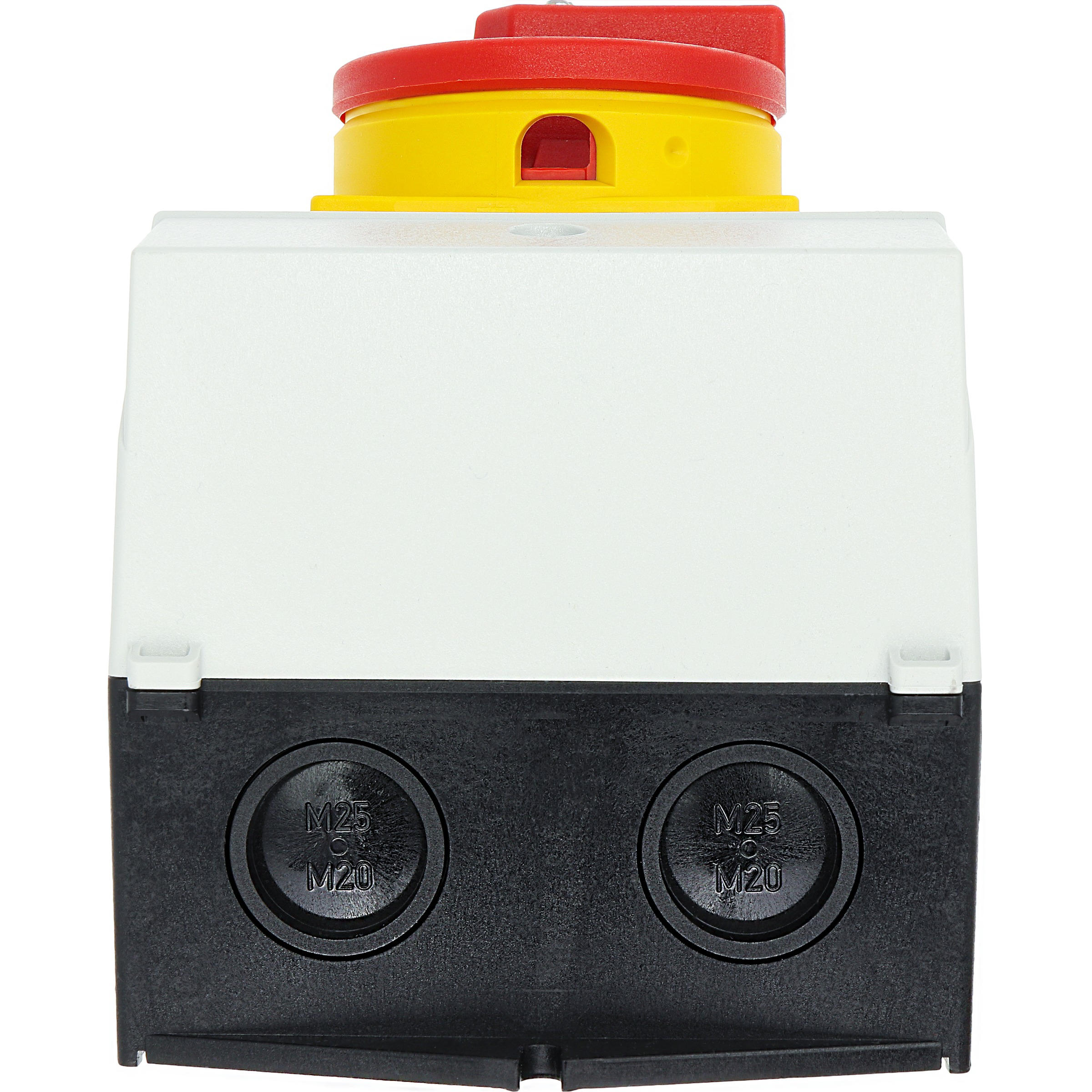 T0-2-15679/I2H/MBS/SVB Rozłącznik główny, 3 bieg.+1NO, 20A, funkcja awaryjnego zatrzymania, blok. na kłódkę w pozycji Wył., 90°, w obudowie ze szkła utwardzanego, z płytą ekranującą MBS, pokrętło czerwono-żółte z blokadą na kłódkę