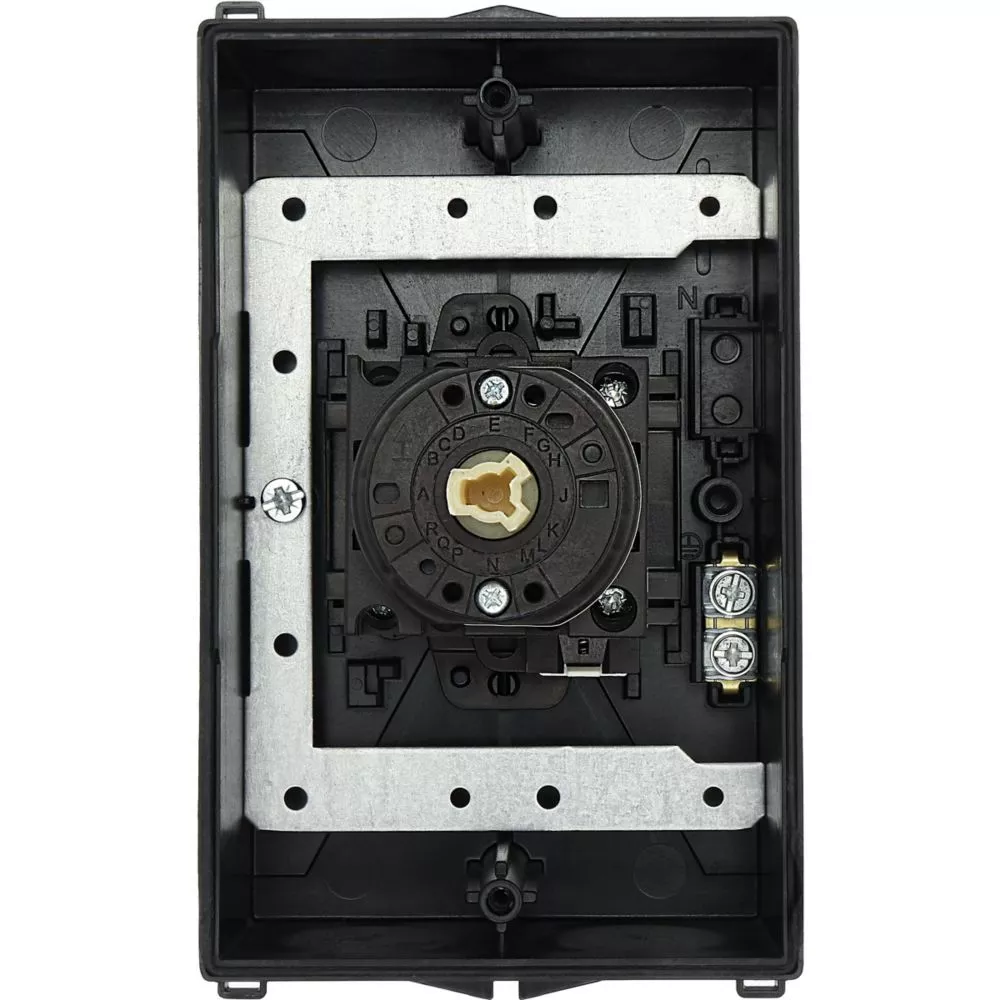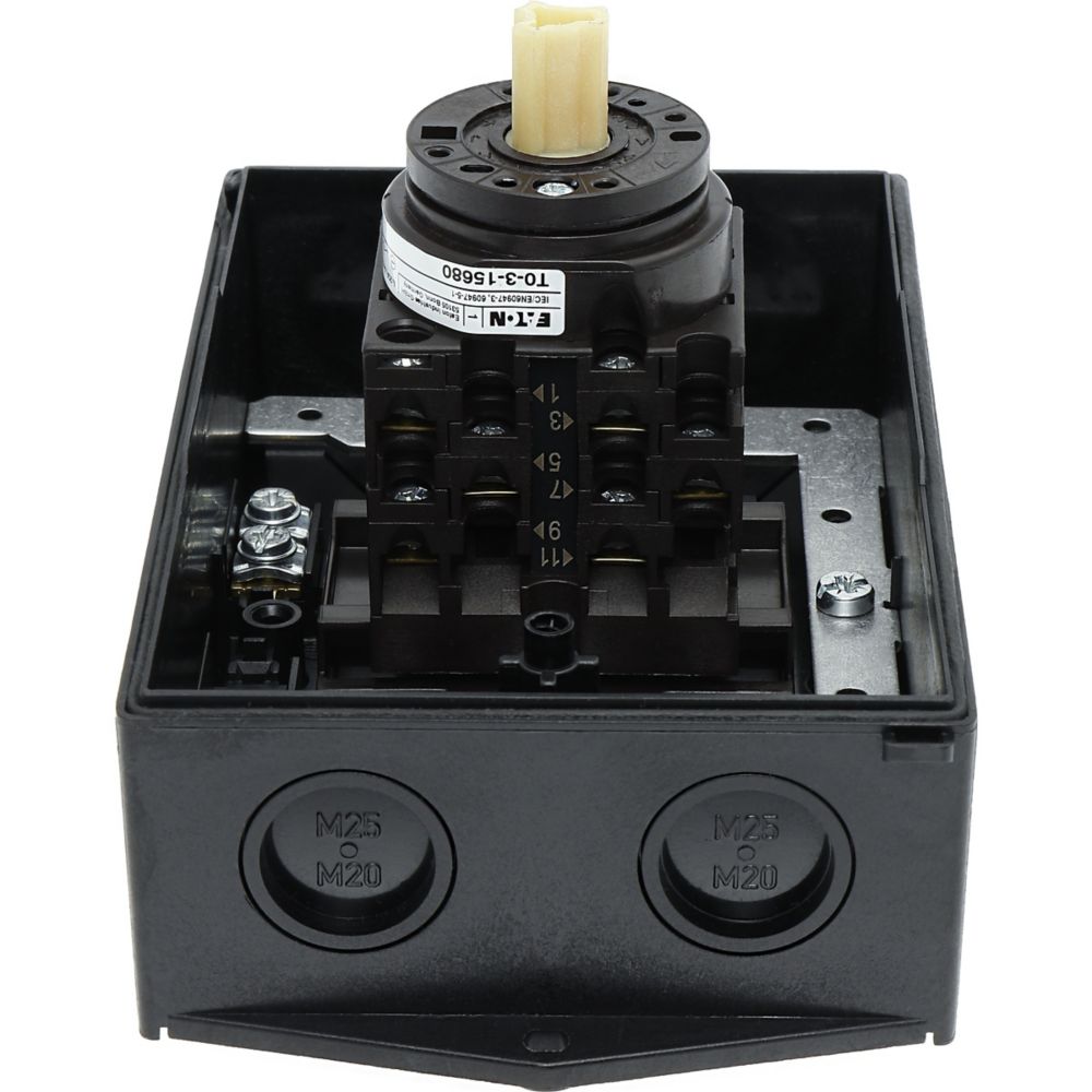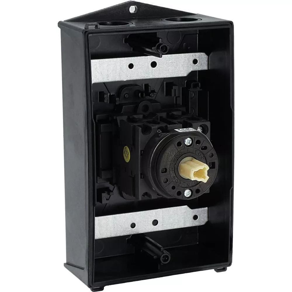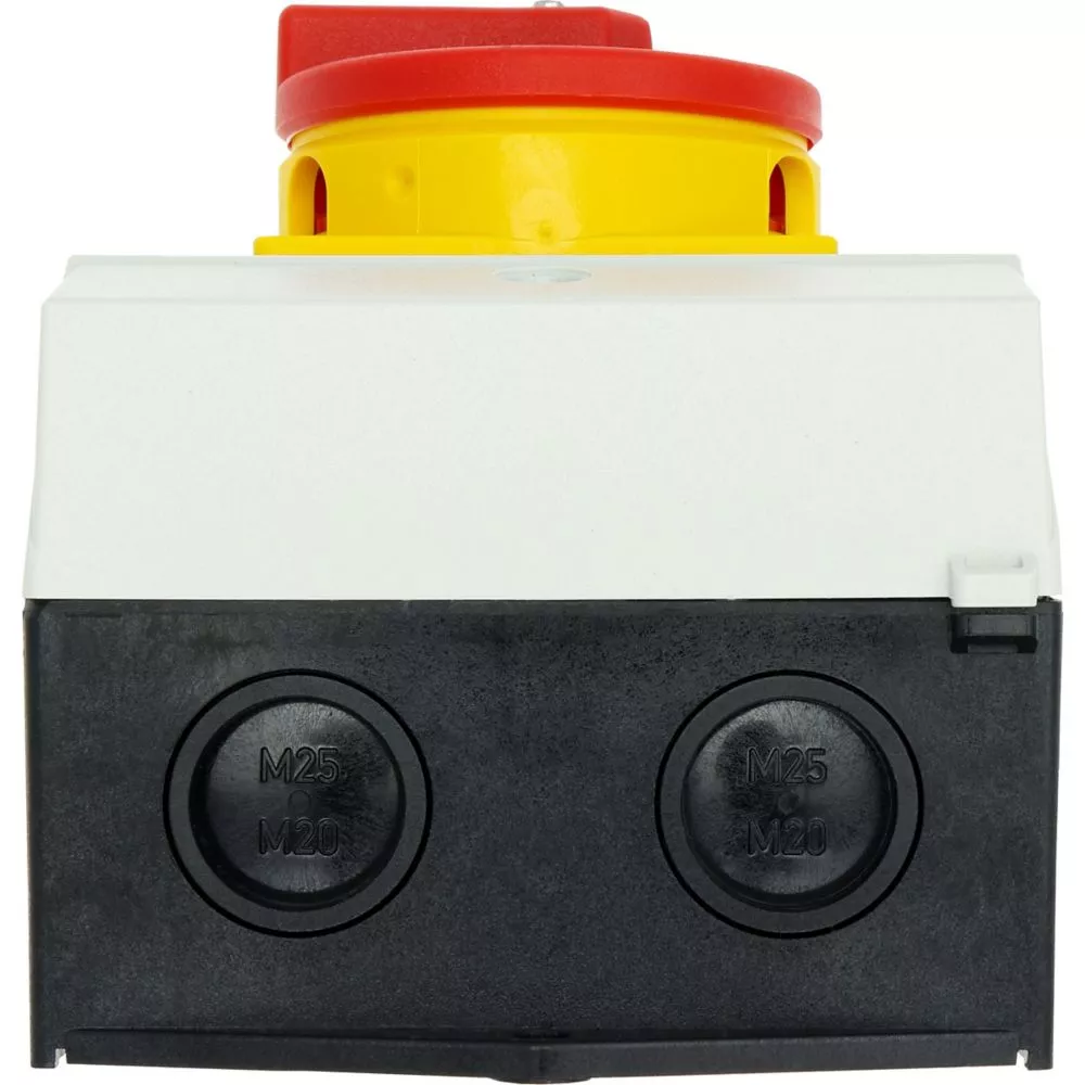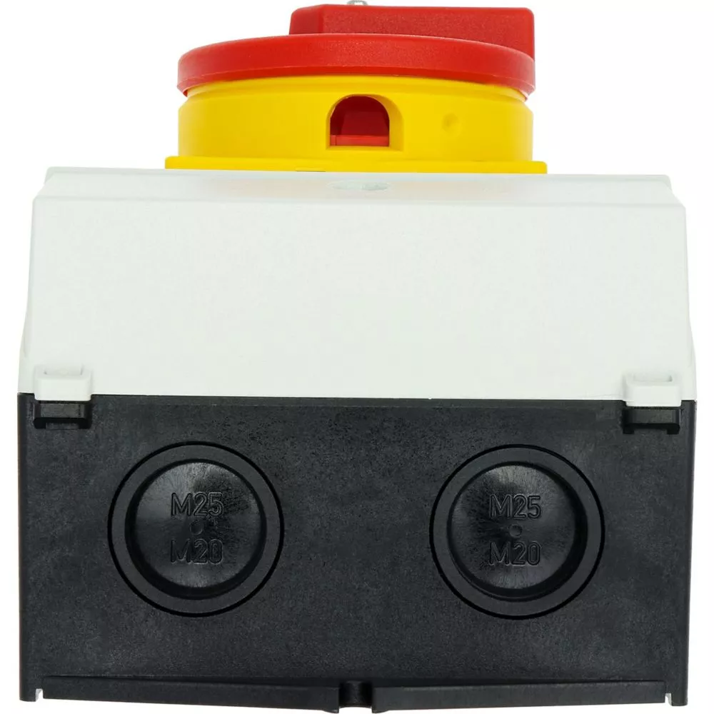Wyłącznik główny, Zacisk śrubowy: Wyłącznik główny, wyłącznik serwisowy, Wyłącznik naprawczy, Odniesienie grupy części T0, Funkcja zatrzymania: Funkcja wyłączania awaryjnego, z czerwonym uchwytem obrotowym i żółtym pierścieniem blokującym, Uwagi: wersja z otworami do wyłamywania, z arkuszem poglądowym montażu, 3-biegunowy + N, Element blokujący: Możliwość zablokowania w położeniu 0 (Wył.), Stopień ochrony: IP65, Projekt: montaż powierzchniowy, Kąt przełączania: 90°, Moc znamionowa AC-23A, 50 - 60 Hz 400 V: P = 5,5 kW, Znamionowy prąd ciągły: Iu = 20 A, 3 zespoł montażowy, Normy: IEC/EN 60947, VDE 0660, IEC/EN 60204, Rozłącznik izolacyjny zgodnie z normą IEC/EN 60947-3