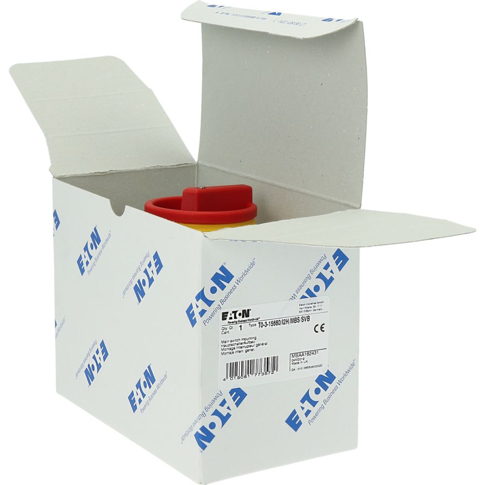 T0-3-15680/I2H/MBS/SVB Rozłącznik główny, 3 bieg.+N+1NO+1NC, 20A, funkcja awaryjnego zatrzymania, blok. na kłódkę w pozycji Wył., 90°, w obudowie ze szkła utwardzanego, z płytą ekranującą MBS, pokrętło czerwono-żółte z blokadą na kłódkę