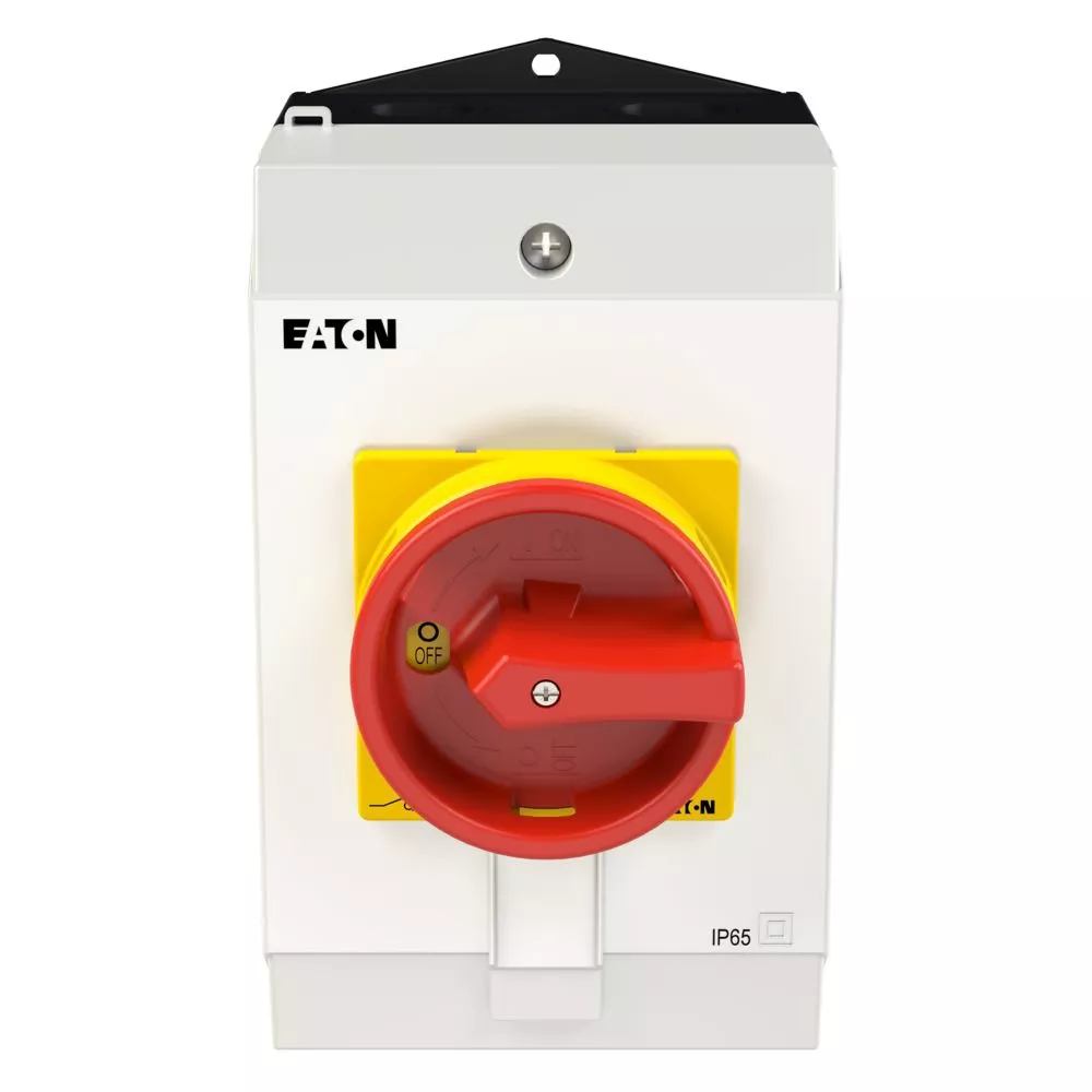 Wyłącznik główny, Zacisk śrubowy: Wyłącznik główny, wyłącznik serwisowy, Wyłącznik naprawczy, Odniesienie grupy części T0, Funkcja zatrzymania: Funkcja wyłączania awaryjnego, z czerwonym uchwytem obrotowym i żółtym pierścieniem blokującym, Uwagi: wersja z otworami do wyłamywania, z arkuszem poglądowym montażu, 3-biegunowy, Element blokujący: Możliwość zablokowania w położeniu 0 (Wył.), Stopień ochrony: IP65, Projekt: montaż powierzchniowy, Kąt przełączania: 90°, Moc znamionowa AC-23A, 50 - 60 Hz 400 V: P = 5,5 kW, Znamionowy prąd ciągły: Iu = 20 A, 3 zespoł montażowy, Normy: IEC/EN 60947, VDE 0660, IEC/EN 60204, Rozłącznik izolacyjny zgodnie z normą IEC/EN 60947-3