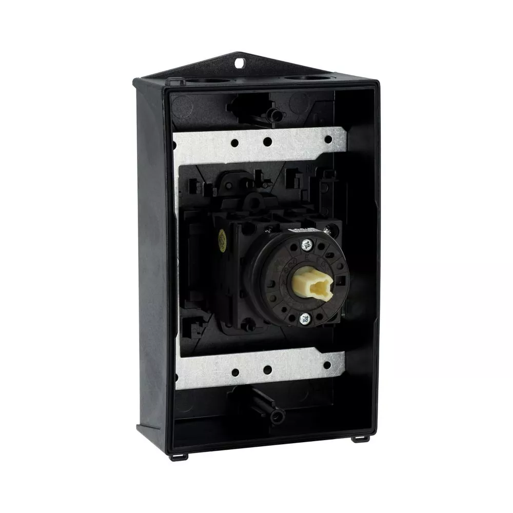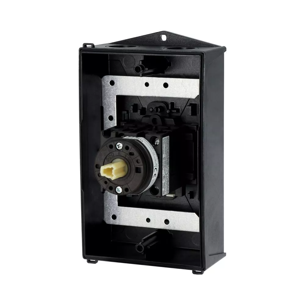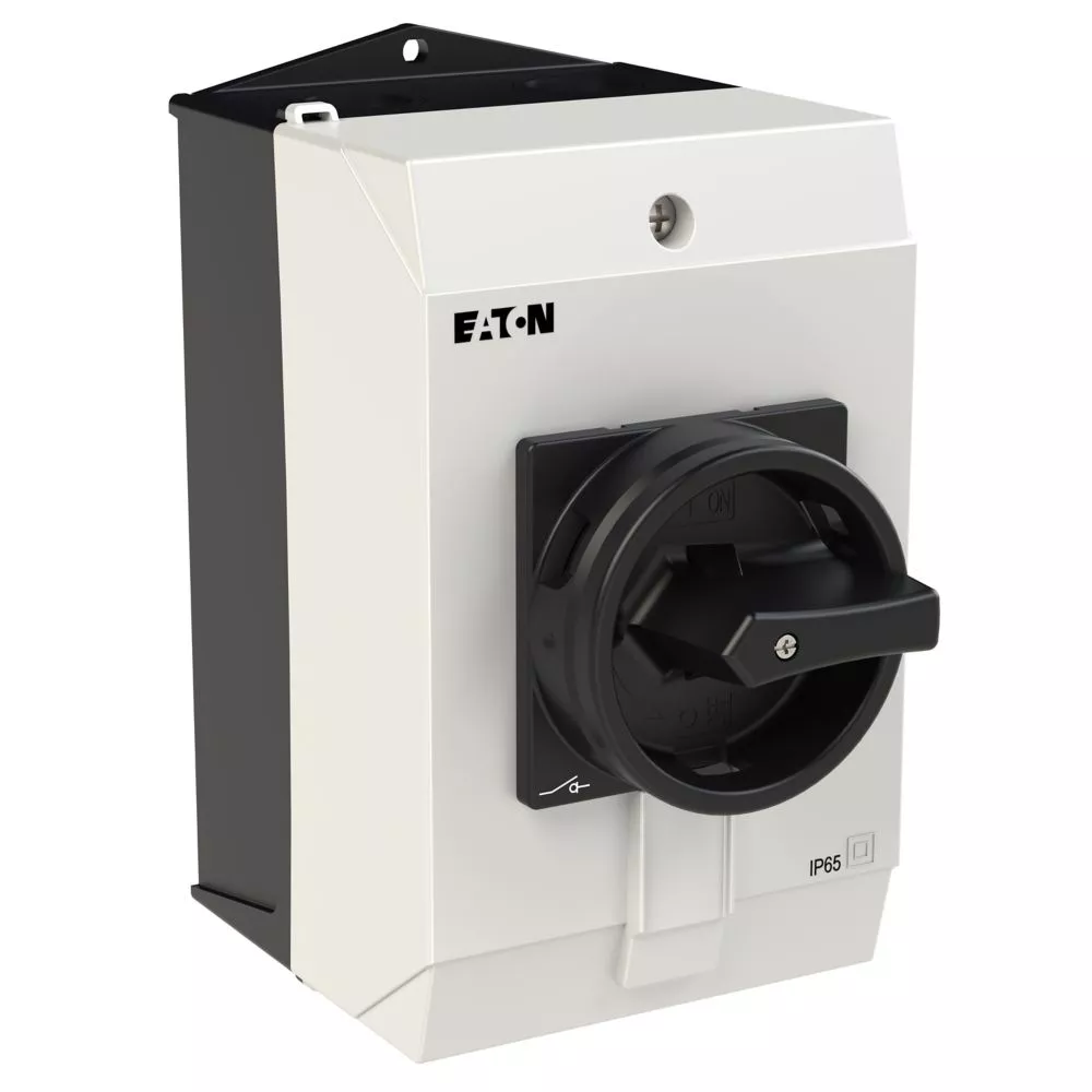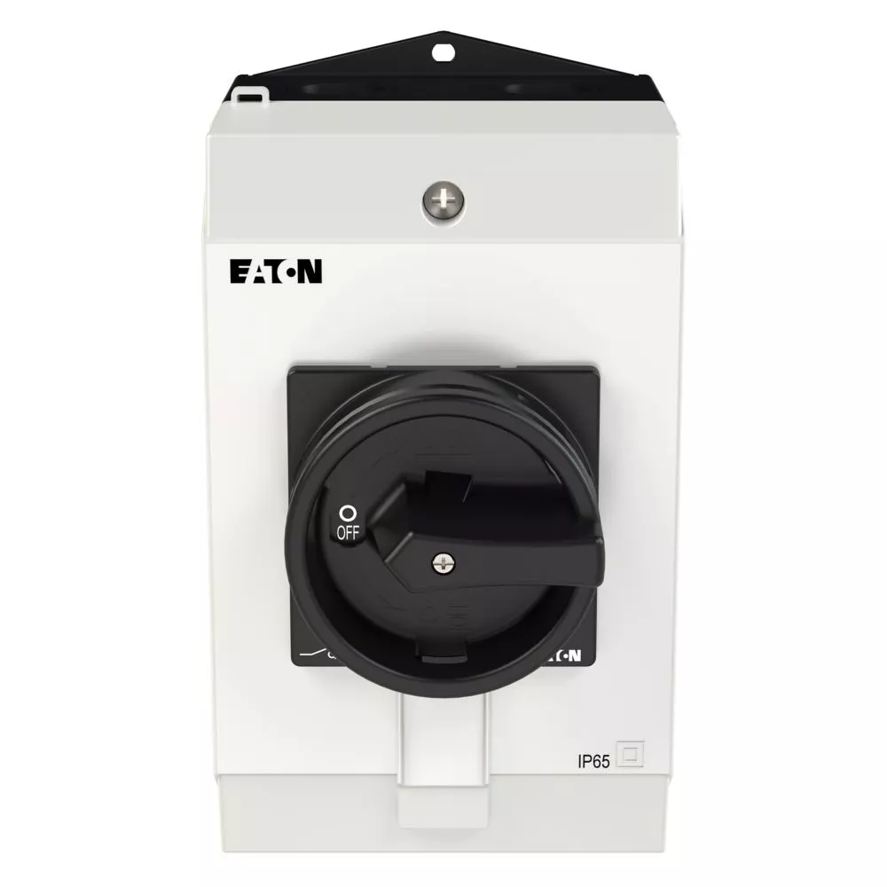 Wyłącznik główny, Zacisk śrubowy: Wyłącznik główny, wyłącznik serwisowy, Wyłącznik naprawczy, Odniesienie grupy części T0, Funkcja zatrzymania: Funkcja STOP, Z czarnym uchwytem obrotowym i pierścieniem blokującym, Uwagi: wersja z otworami do wyłamywania, z arkuszem poglądowym montażu, 3-biegunowy, Element blokujący: Możliwość zablokowania w położeniu 0 (Wył.), Stopień ochrony: IP65, Projekt: montaż powierzchniowy, Kąt przełączania: 90°, Moc znamionowa AC-23A, 50 - 60 Hz 400 V: P = 5,5 kW, Znamionowy prąd ciągły: Iu = 20 A, 3 zespoł montażowy, Normy: IEC/EN 60947, VDE 0660, IEC/EN 60204, Rozłącznik izolacyjny zgodnie z normą IEC/EN 60947-3