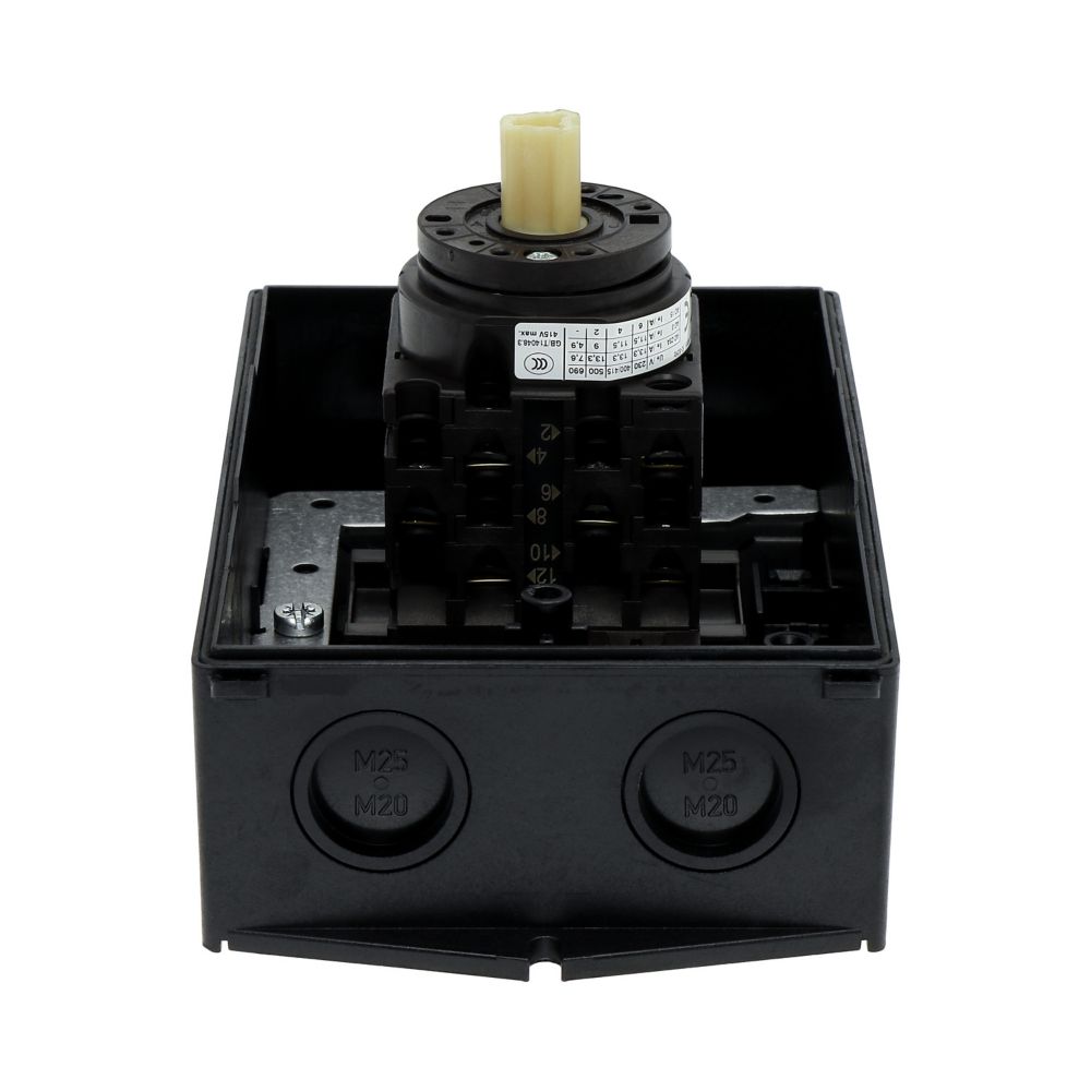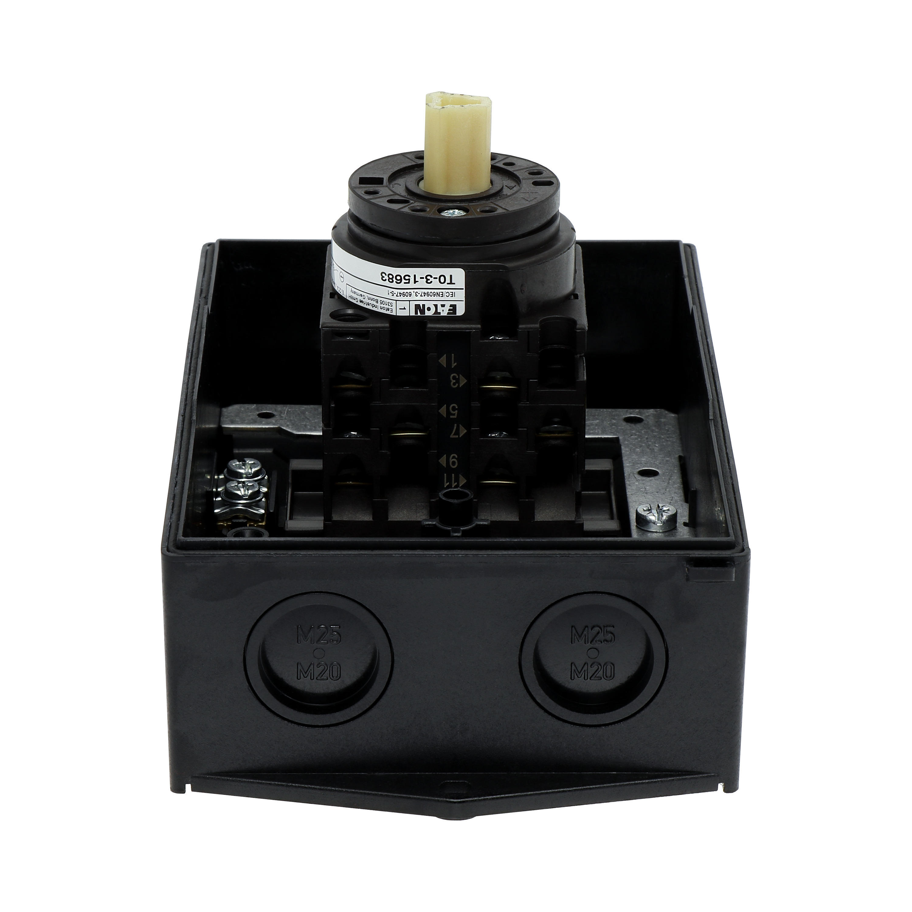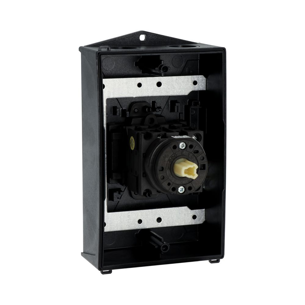 Wyłącznik główny, Zacisk śrubowy: Wyłącznik główny, wyłącznik serwisowy, Wyłącznik naprawczy, Odniesienie grupy części T0, Funkcja zatrzymania: Funkcja STOP, Z czarnym uchwytem obrotowym i pierścieniem blokującym, Uwagi: wersja z otworami do wyłamywania, z arkuszem poglądowym montażu, 3-biegunowy, Element blokujący: Możliwość zablokowania w położeniu 0 (Wył.), Stopień ochrony: IP65, Projekt: montaż powierzchniowy, Kąt przełączania: 90°, Moc znamionowa AC-23A, 50 - 60 Hz 400 V: P = 5,5 kW, Znamionowy prąd ciągły: Iu = 20 A, 3 zespoł montażowy, Normy: IEC/EN 60947, VDE 0660, IEC/EN 60204, Rozłącznik izolacyjny zgodnie z normą IEC/EN 60947-3