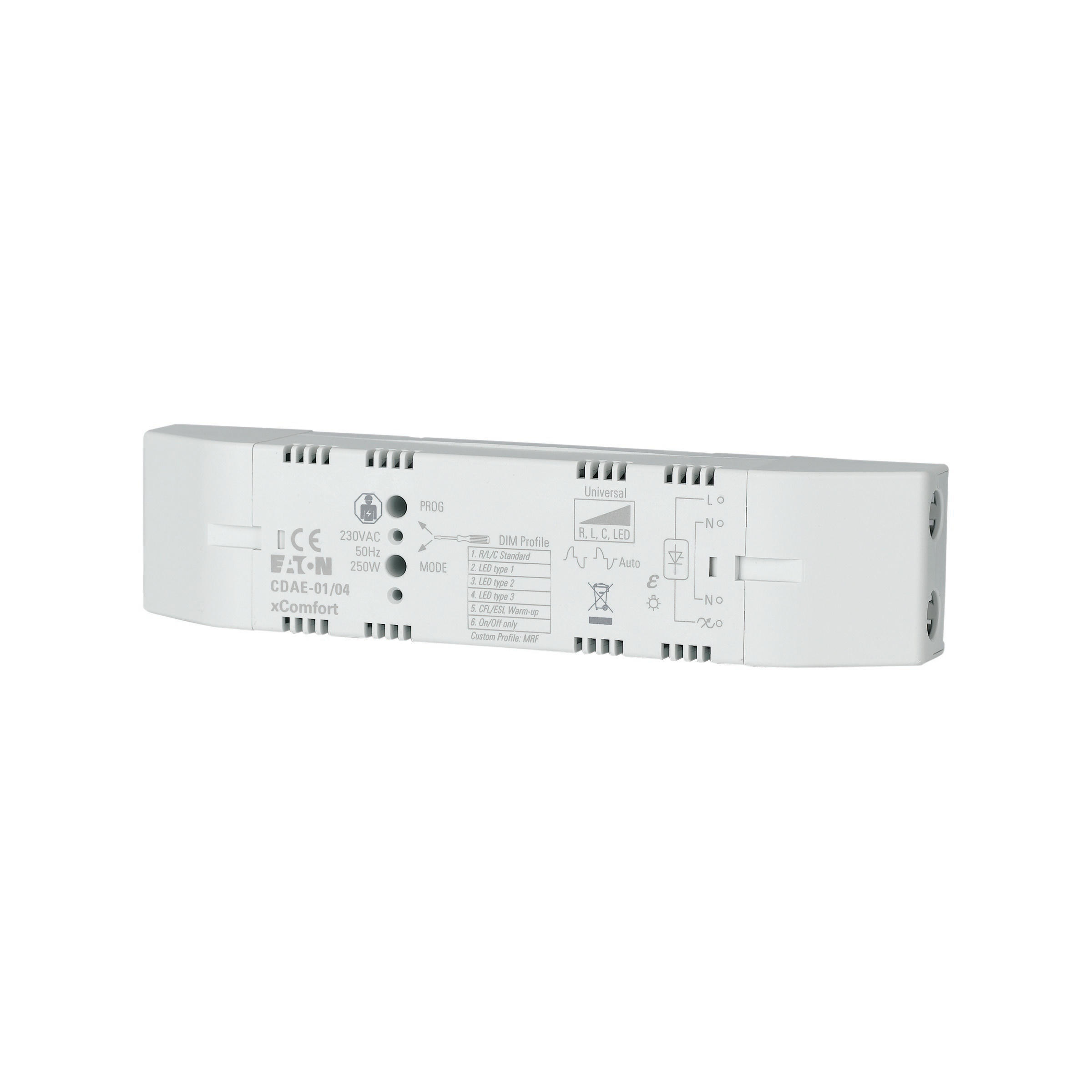Dimactor 0-250 W/230 VAC. Geschikt om verschillende belastingen te dimmen en/of te schakelen, waaronder dimbare en niet-dimbare leds (alleen aan/uit). Dimt zelfs de kleinste ledbelasting, vanaf 0 W! Eenvoudig een DIM-profiel selecteren of zelf definiëren voor de beste dimprestaties. Energie-efficiënt. Beveiligd tegen kortsluiting, overbelasting en te hoge temperaturen met automatisch herstel. Het apparaat kan worden geïnstalleerd in een inbouwdoos, boven het plafond of direct in het armatuur.