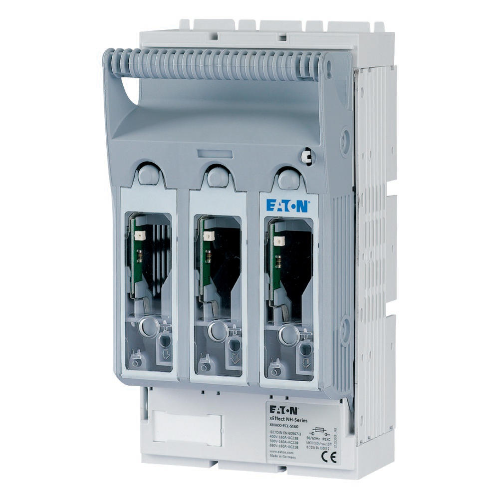 NH-Sicherungs-Lasttrennschalter 3-polig mit M8 Flachanschluss max. 95 mm²; Sammelschiene 60 mm; Sicherungsüberwachung Light mit LED; für Sicherungseinsätze NH000 und NH00; optional mit XNH-XLOCK und Vorhängeschloss abschließbar; Kabelanschluss oben/unten in Sekundenschnelle umbaubar.