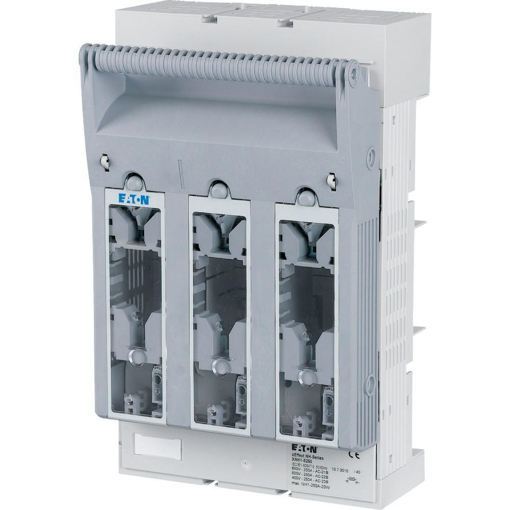 NH-Sicherungs-Lasttrennschalter 3-polig mit Flachanschluss M10 max. 150 mm²; Sammelschiene 60 mm; für Sicherungseinsätze NH1; optional mit XNH-XLOCK und Vorhängeschloss abschließbar; Kabelanschluss oben/unten in Sekundenschnelle umbaubar.